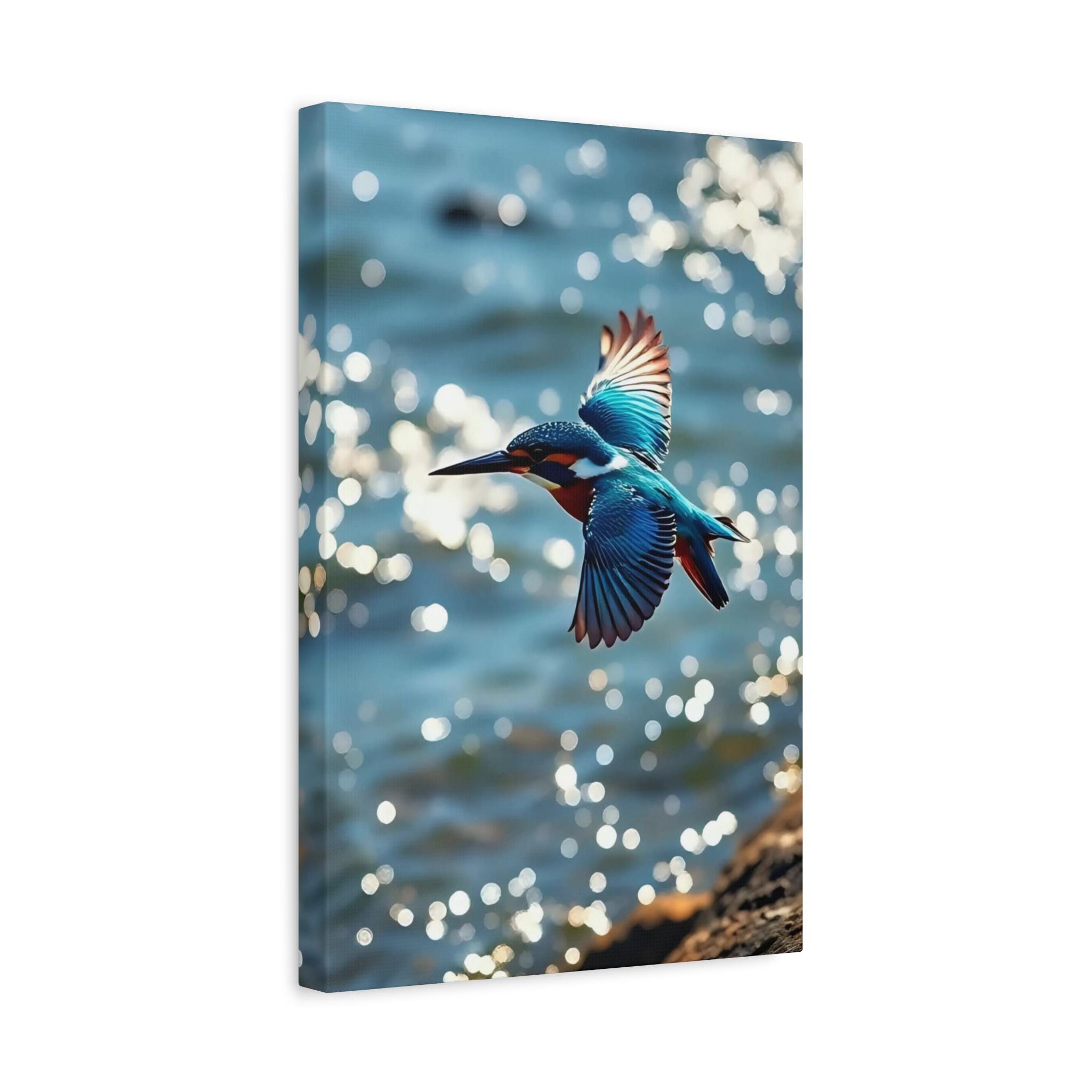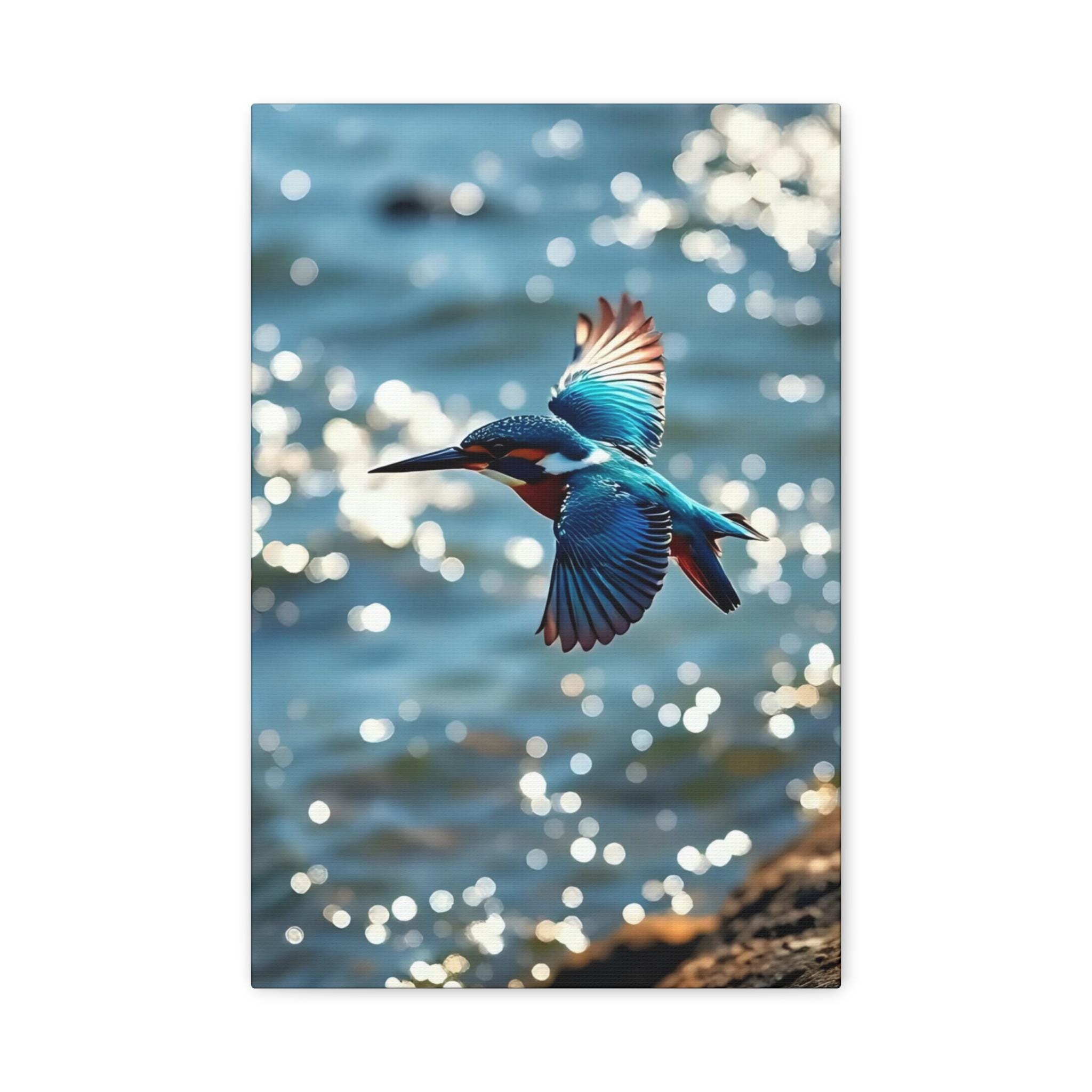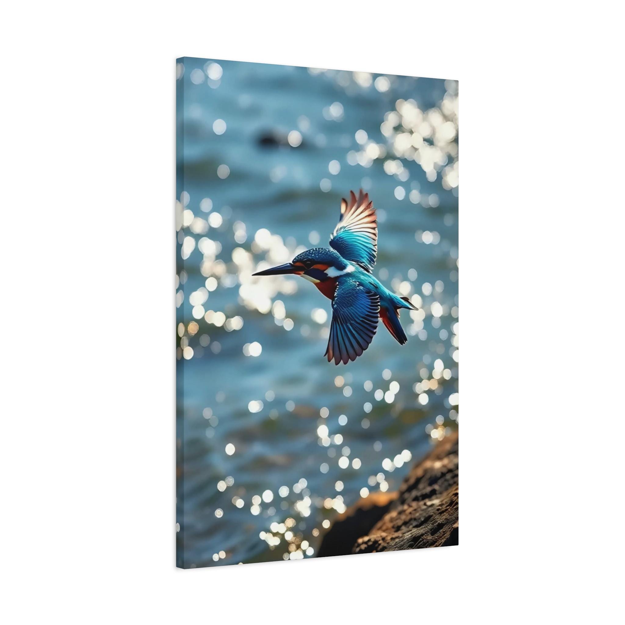 Bring a breath of fresh air into your home with this stunning Kingfisher in Flight canvas. Captured in a moment of pure grace, this vibrant artwork freezes the intense energy of a kingfisher soaring over water. Its rich turquoise blues and warm golden hues are designed to be a focal point in any room.