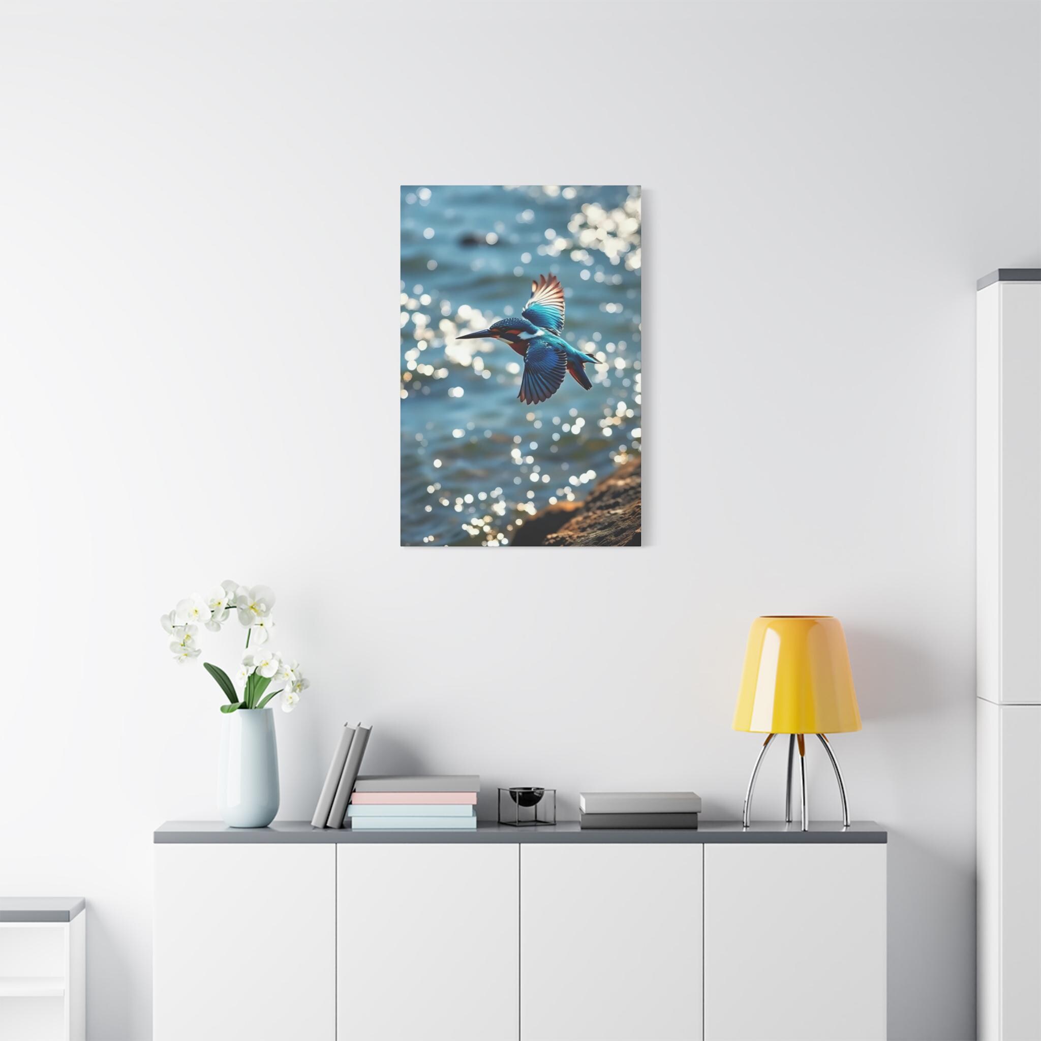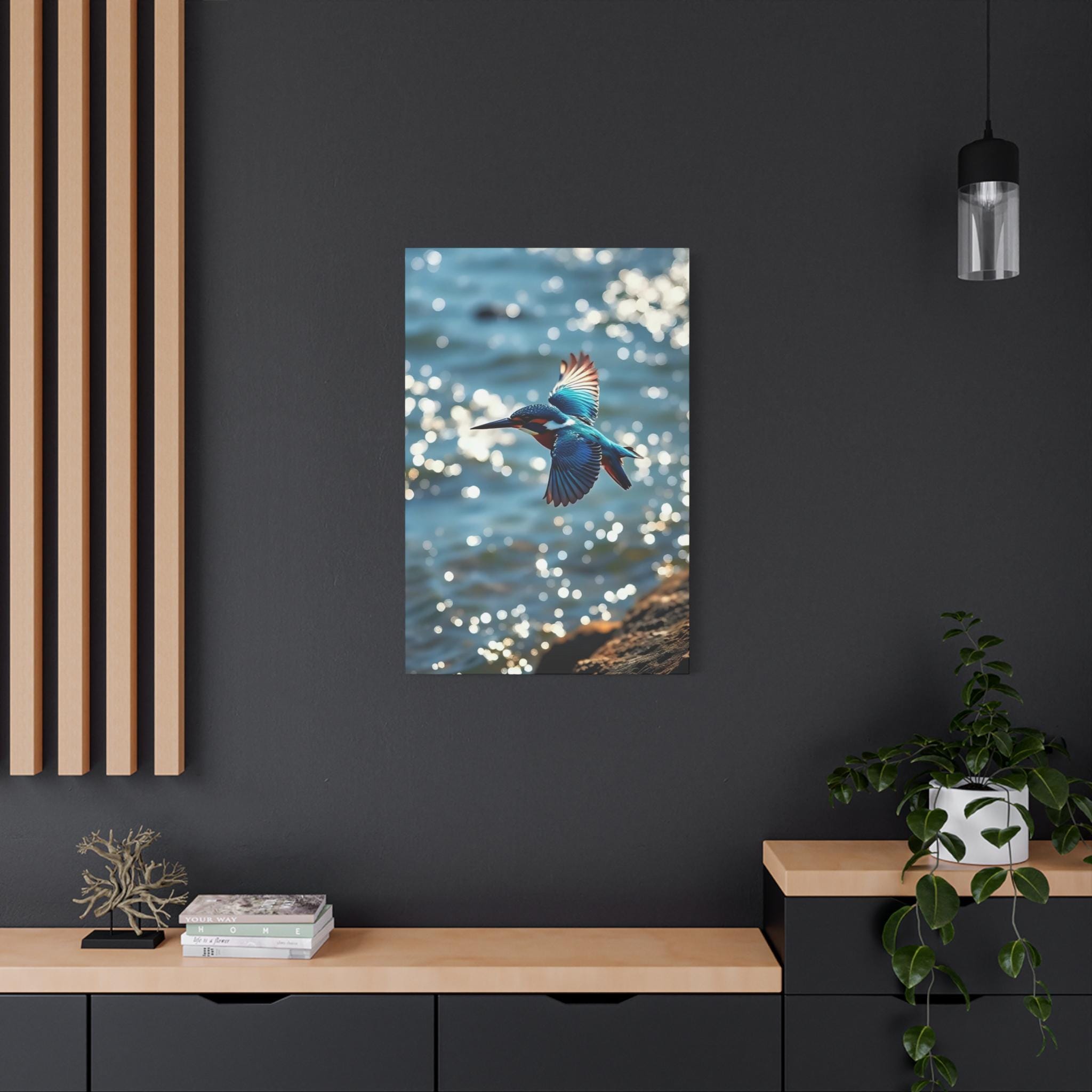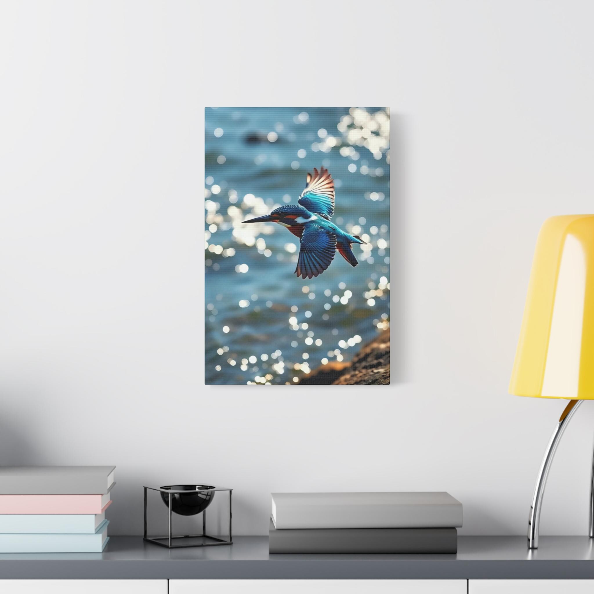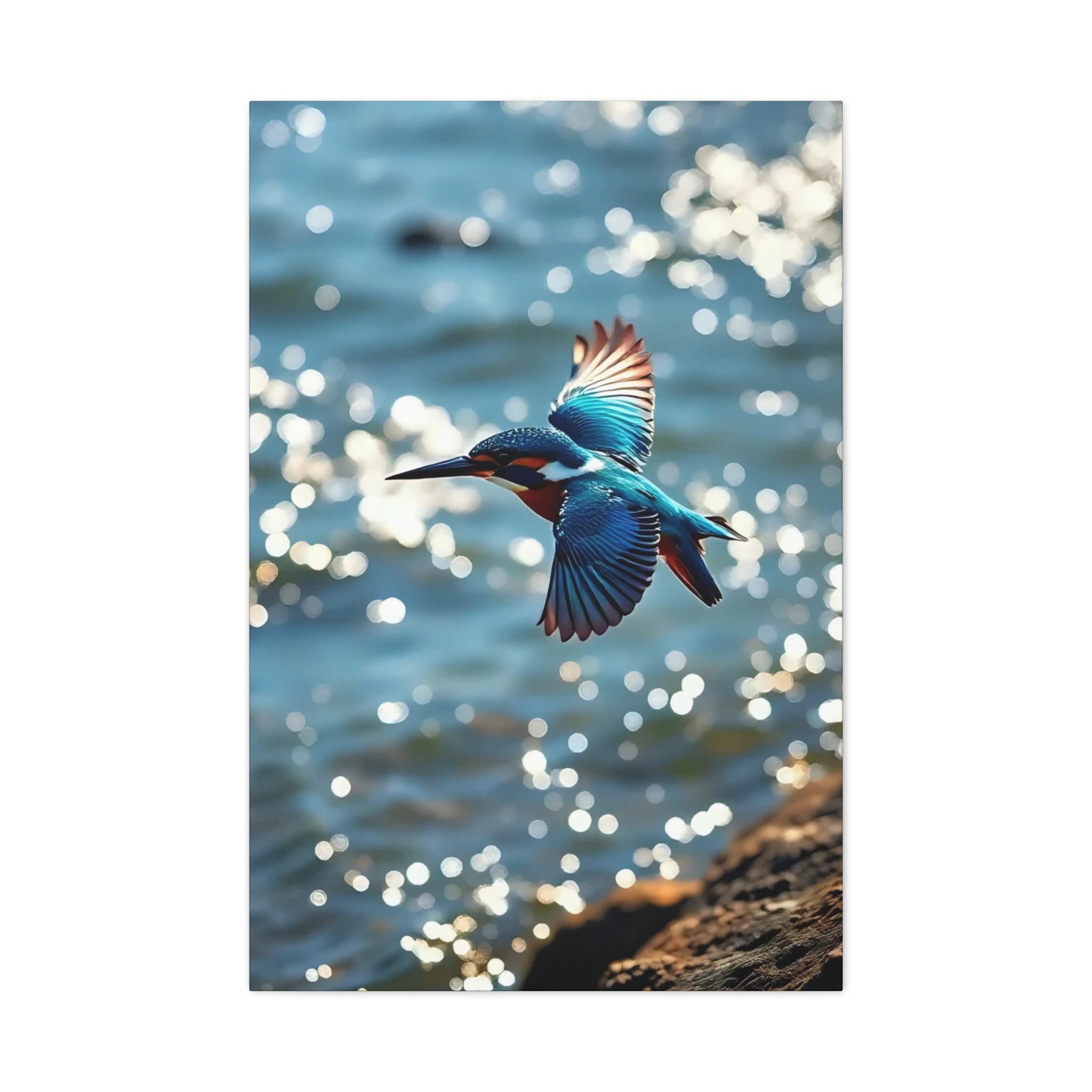 Bring a breath of fresh air into your home with this stunning Kingfisher in Flight canvas. Captured in a moment of pure grace, this vibrant artwork freezes the intense energy of a kingfisher soaring over water. Its rich turquoise blues and warm golden hues are designed to be a focal point in any room.
