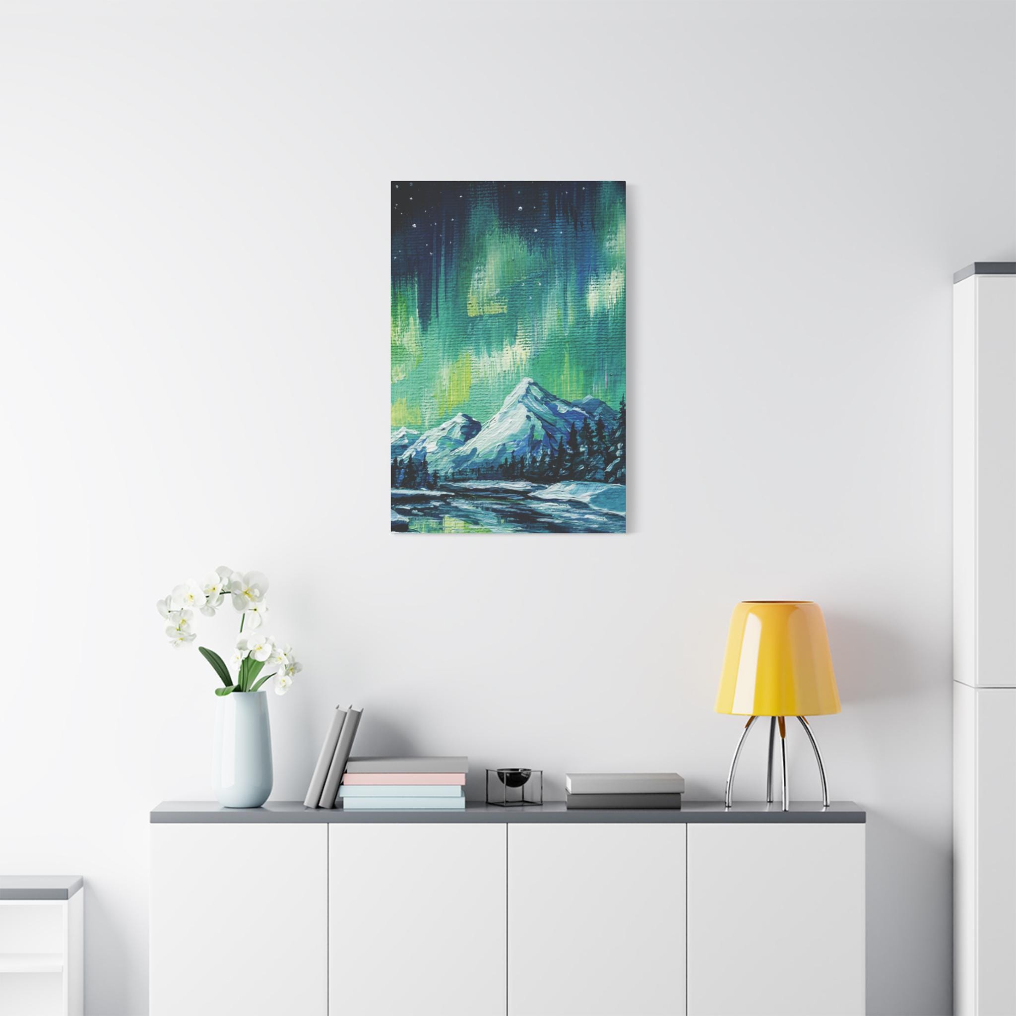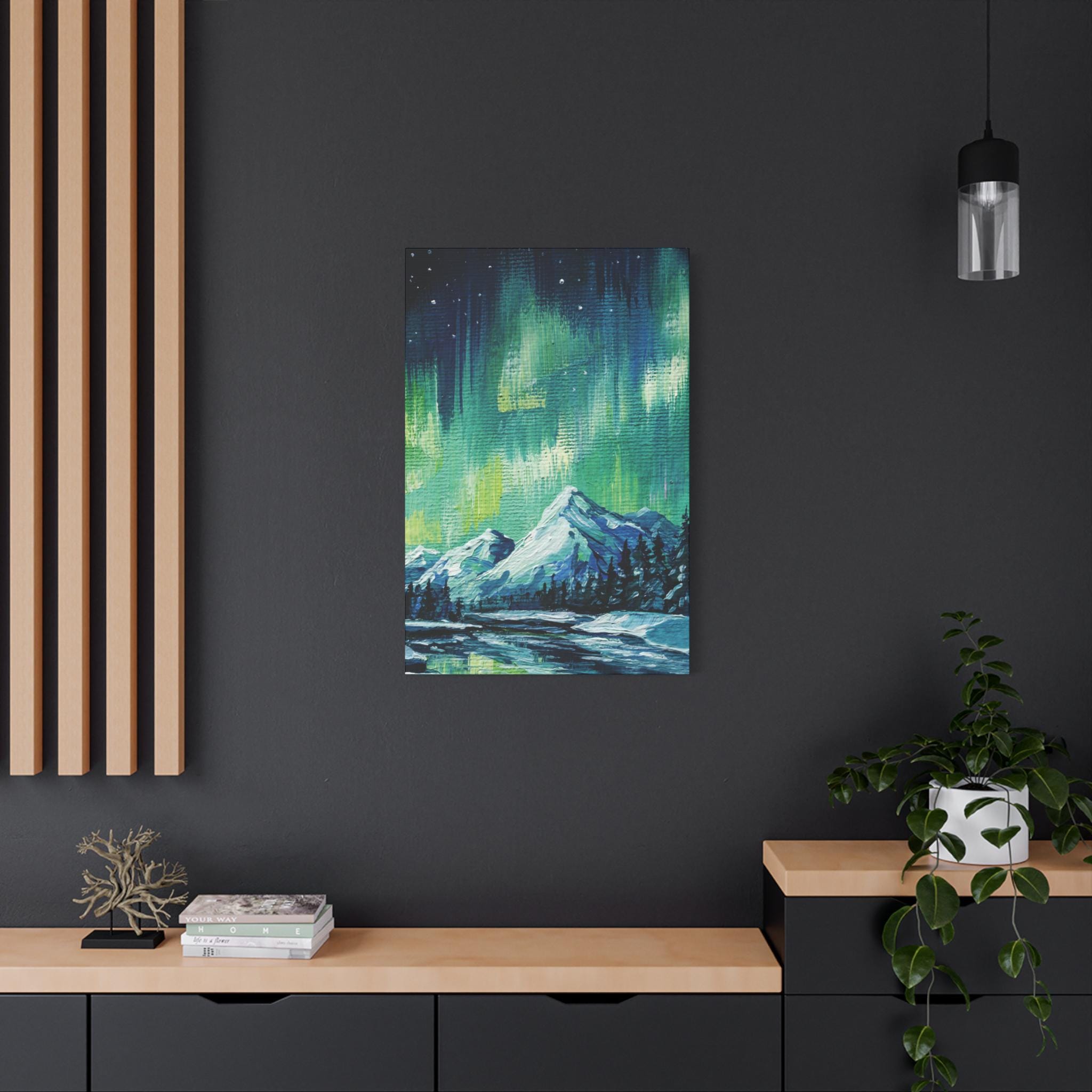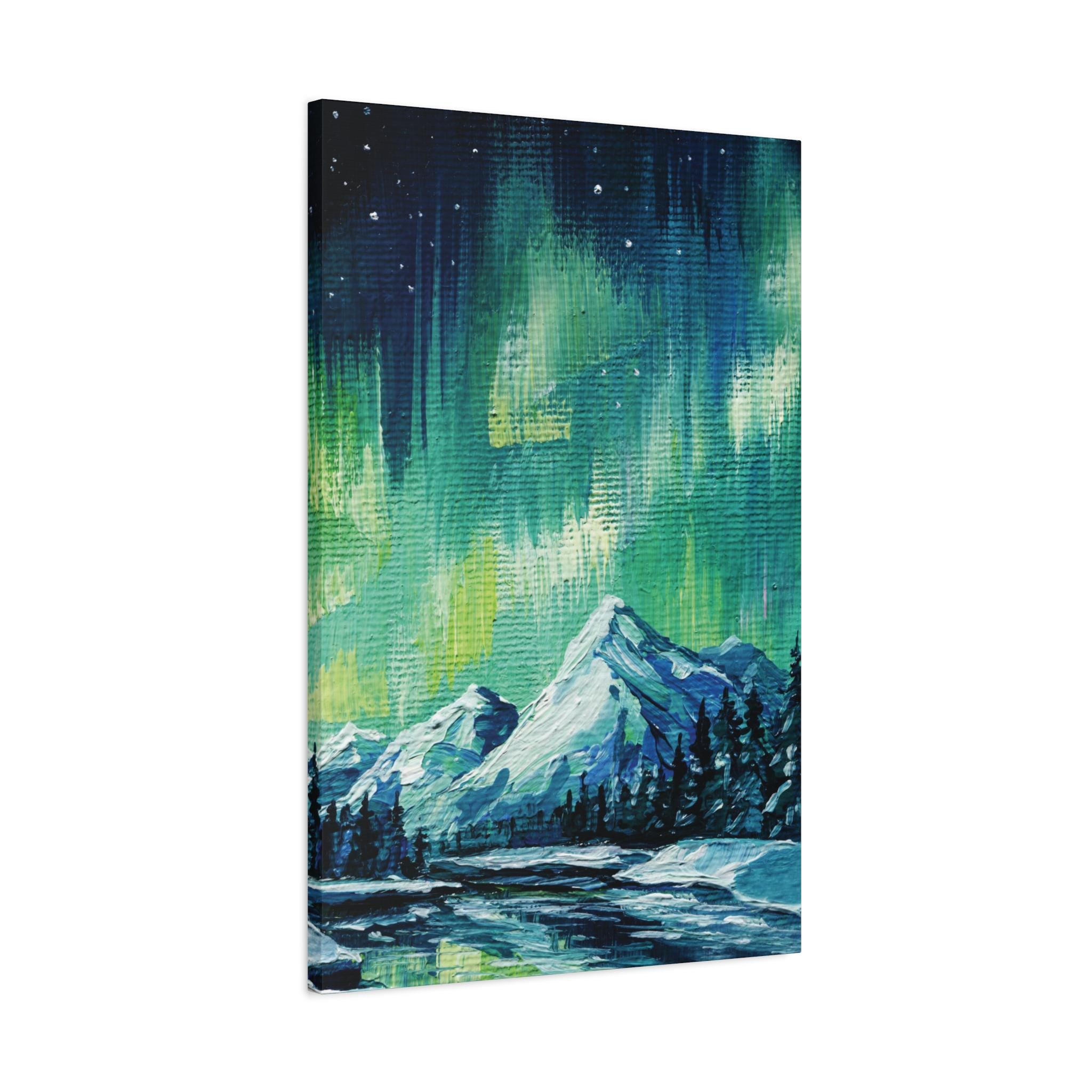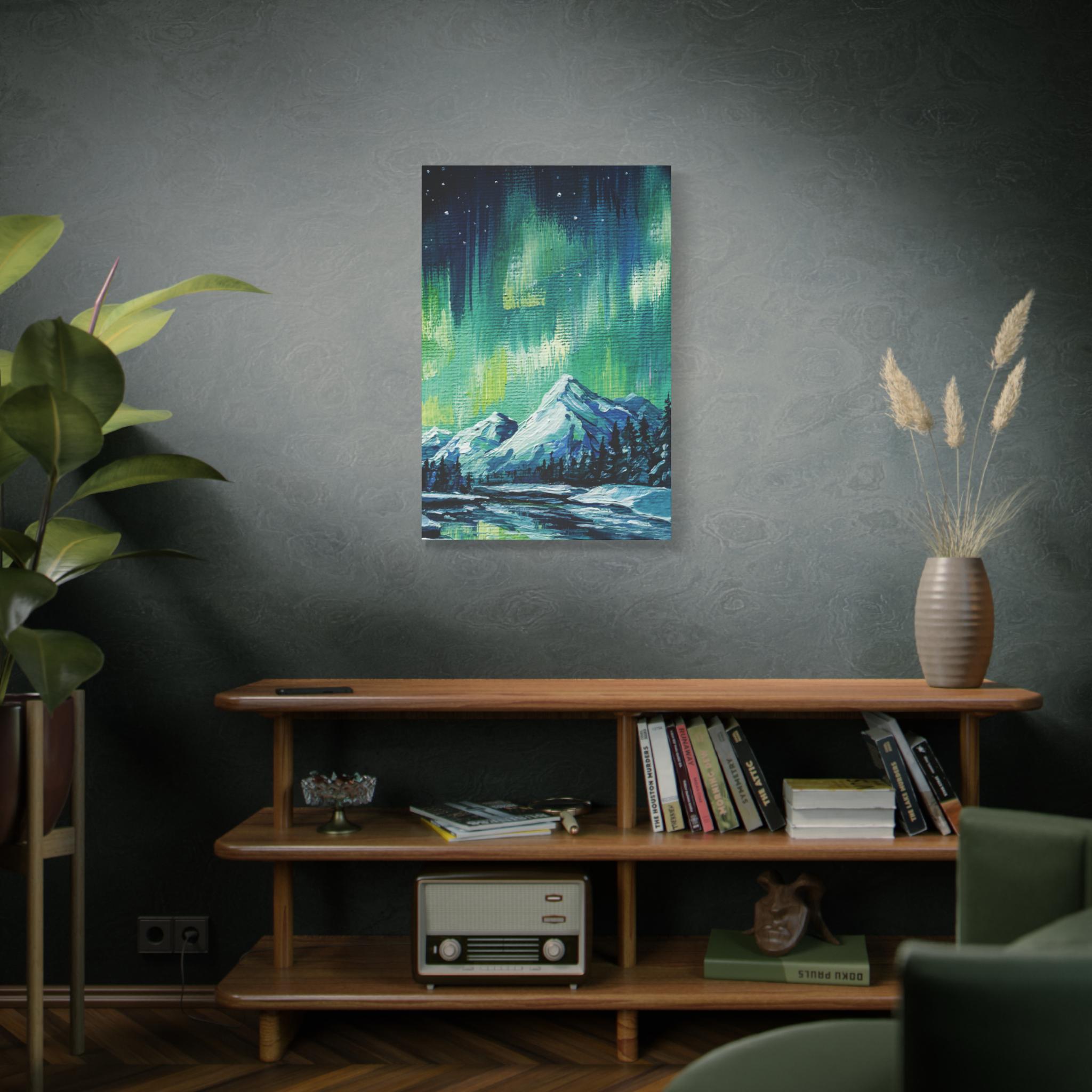 Transform your living space with the breathtaking beauty of the Northern Lights. This vibrant oil-style illustration captures the ethereal dance of the green aurora over snow-capped mountains and a silent winter forest. It’s not just a print; it’s a window into the serene wilderness of the North.