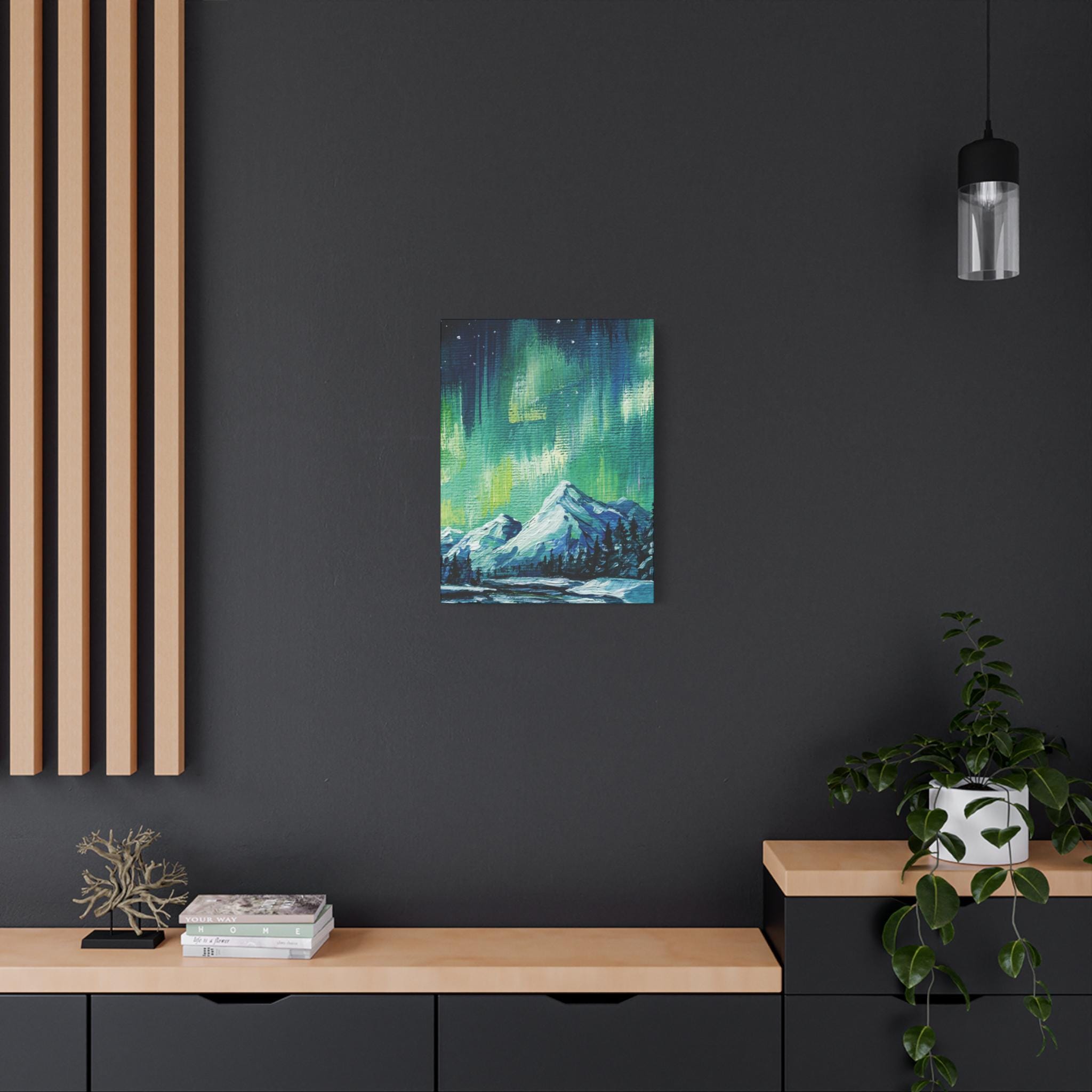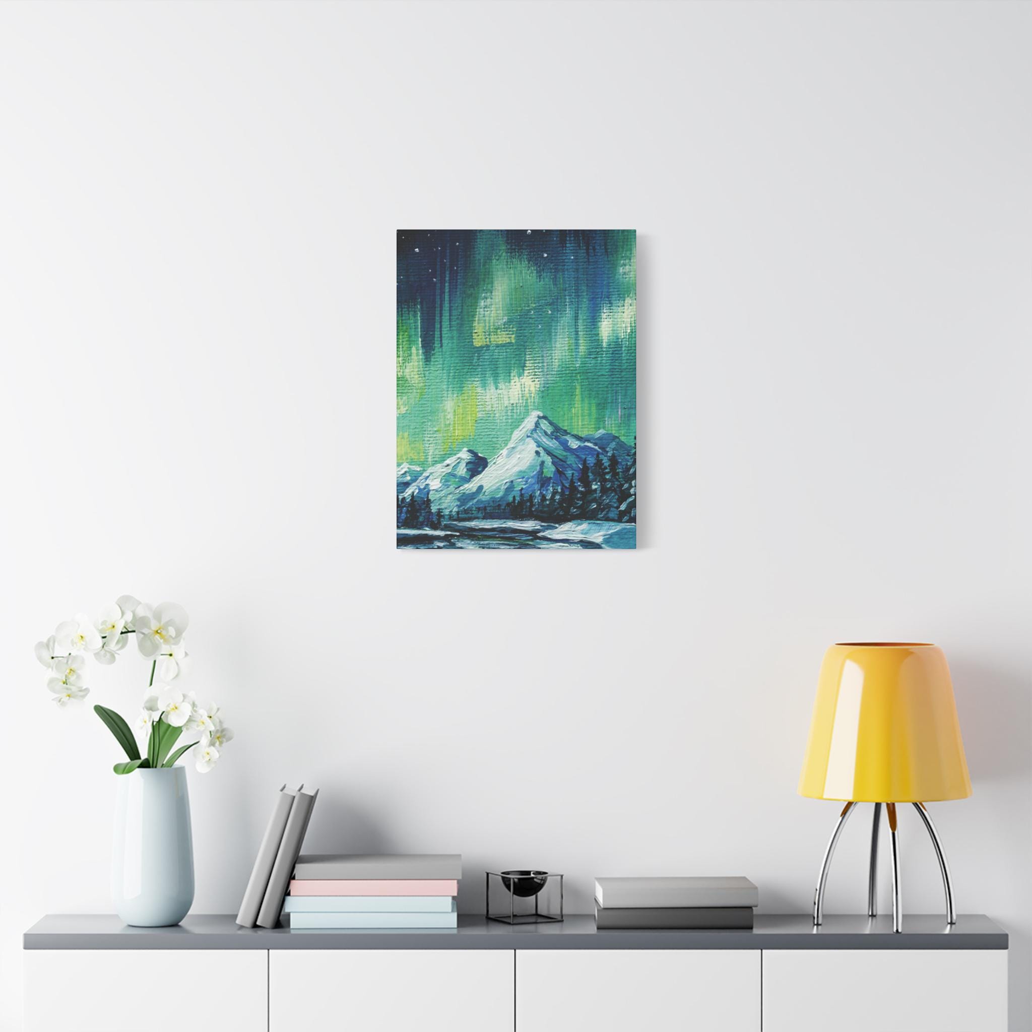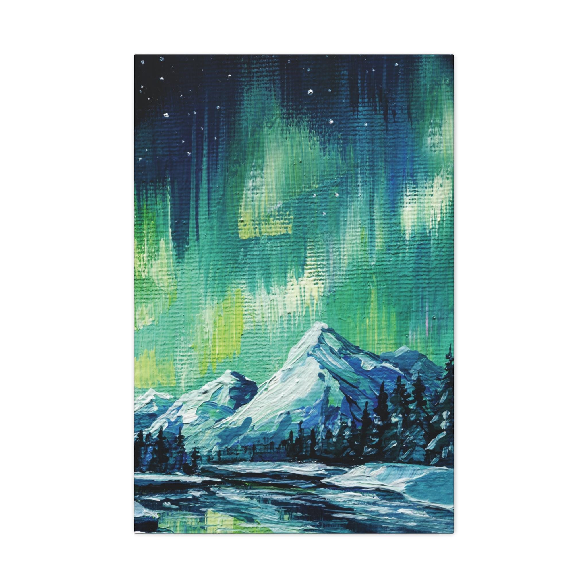 Transform your living space with the breathtaking beauty of the Northern Lights. This vibrant oil-style illustration captures the ethereal dance of the green aurora over snow-capped mountains and a silent winter forest. It’s not just a print; it’s a window into the serene wilderness of the North.