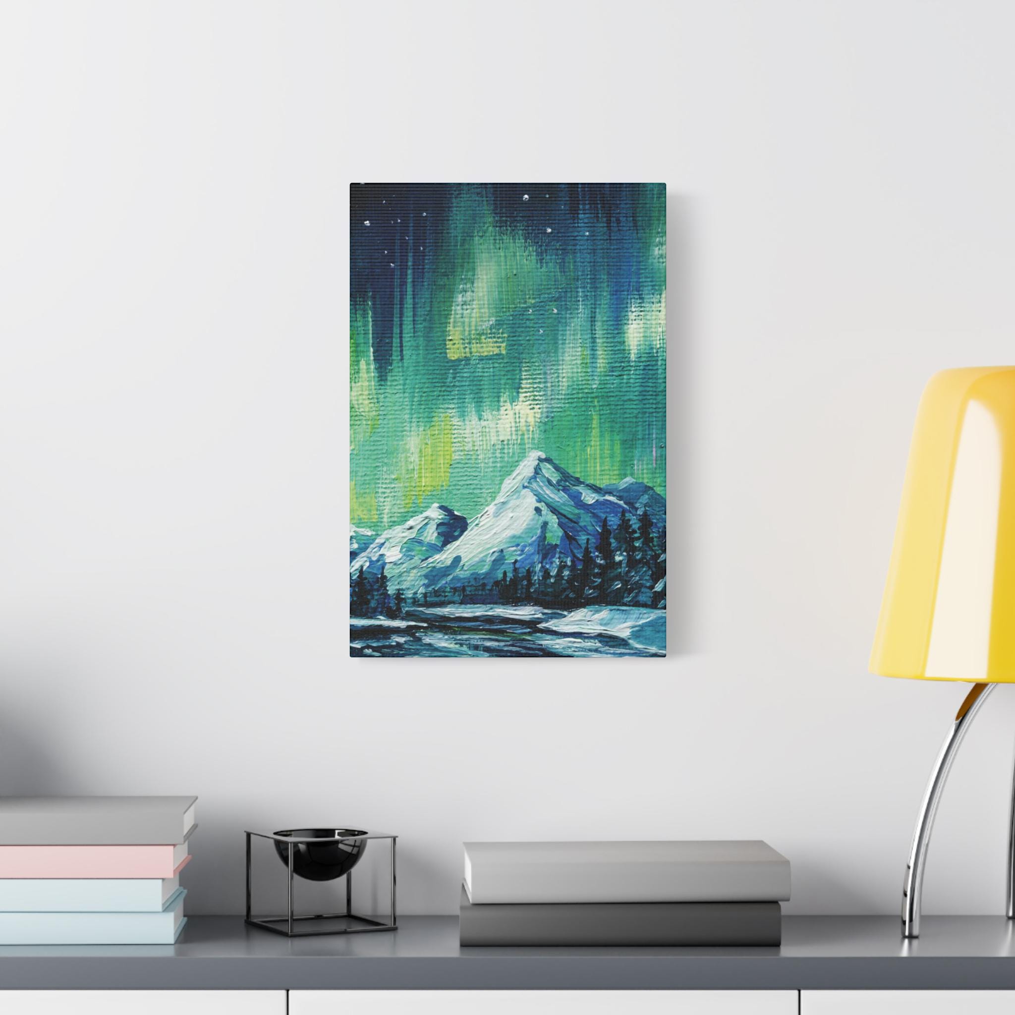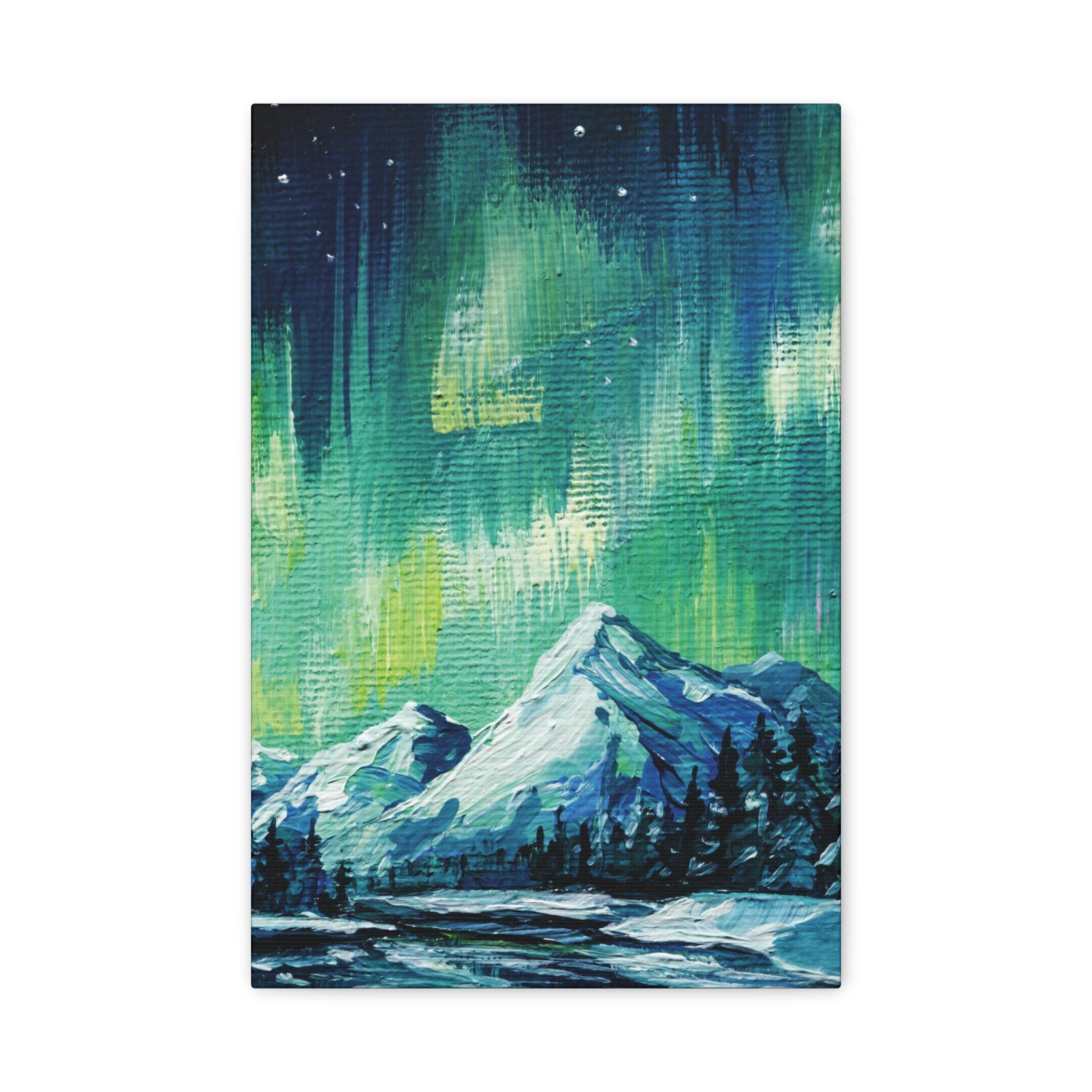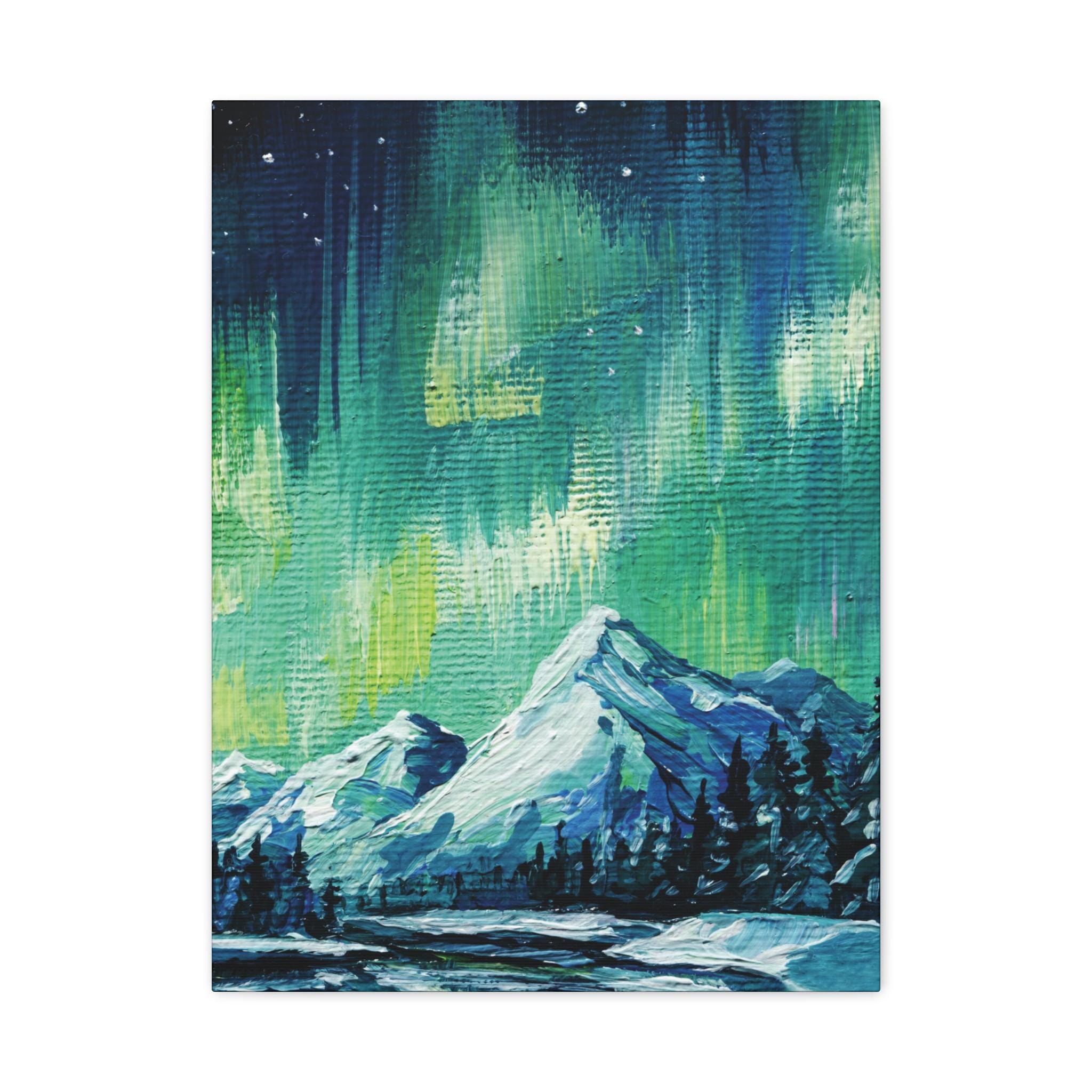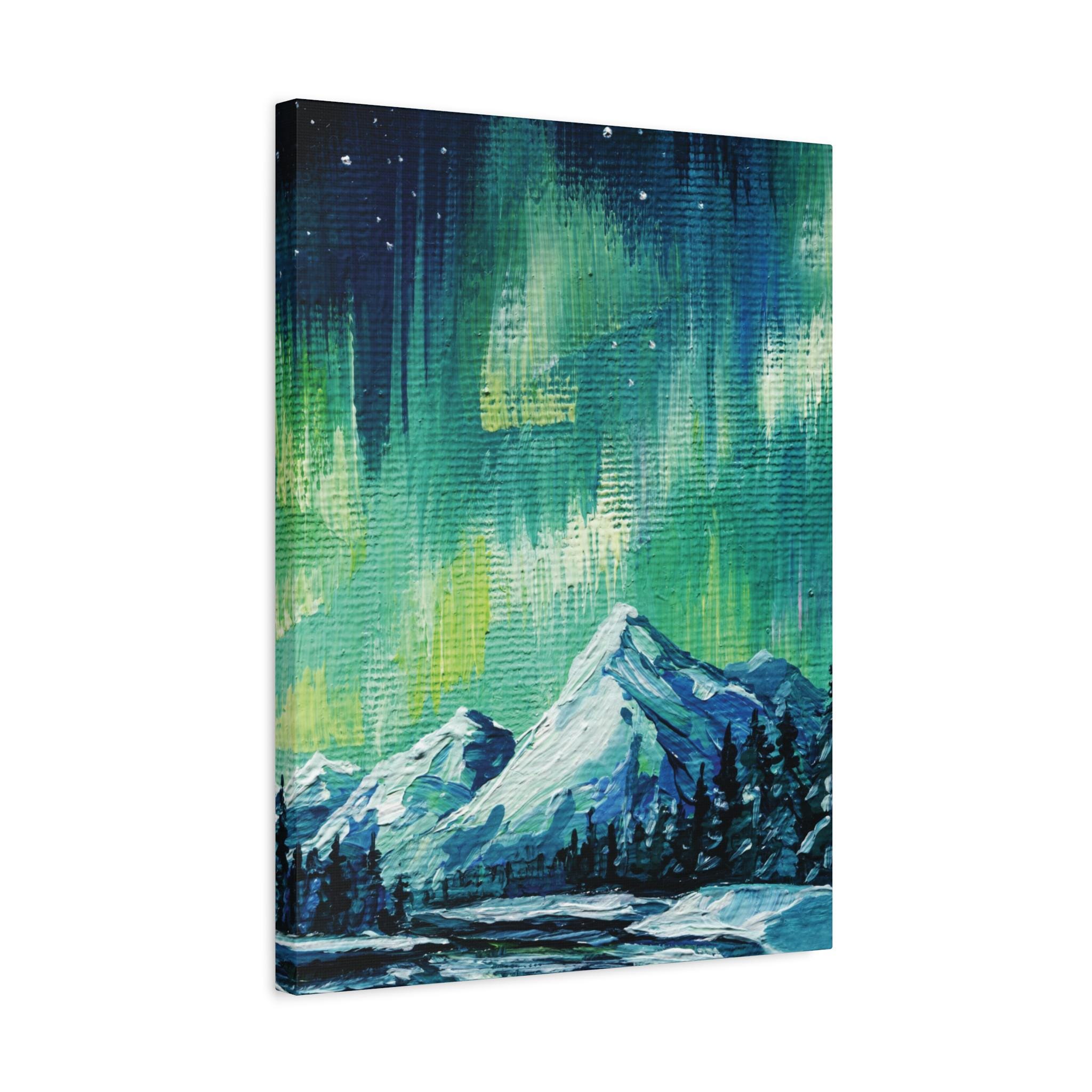 Transform your living space with the breathtaking beauty of the Northern Lights. This vibrant oil-style illustration captures the ethereal dance of the green aurora over snow-capped mountains and a silent winter forest. It’s not just a print; it’s a window into the serene wilderness of the North.