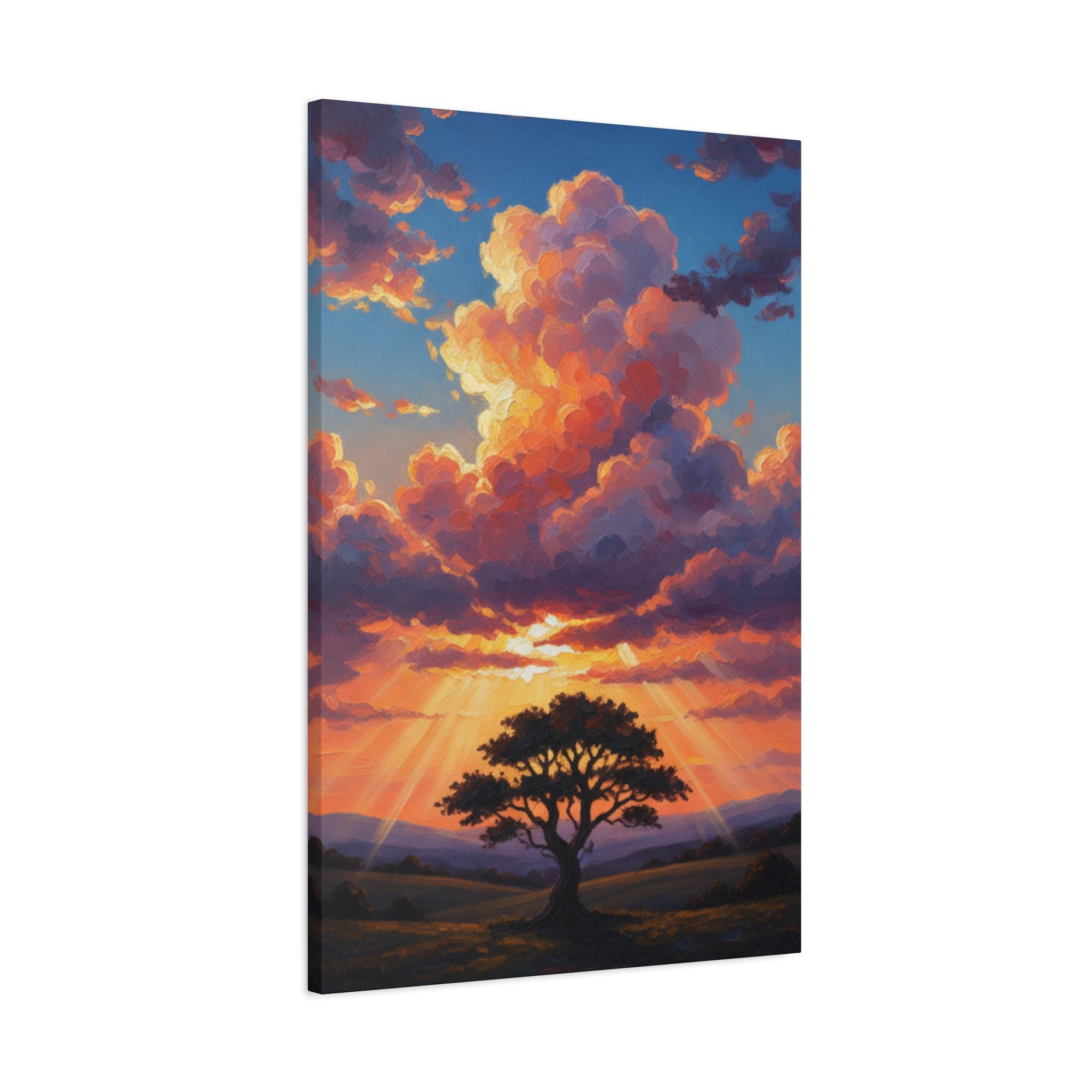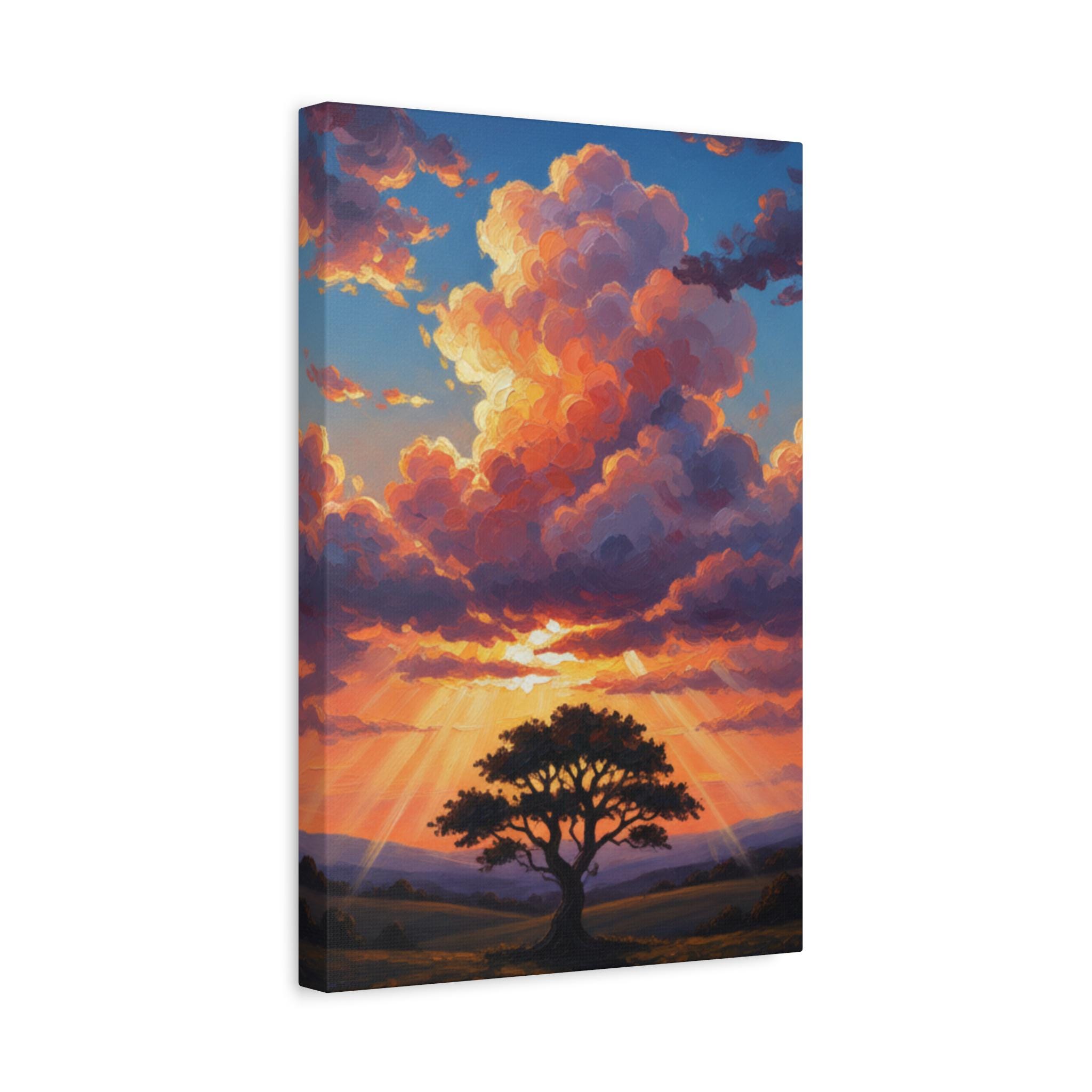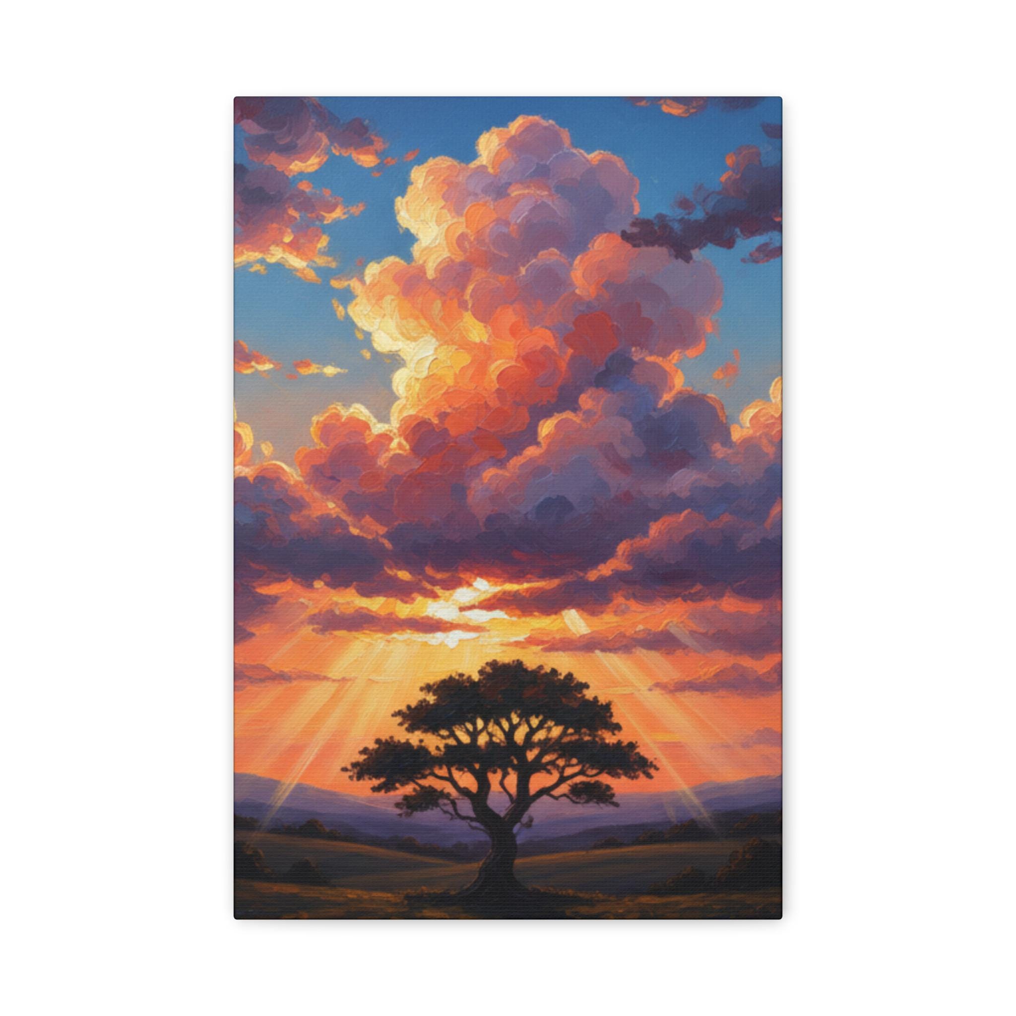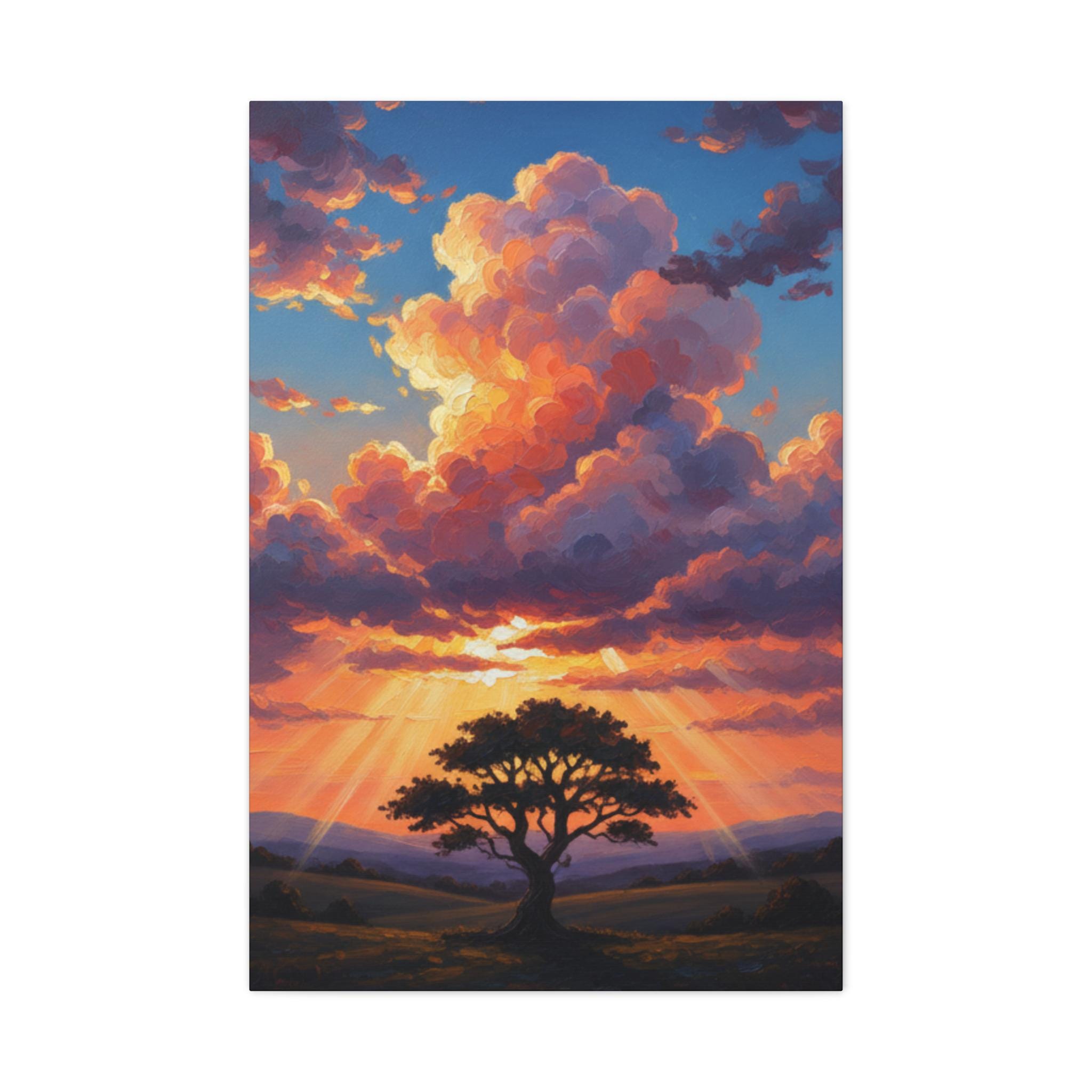 This breathtaking piece features a solitary, resilient tree standing firm against a backdrop of towering, sun-drenched clouds. The vibrant oranges and deep blues create a powerful contrast, symbolizing hope, strength, and the magnificent scale of nature. It’s not just a landscape; it’s a "Tree of Life" moment captured in a dreamlike, surreal style.