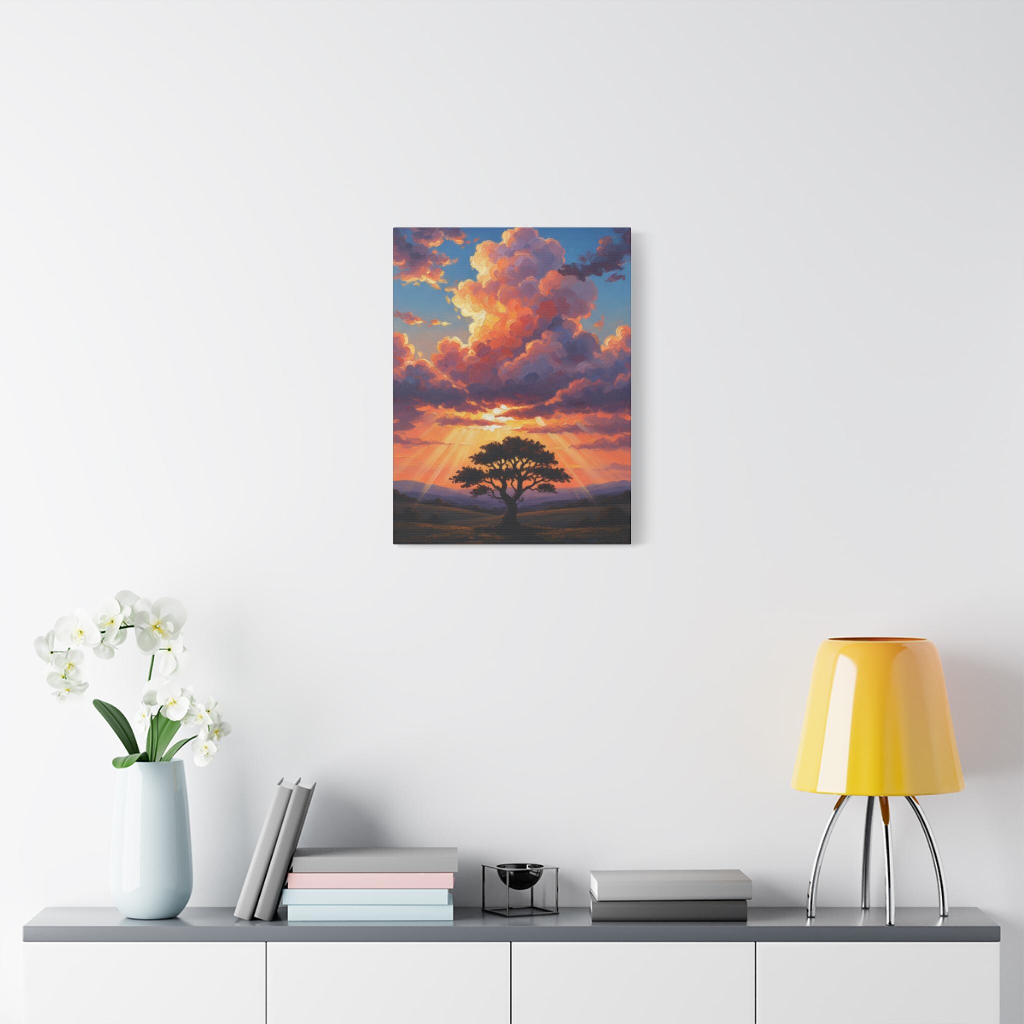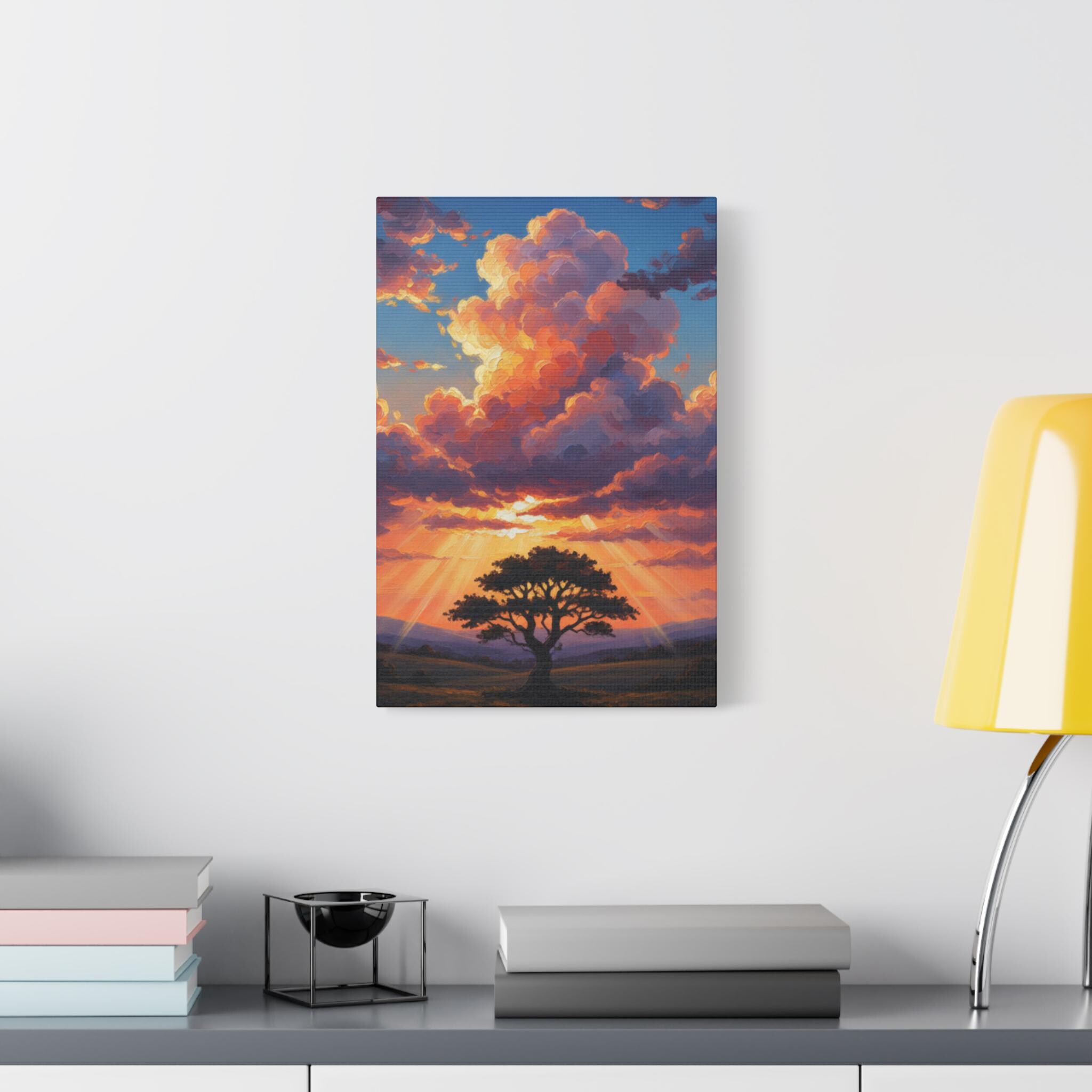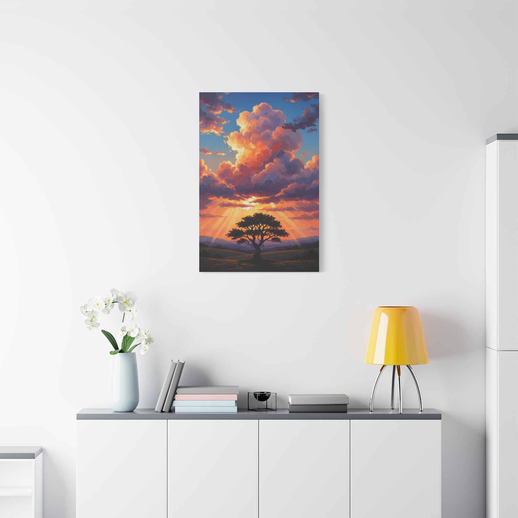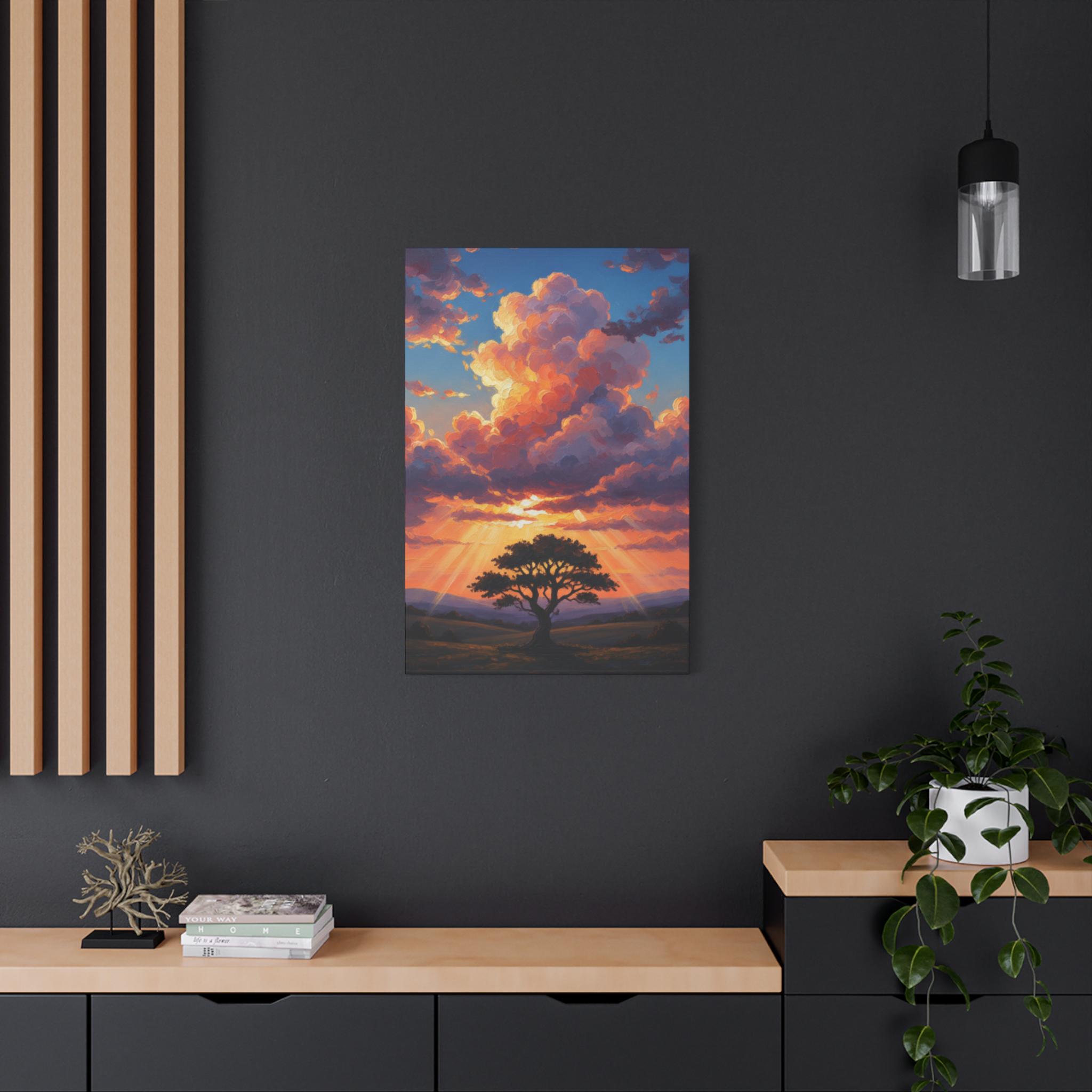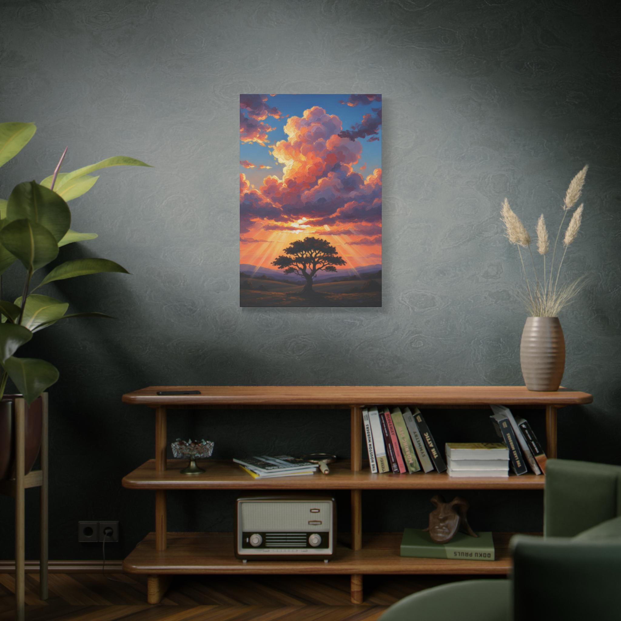 This breathtaking piece features a solitary, resilient tree standing firm against a backdrop of towering, sun-drenched clouds. The vibrant oranges and deep blues create a powerful contrast, symbolizing hope, strength, and the magnificent scale of nature. It’s not just a landscape; it’s a "Tree of Life" moment captured in a dreamlike, surreal style.