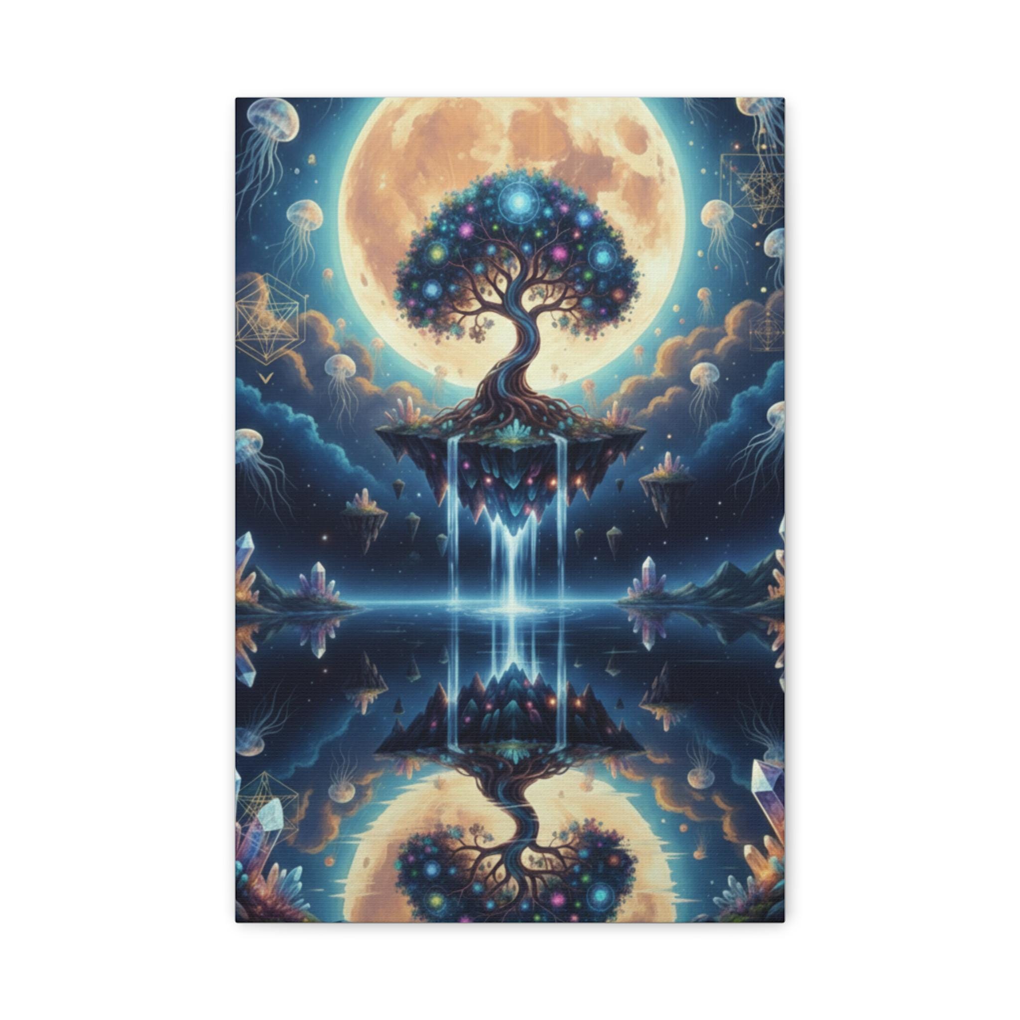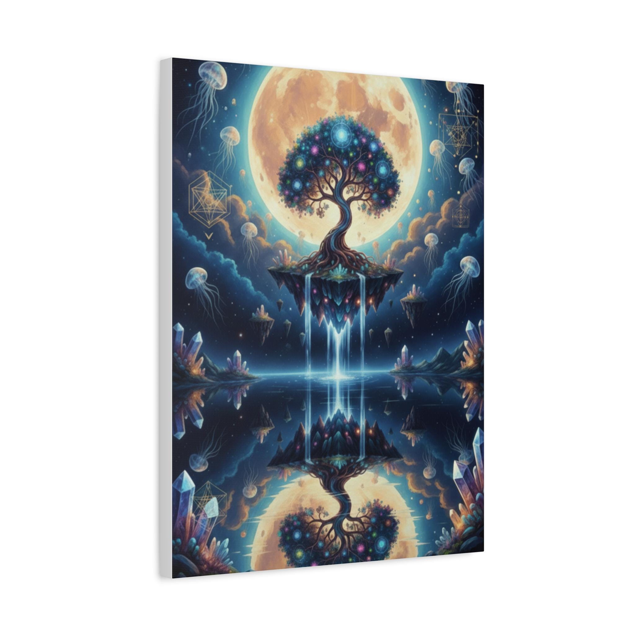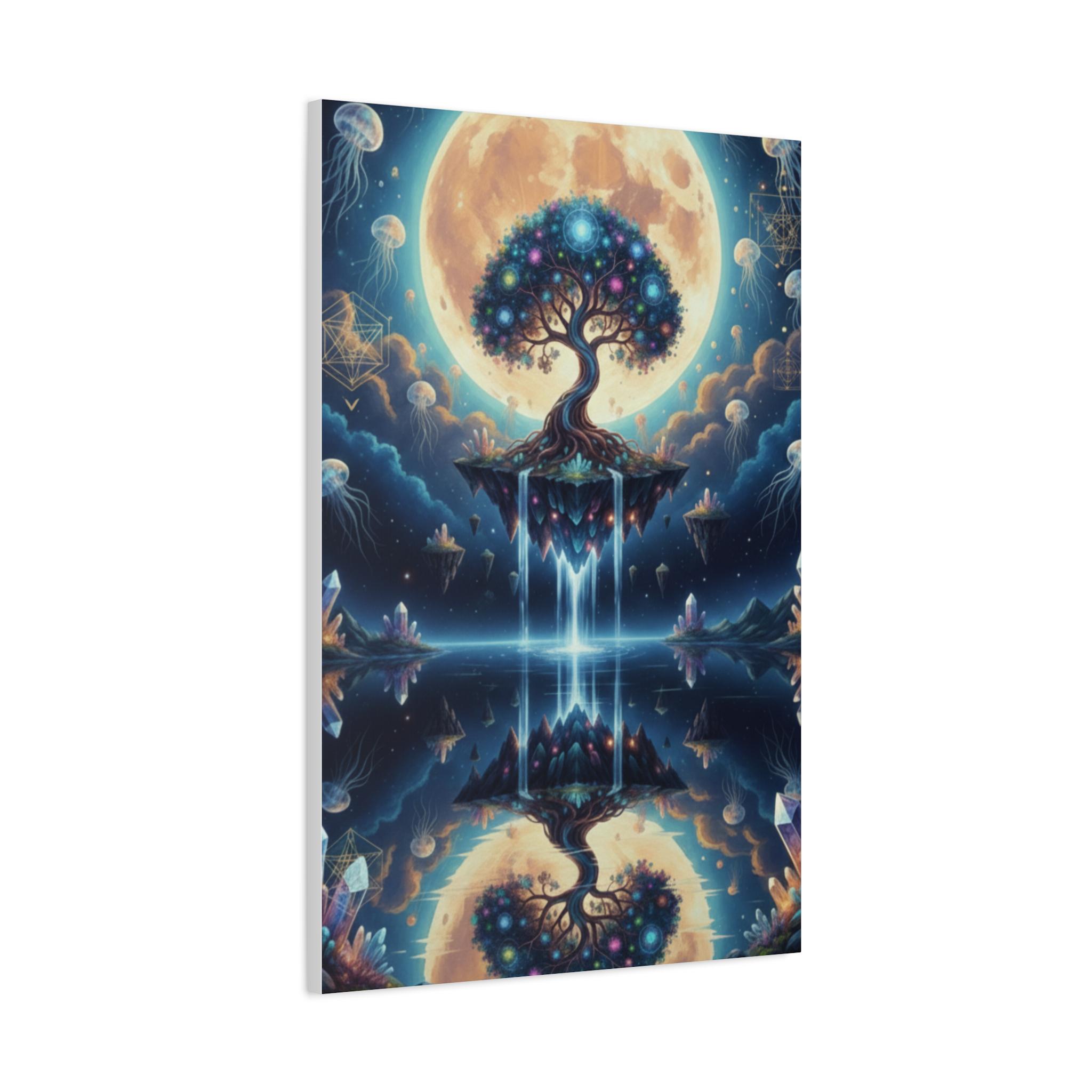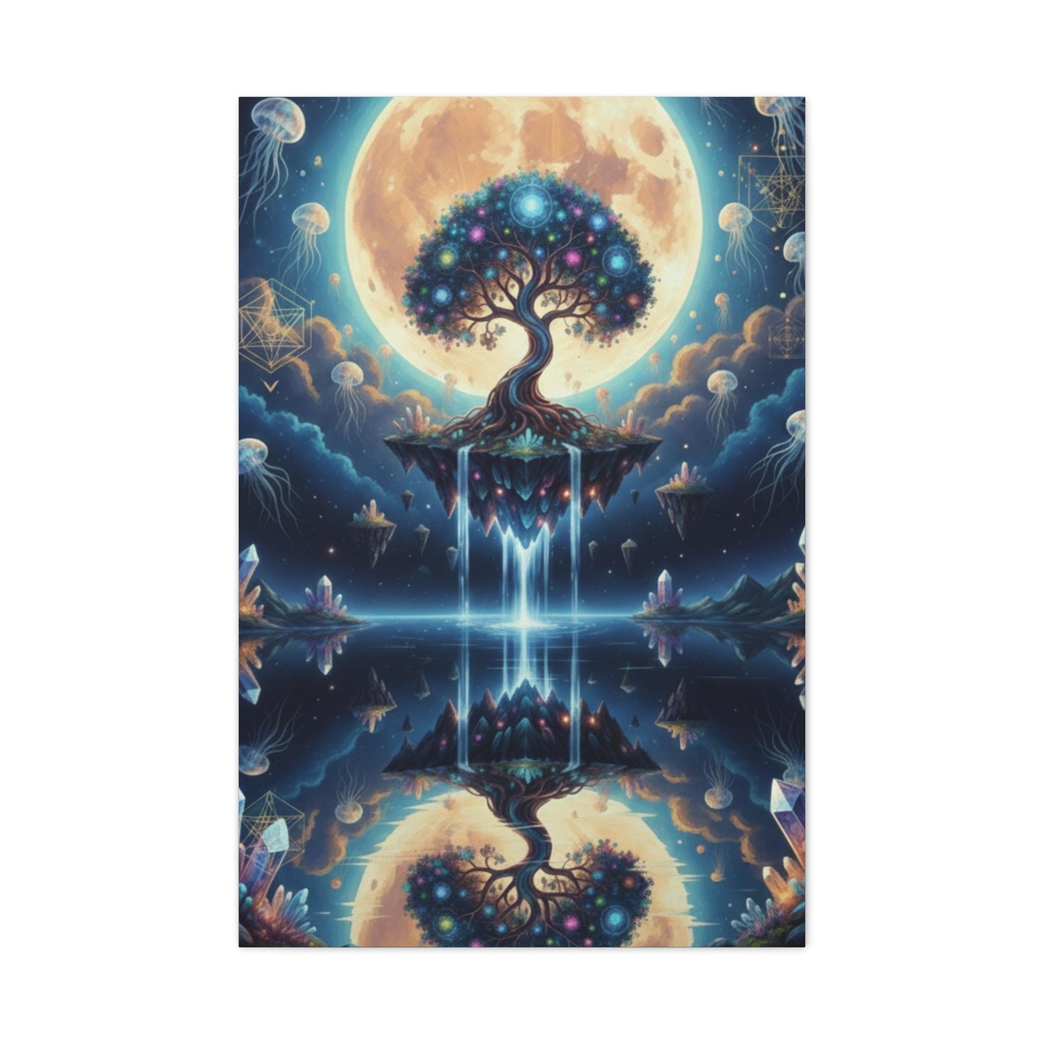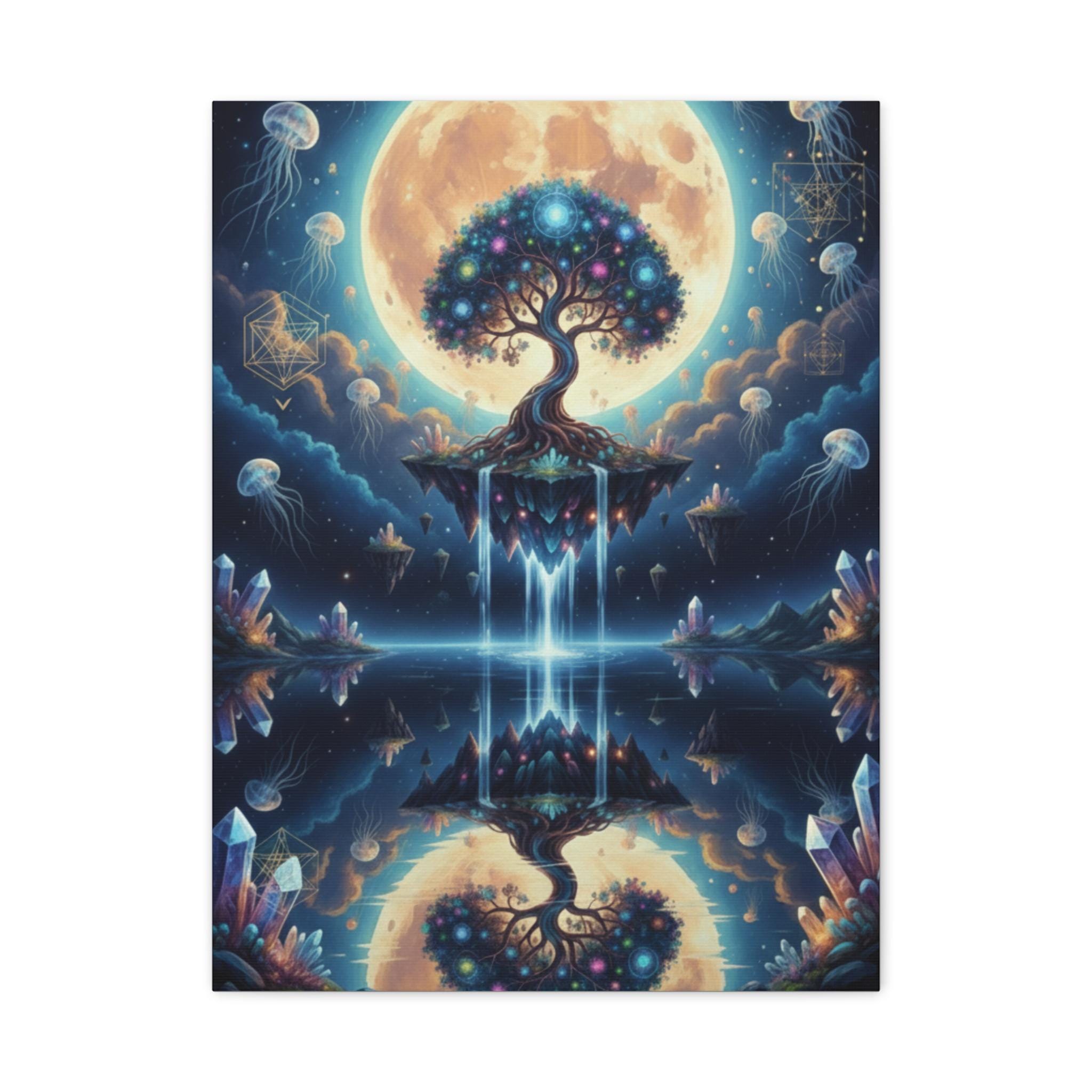 This mesmerizing surrealist masterpiece features a majestic Tree of Life perched upon a floating island, with ethereal waterfalls cascading into a mirror-like cosmic lake. Set against a gargantuan, glowing moon and surrounded by floating celestial jellyfish, this artwork is a portal to a higher dimension.
