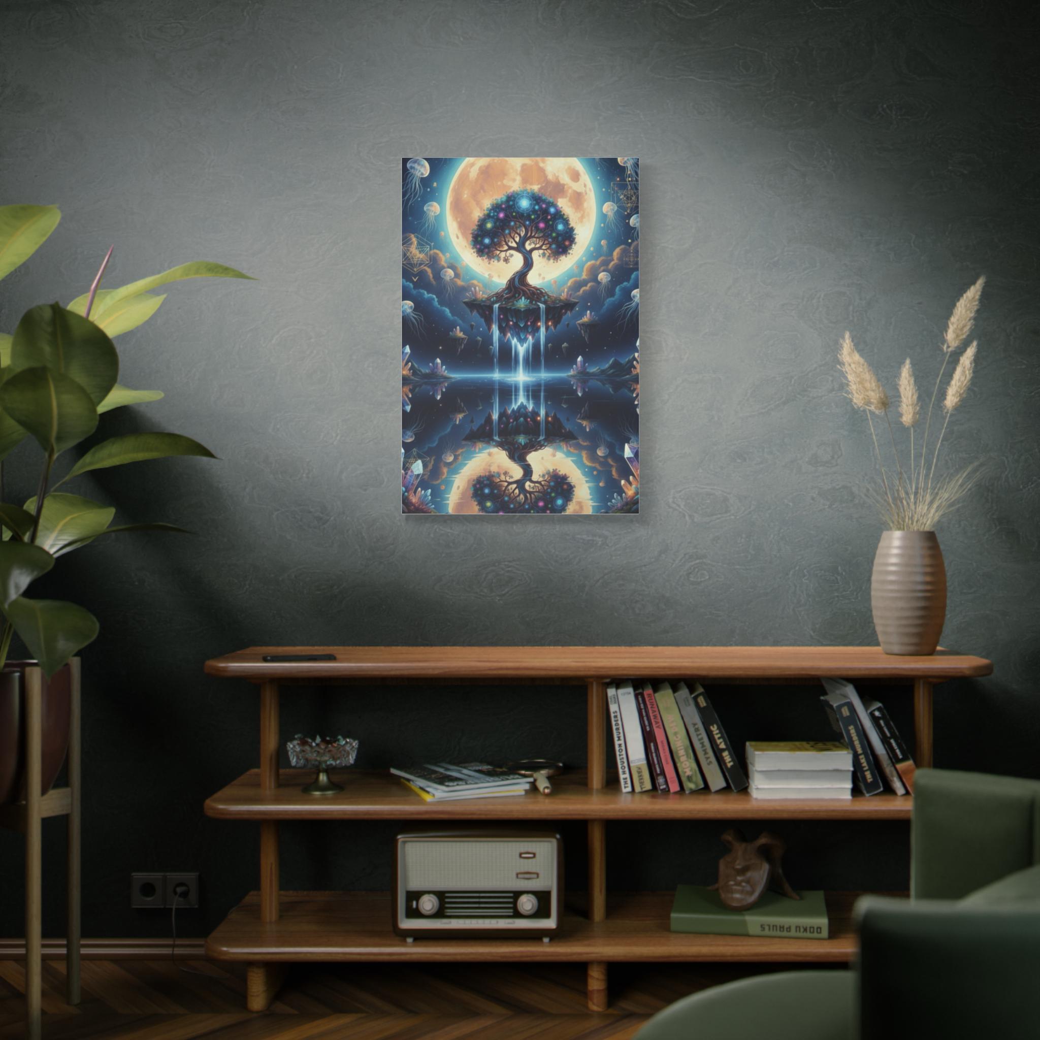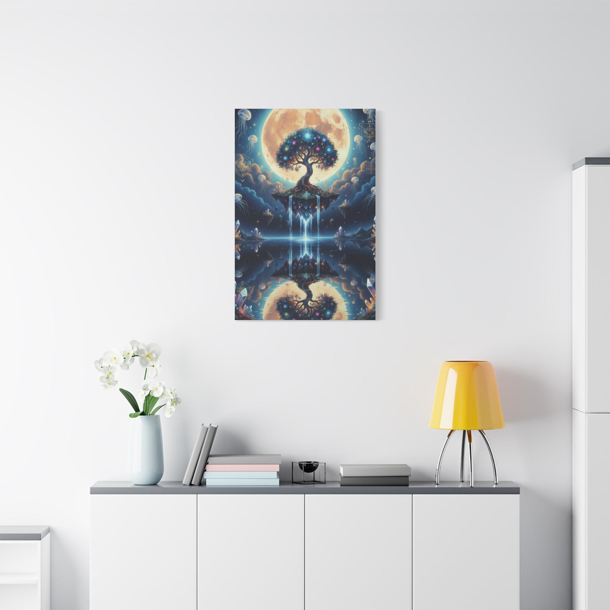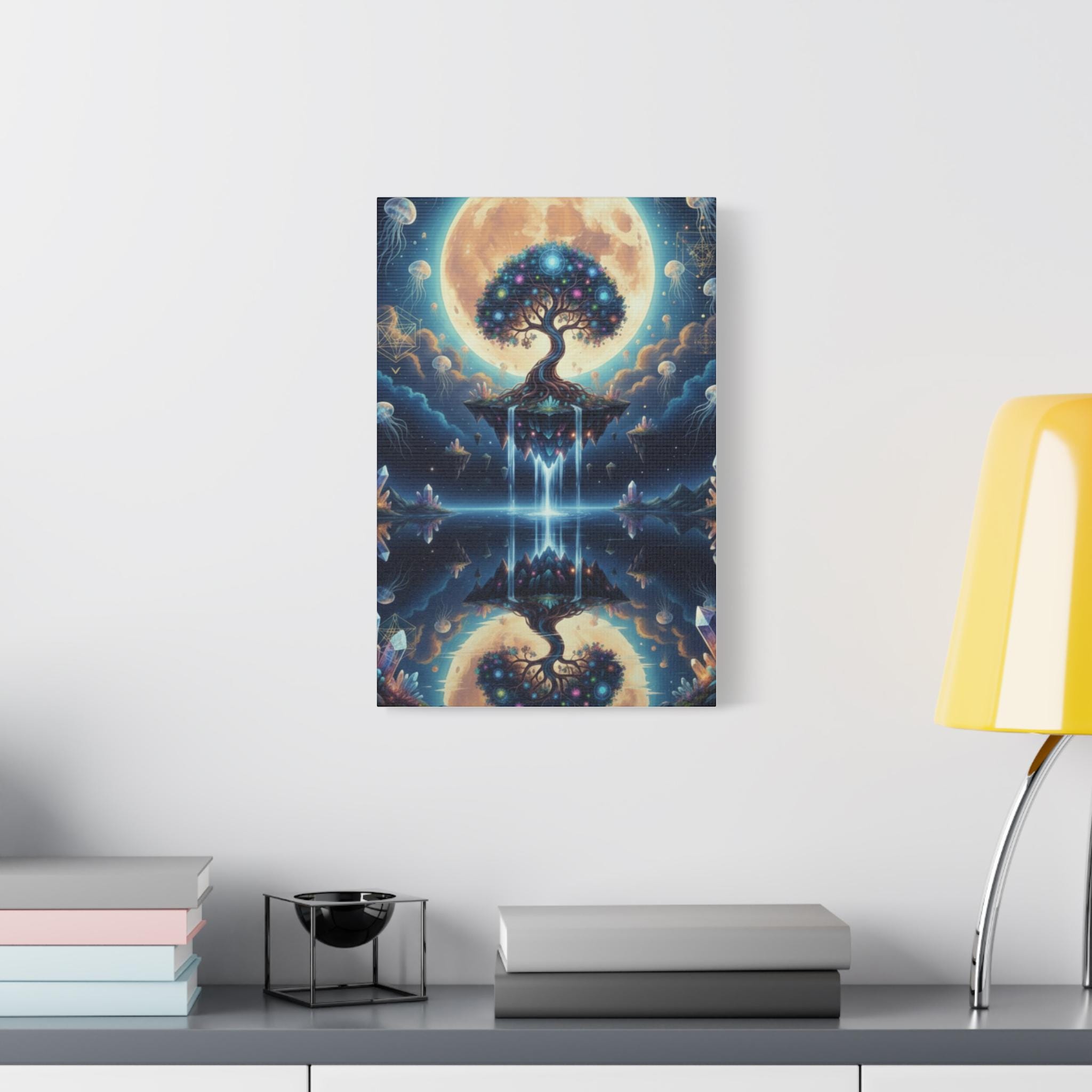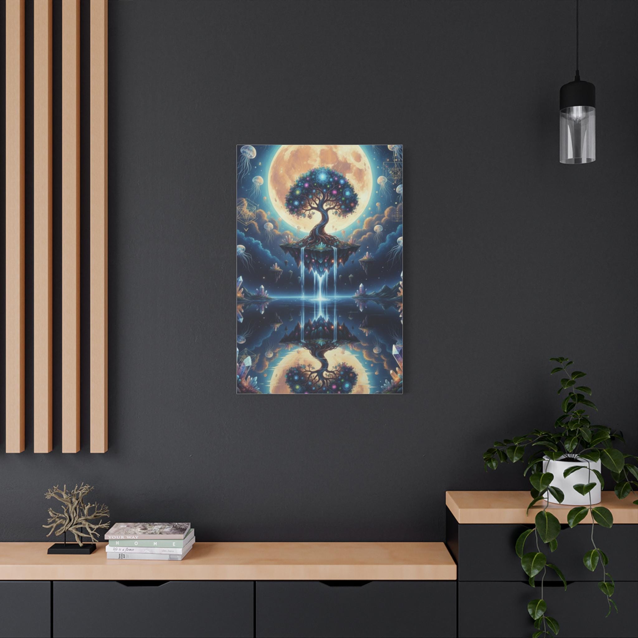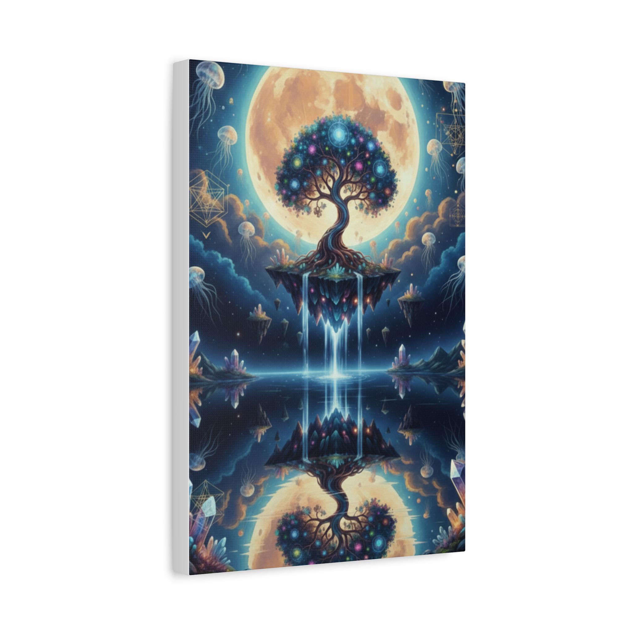 This mesmerizing surrealist masterpiece features a majestic Tree of Life perched upon a floating island, with ethereal waterfalls cascading into a mirror-like cosmic lake. Set against a gargantuan, glowing moon and surrounded by floating celestial jellyfish, this artwork is a portal to a higher dimension.