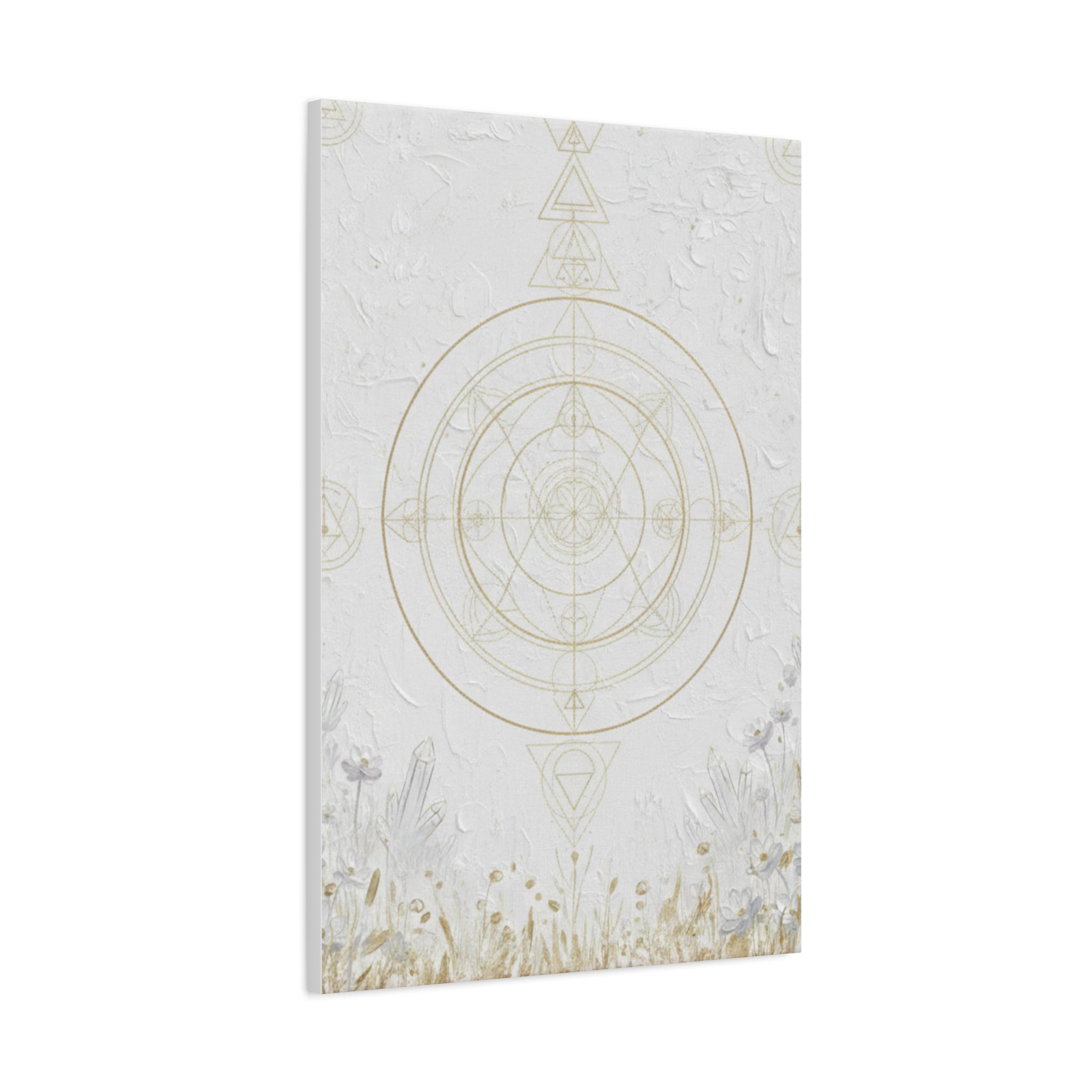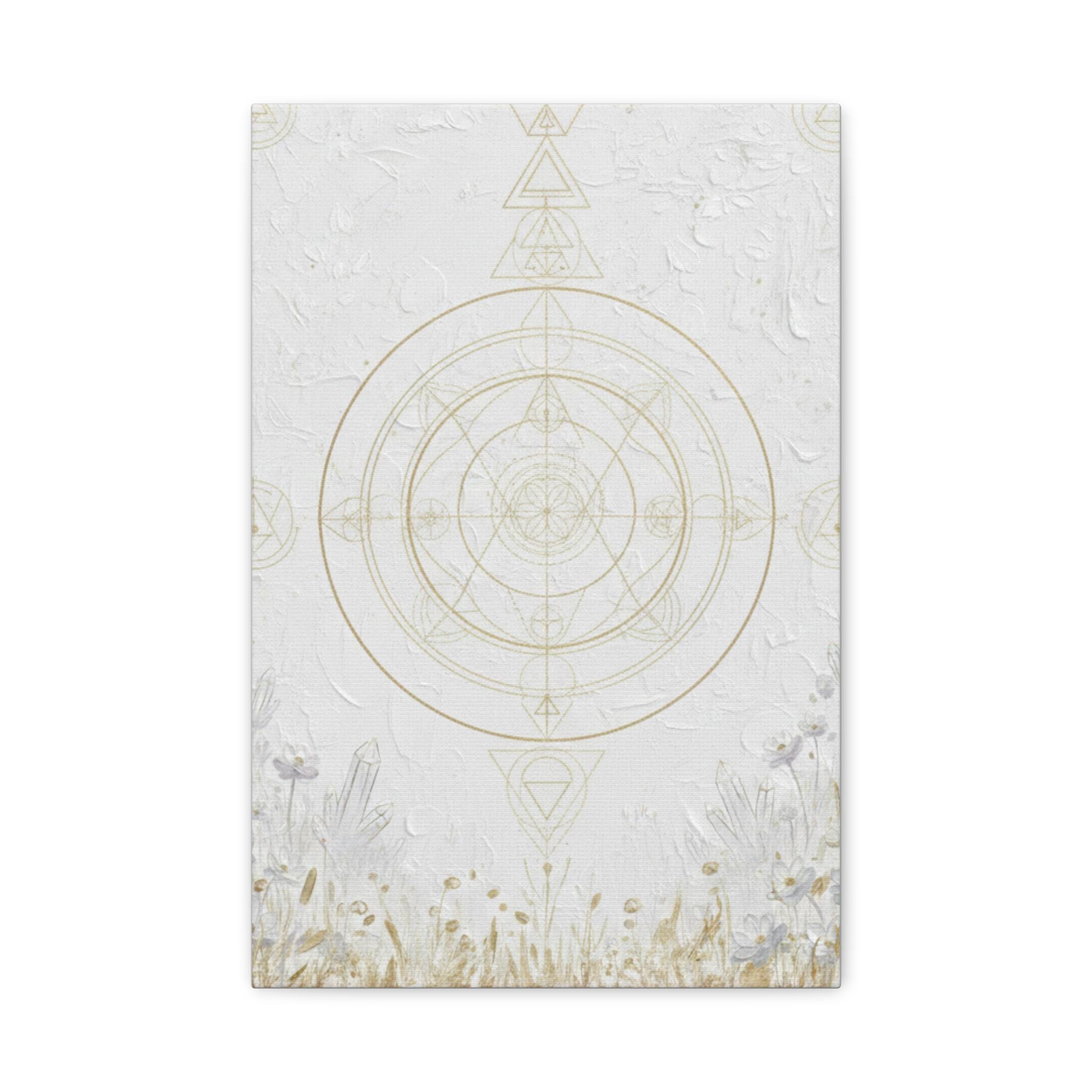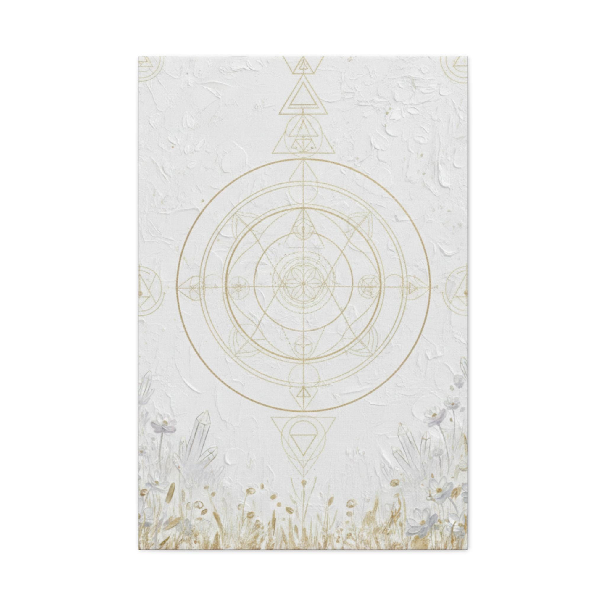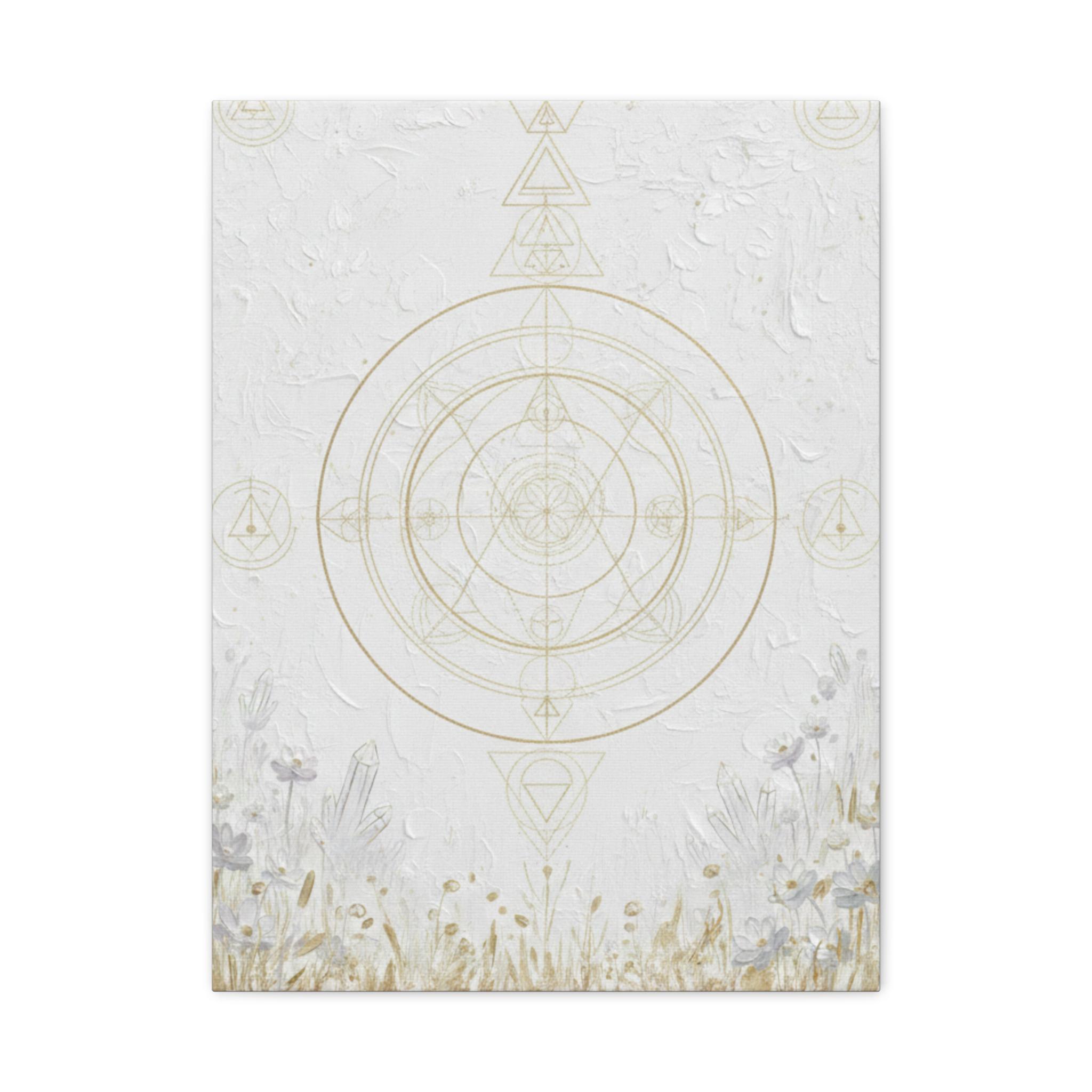 This sophisticated masterpiece features an intricate Golden Sacred Geometry portal, meticulously designed to radiate balance, harmony, and creative energy. Set against a rich, textured white background that mimics hand-painted plaster, the delicate gold lines and crystalline floral accents create a bridge between the physical and spiritual realms.