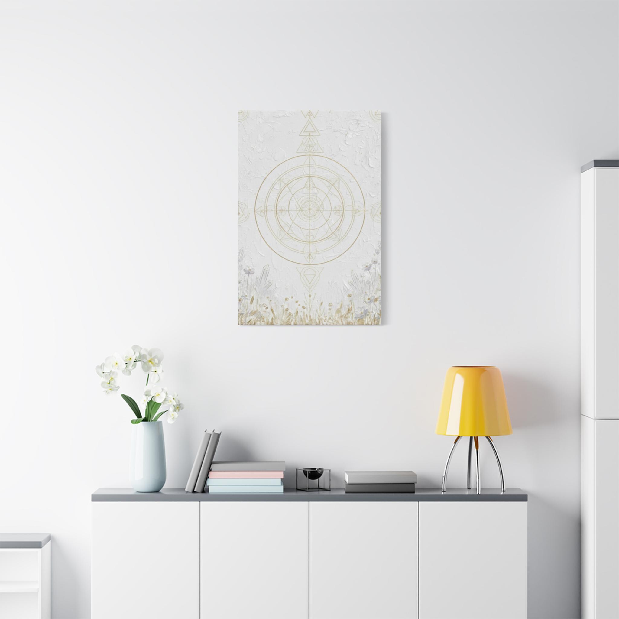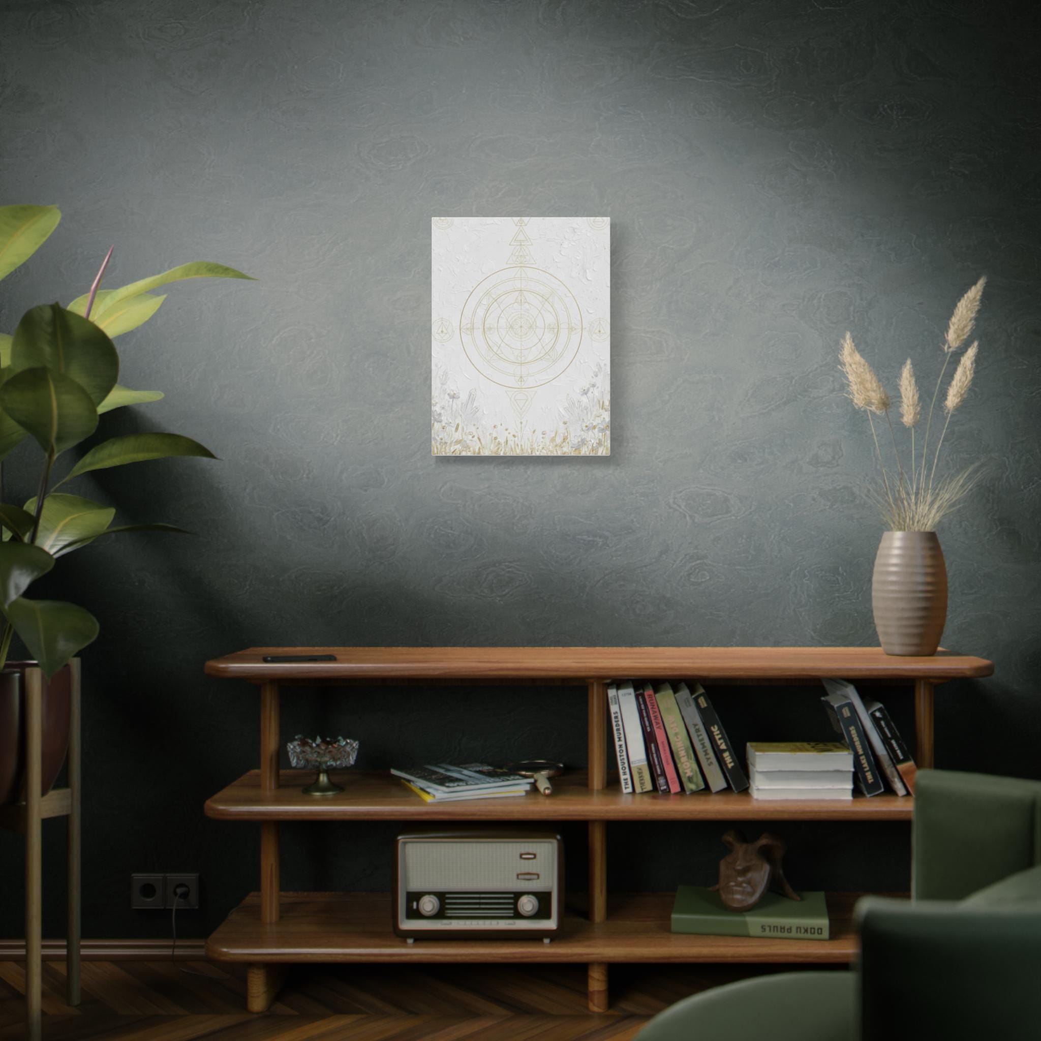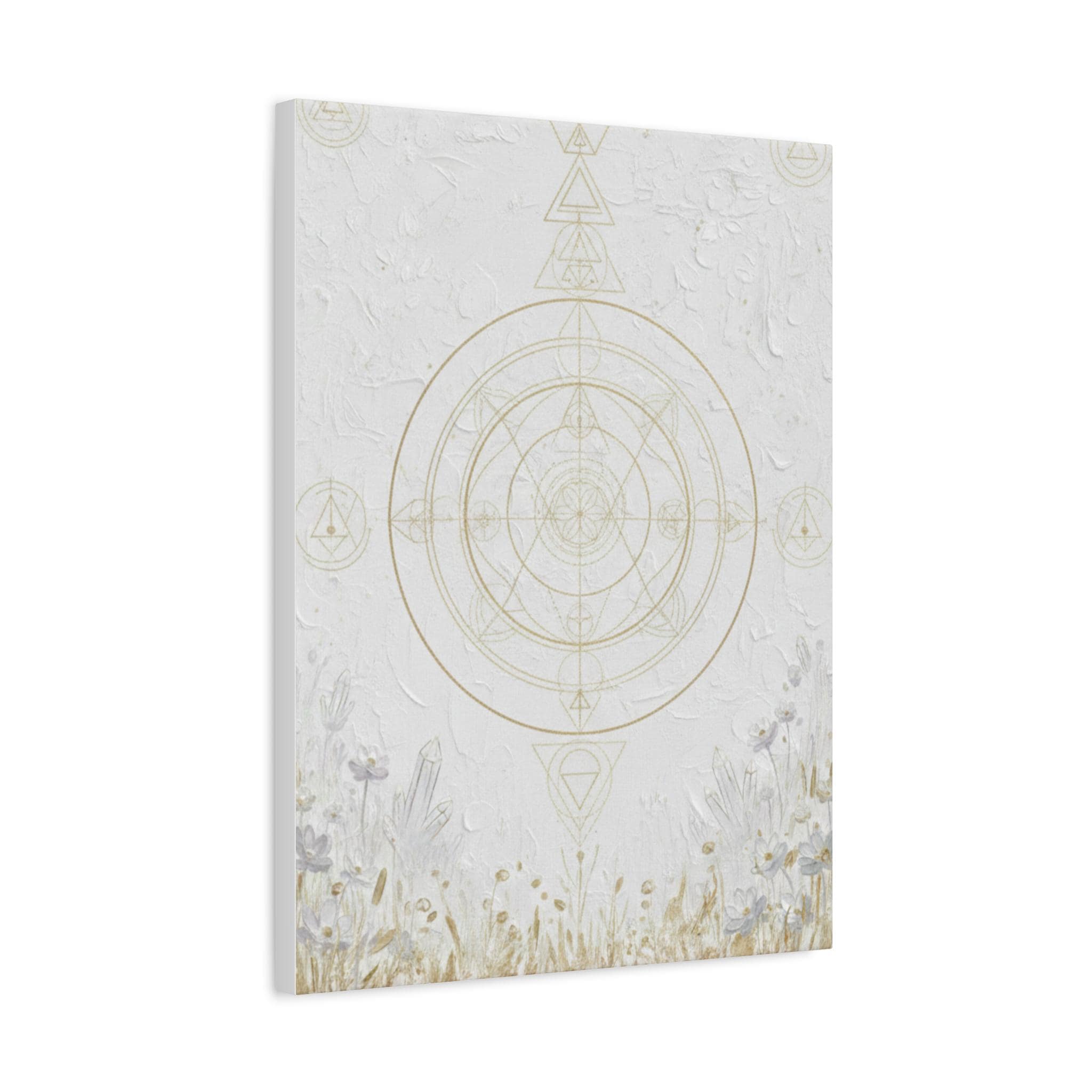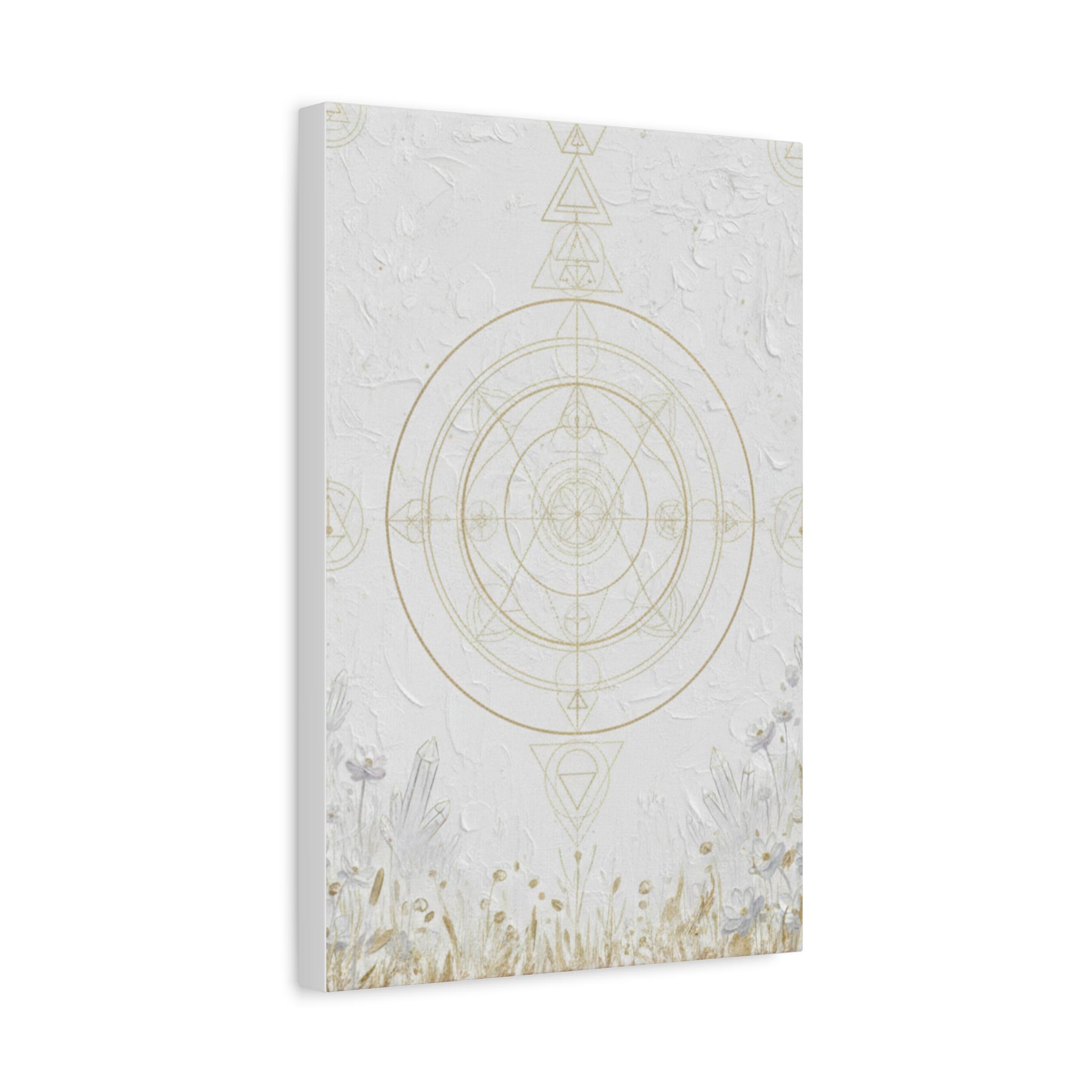 This sophisticated masterpiece features an intricate Golden Sacred Geometry portal, meticulously designed to radiate balance, harmony, and creative energy. Set against a rich, textured white background that mimics hand-painted plaster, the delicate gold lines and crystalline floral accents create a bridge between the physical and spiritual realms.