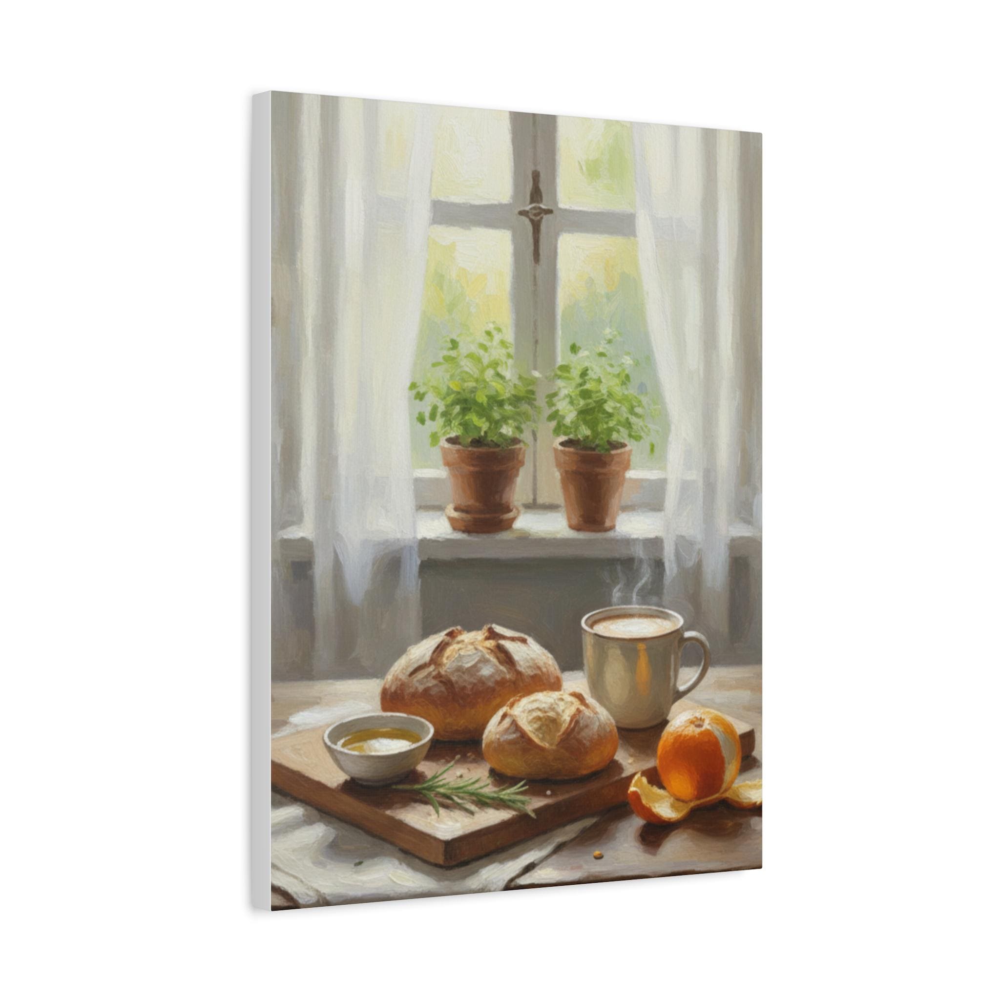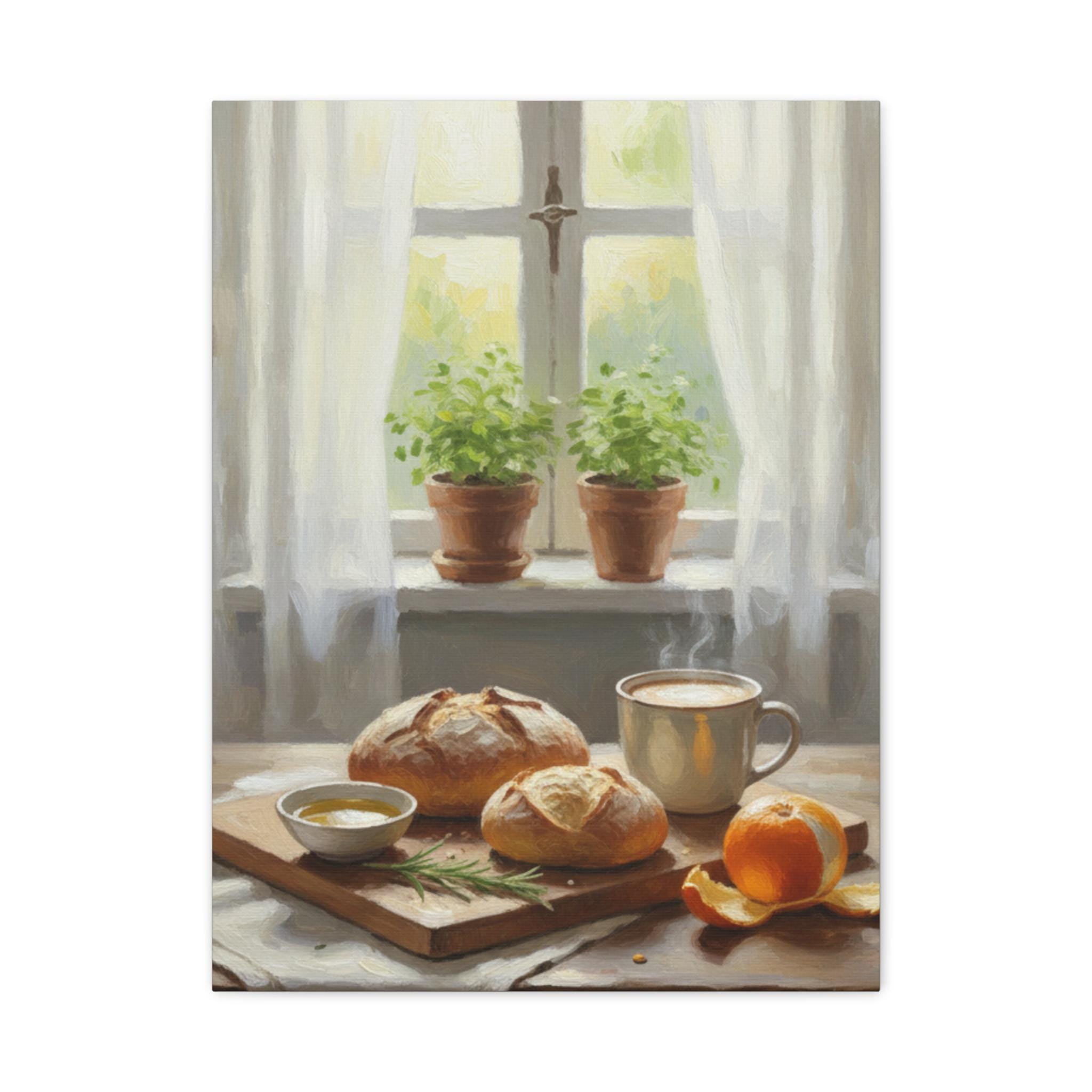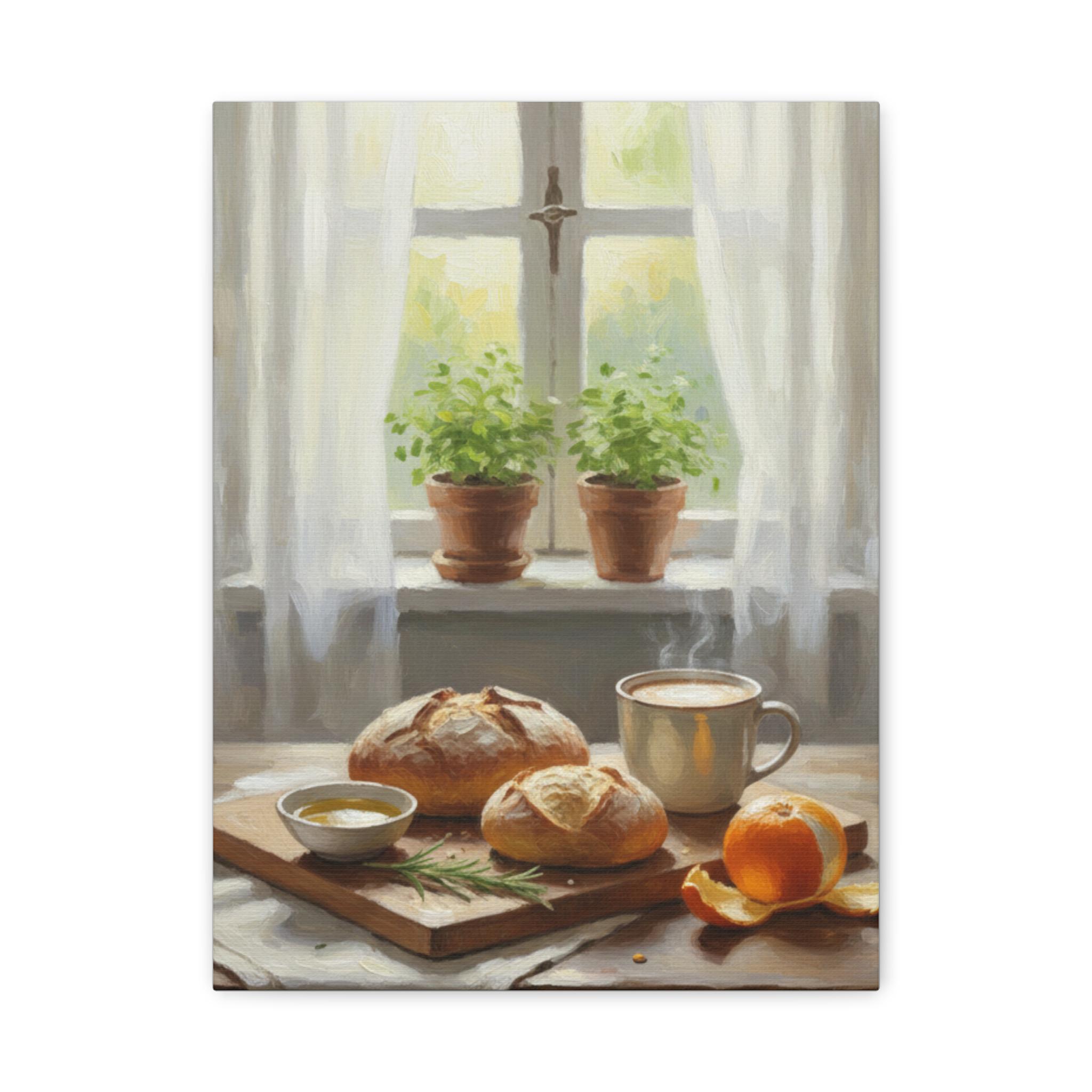 This beautiful oil painting style artwork captures the serenity of a sunny morning. Featuring freshly baked bread, a warm cup of coffee, and soft sunlight streaming through a kitchen window, it’s the perfect piece to bring warmth to your kitchen or dining area.