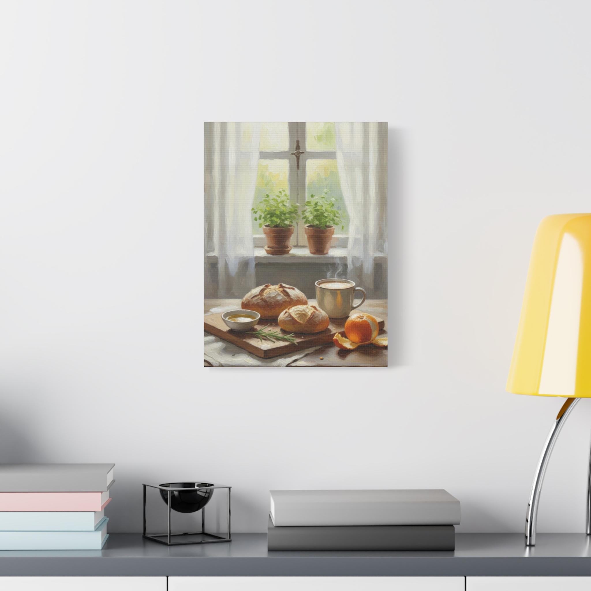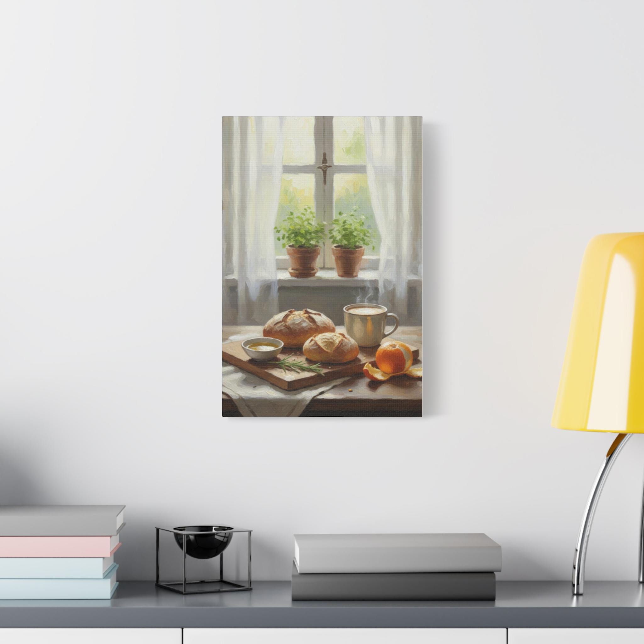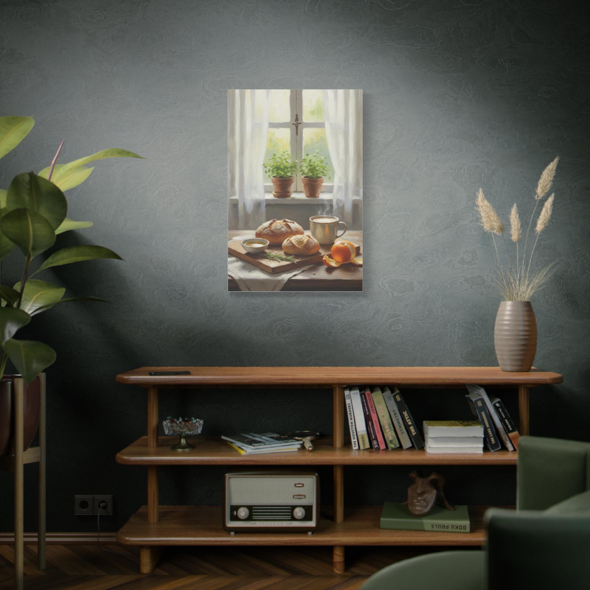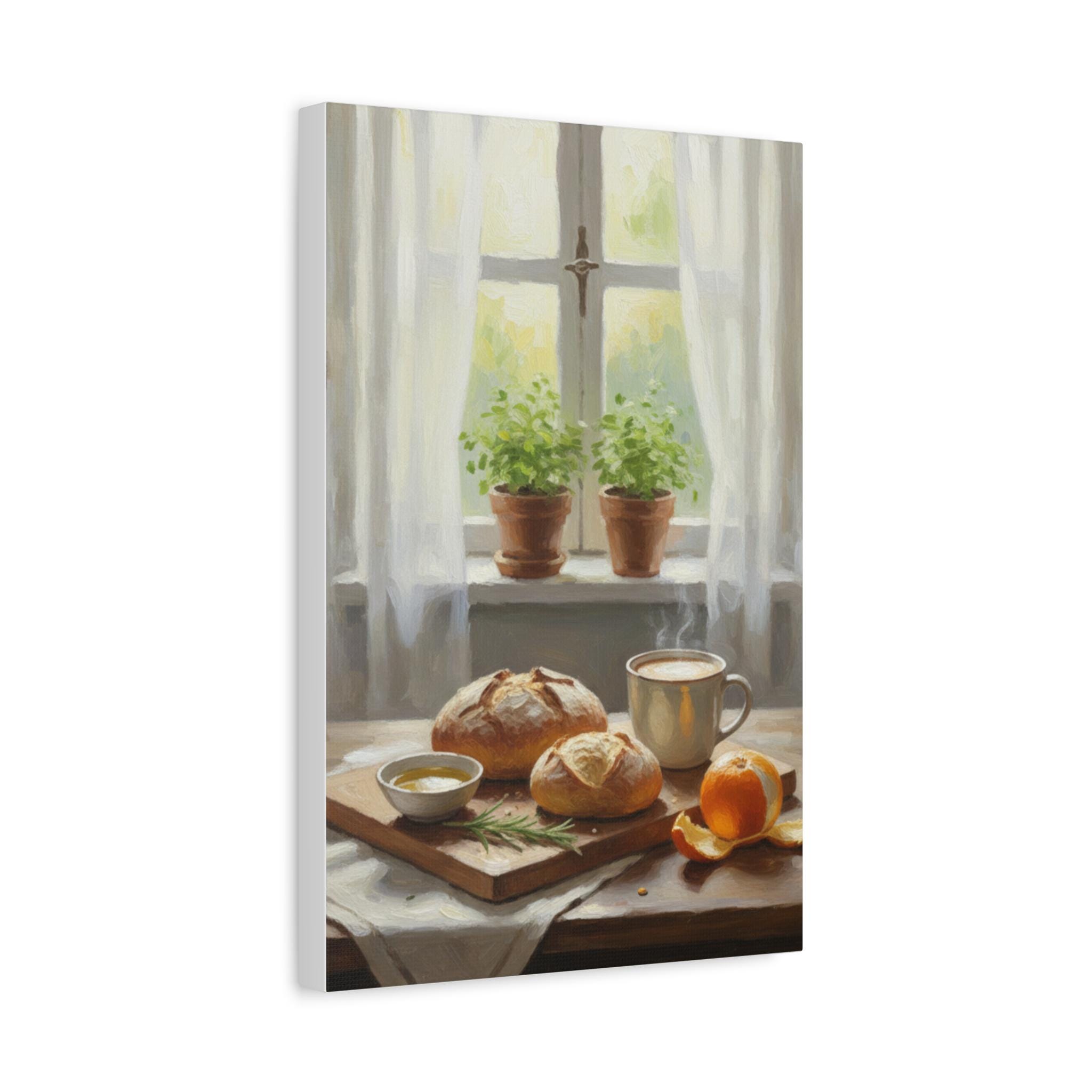 This beautiful oil painting style artwork captures the serenity of a sunny morning. Featuring freshly baked bread, a warm cup of coffee, and soft sunlight streaming through a kitchen window, it’s the perfect piece to bring warmth to your kitchen or dining area.