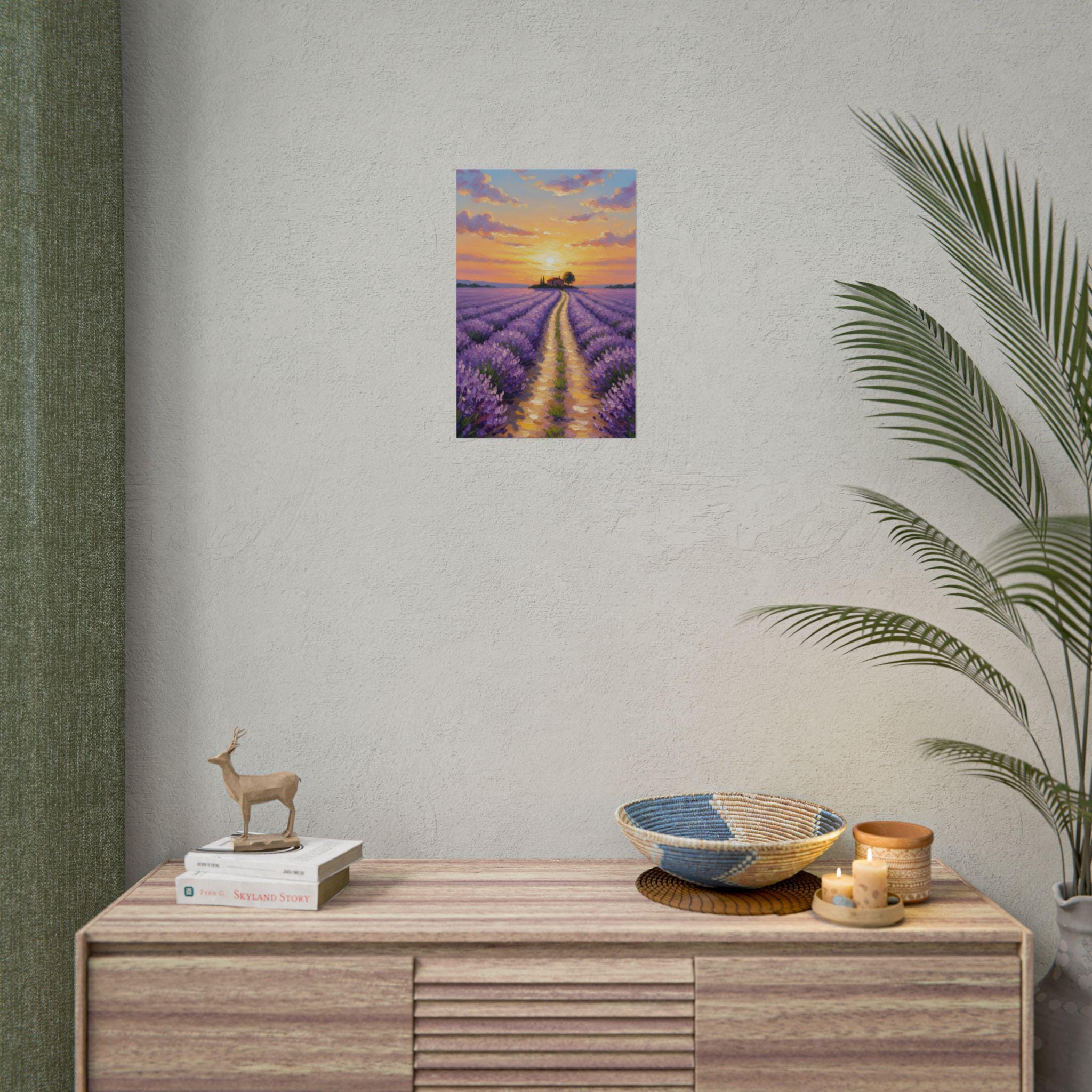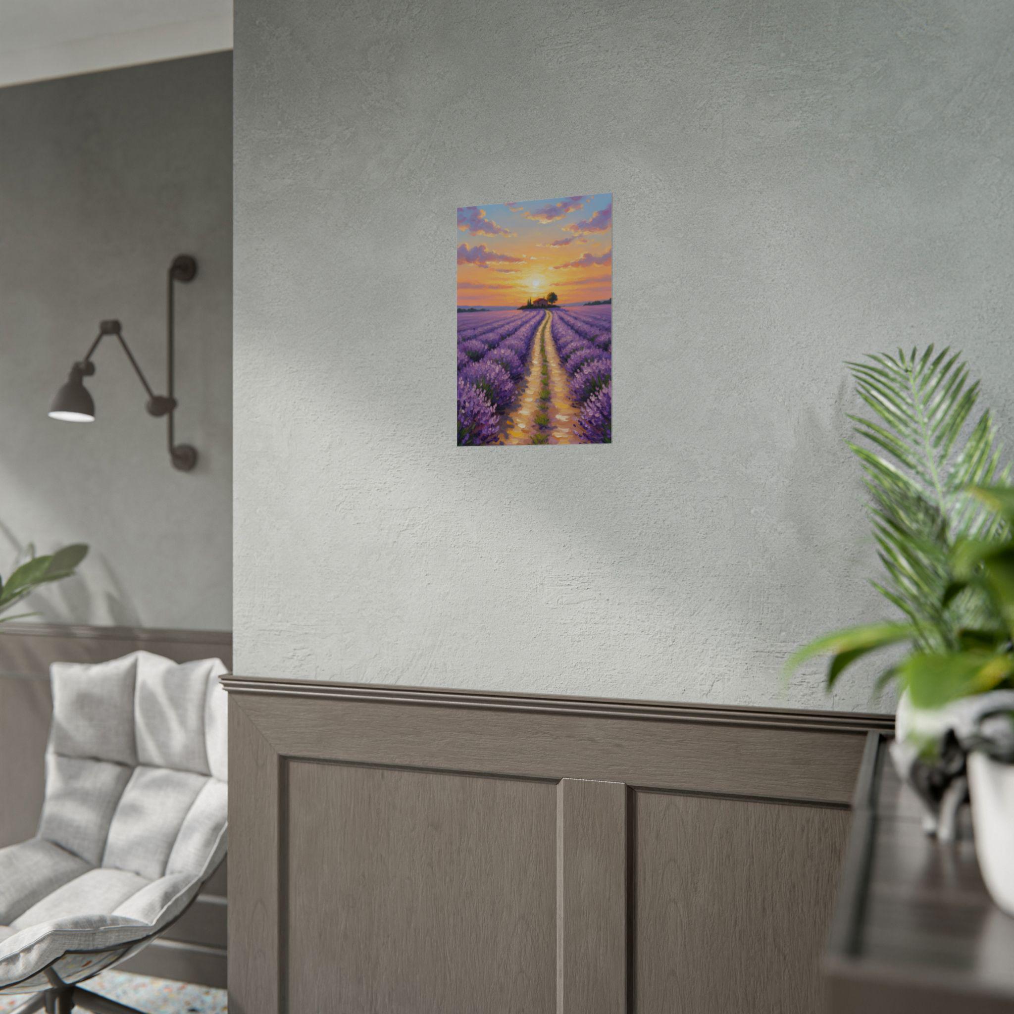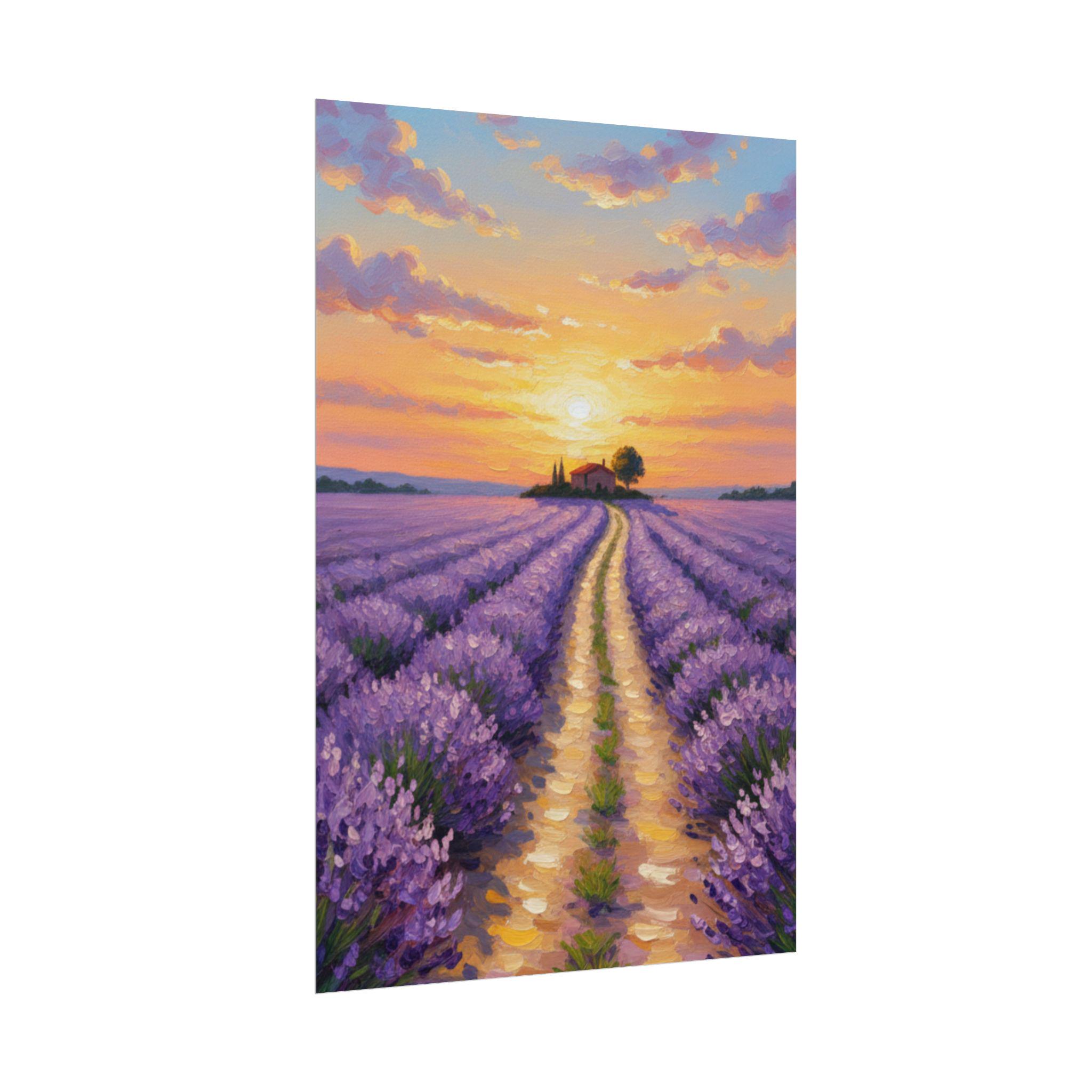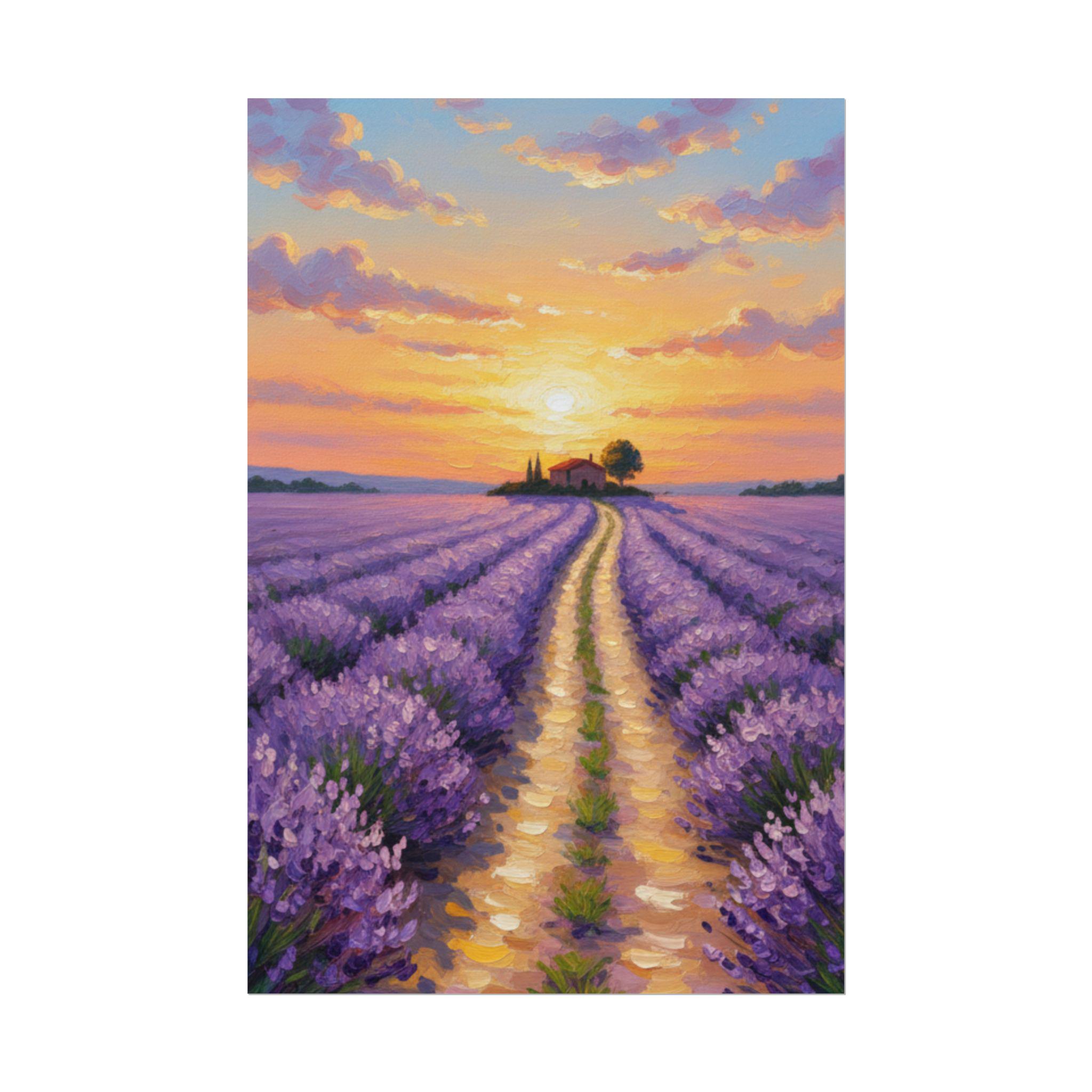 Escape to the serene fields of Provence with this Sunset Lavender Field canvas art. Featuring rich purple hues and a charming cottage silhouetted against a golden sky, this impressionist-style painting brings a romantic and calming atmosphere to your home.