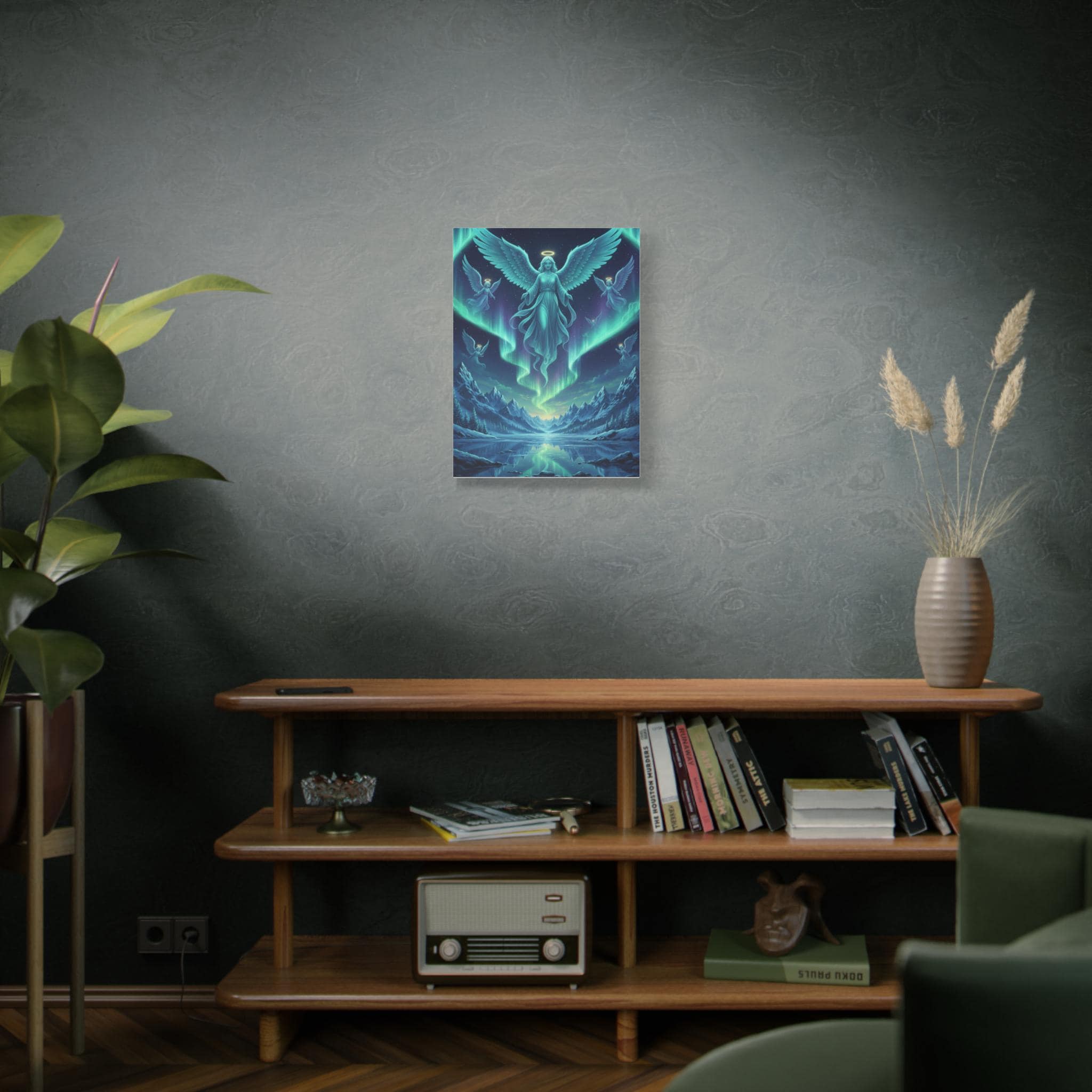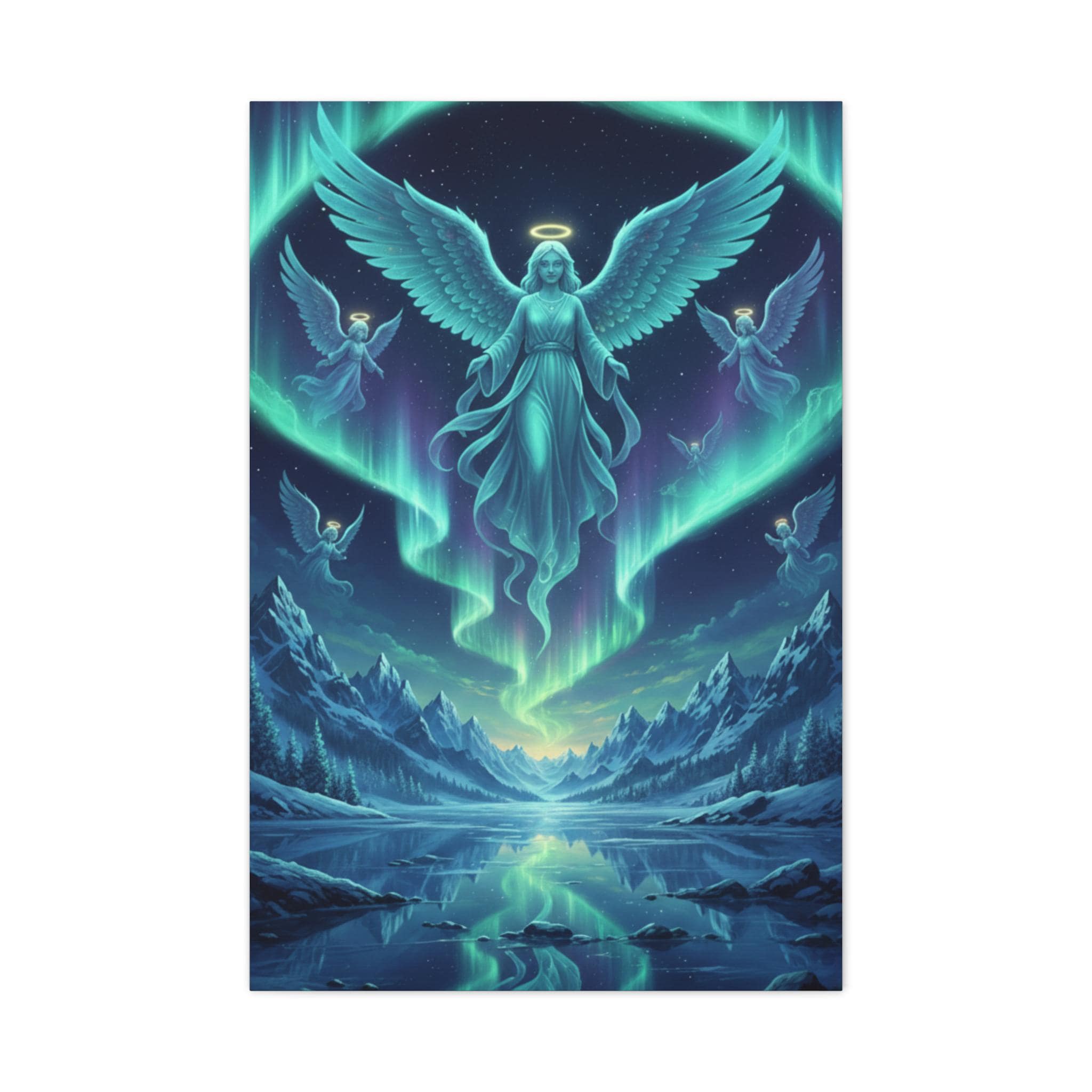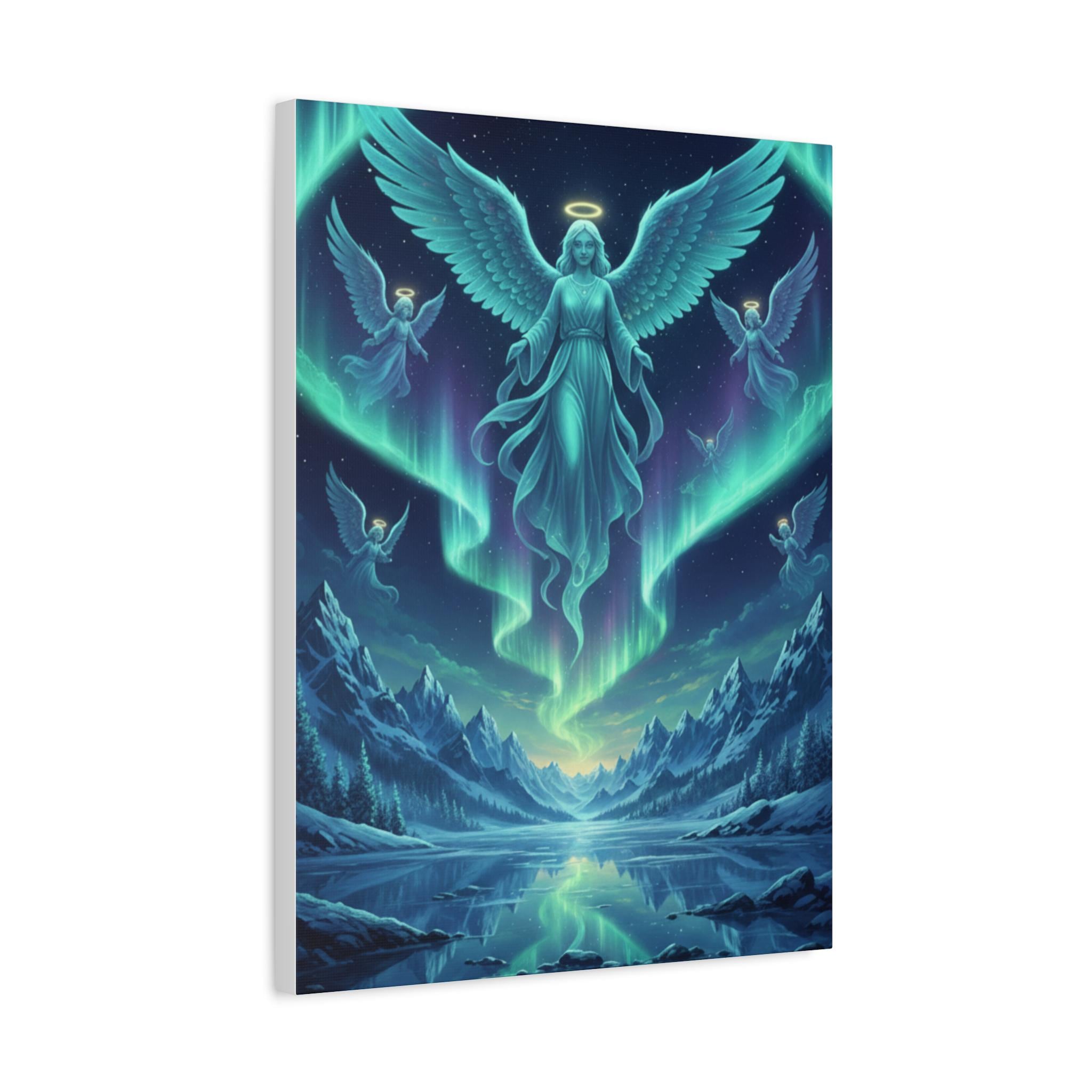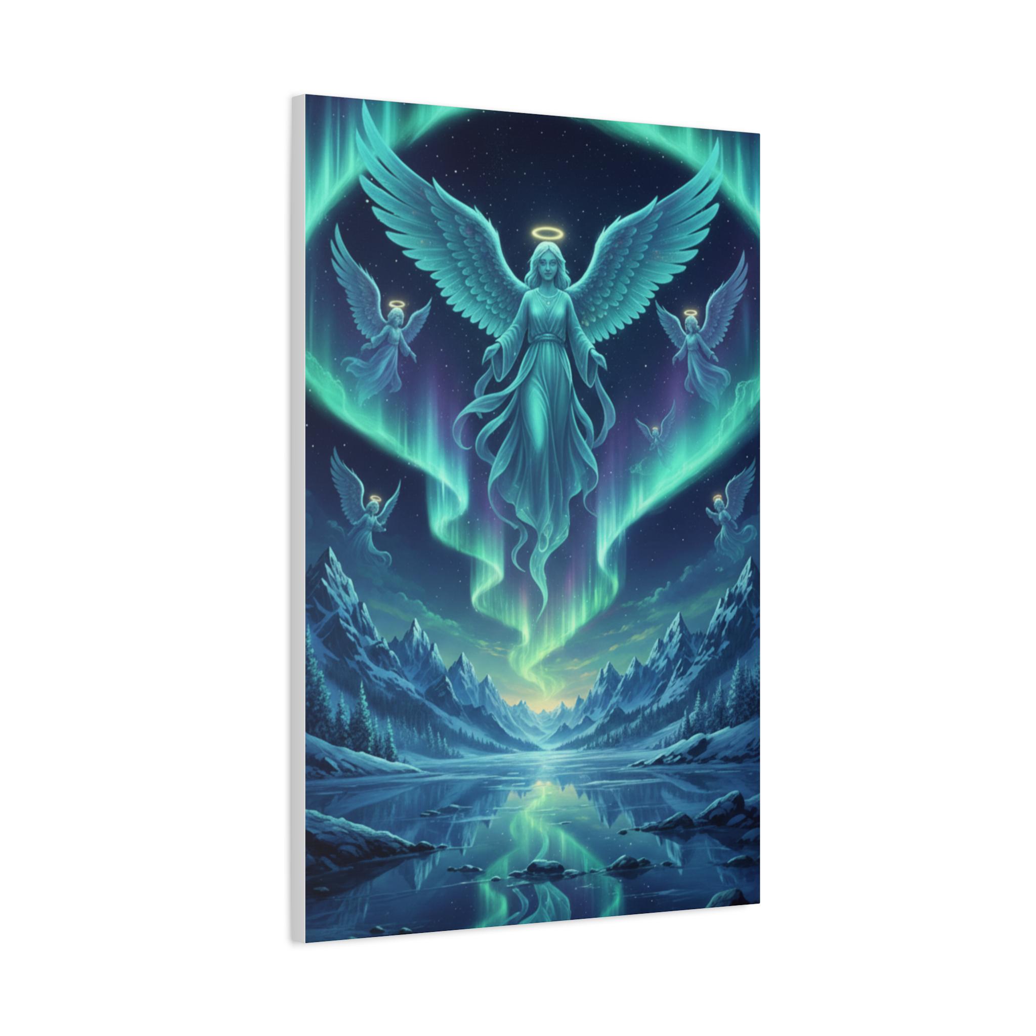 Bring the divine beauty of the celestial realm into your home with our "Aurora Guardians" Premium Canvas Art. This breathtaking piece depicts a majestic group of angels descending through a vibrant Northern Lights display, casting a mystical glow over a serene, frozen mountain landscape. It’s more than just art; it’s a symbol of peace, protection, and ethereal wonder.