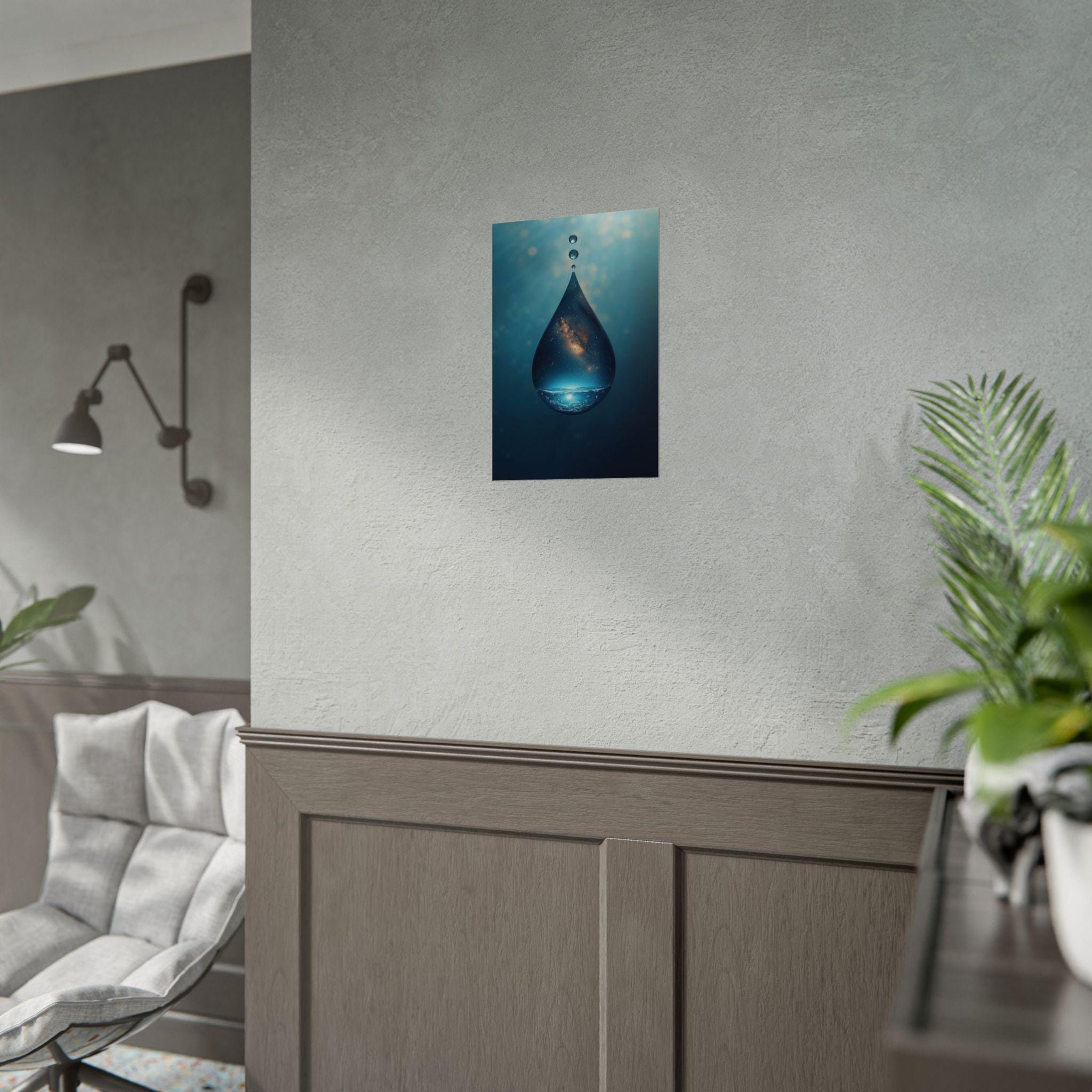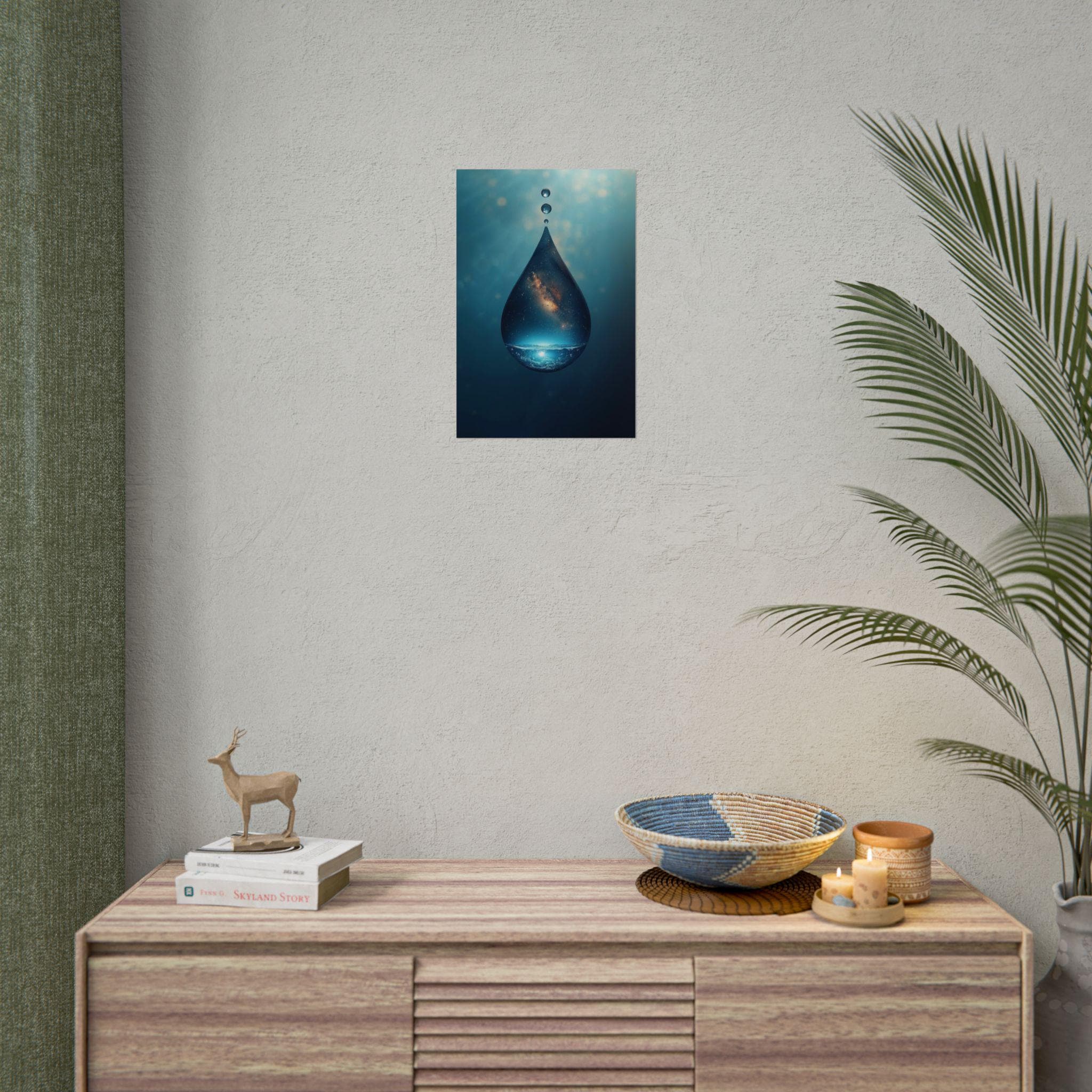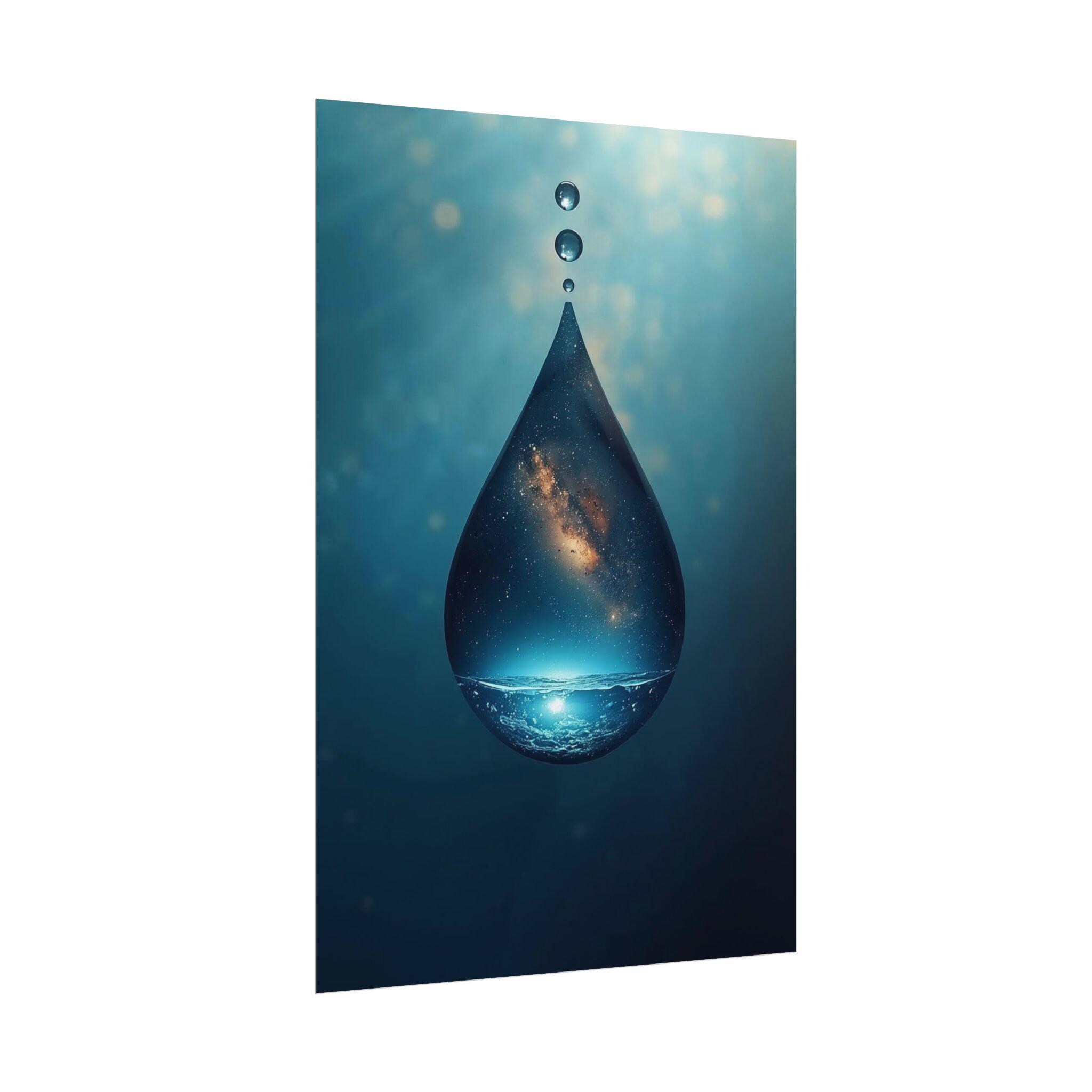 Experience the profound beauty of unity and the cosmos with our "Cosmic Reflection" series. This breathtaking piece features a single, crystalline water droplet suspended in a serene void, containing within it an entire galaxy and a tranquil sunset over a deep blue ocean. It’s a powerful visual reminder of the infinite potential and depth within every soul.