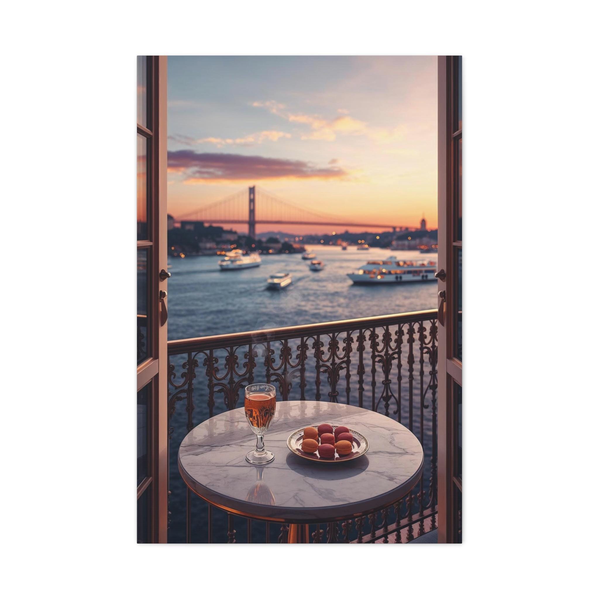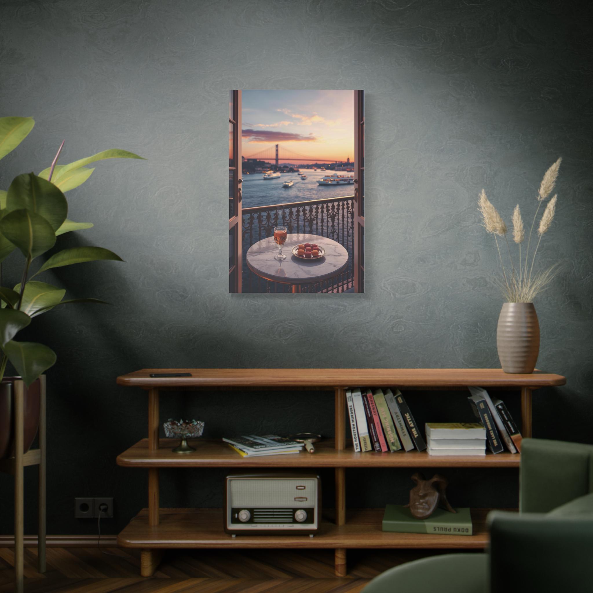 Bring the enchanting spirit of the Bosphorus into your home. This piece captures a prestigious evening on a private Istanbul balcony, looking out at the shimmering bridge and the historic soul of the city. With the warm glow of the sunset and the elegant Turkish tea service on a marble table, it creates a sophisticated atmosphere of peace and prestige.
