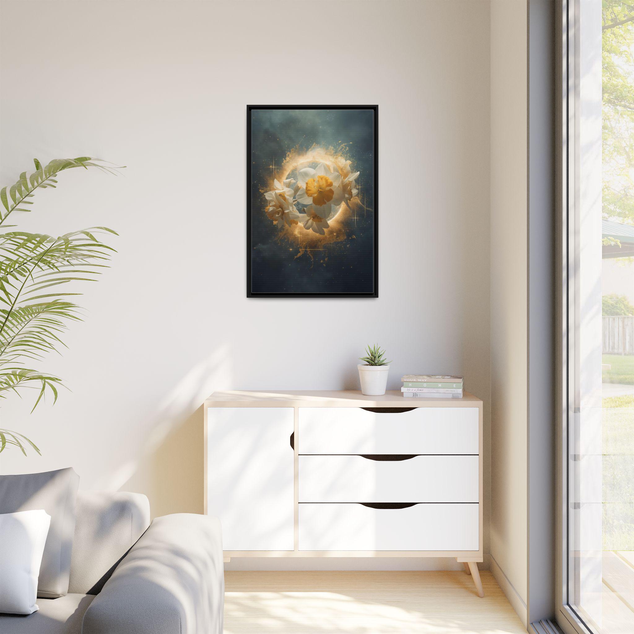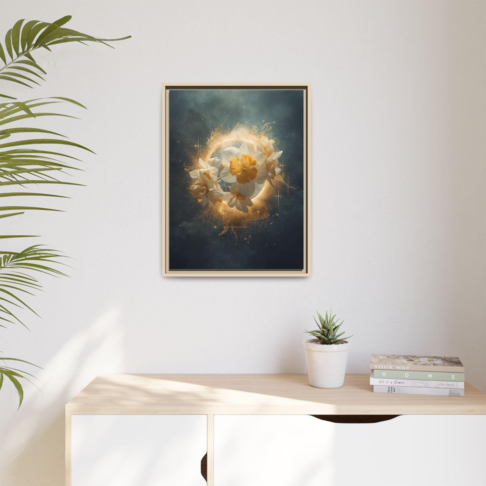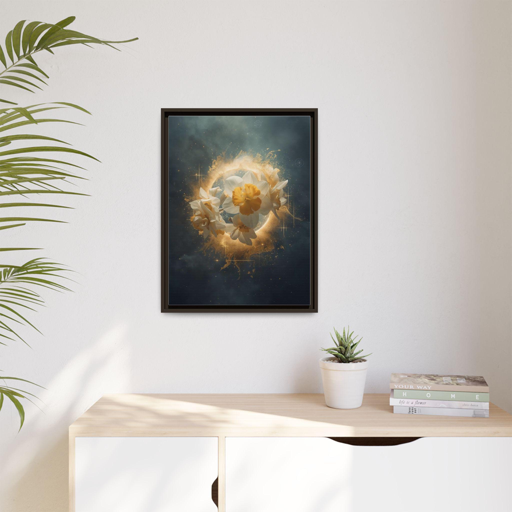Step into a world where nature meets the divine. The Cosmic Narcissus is not just a floral print; it is a surreal masterpiece from our Aura Prime Studio collection, designed to transform your space into a high-end sanctuary. Featuring ethereal Fulya (Narcissus) blooms emerging from a golden celestial halo, this artpiece symbolizes rebirth, mystery, and elegance.