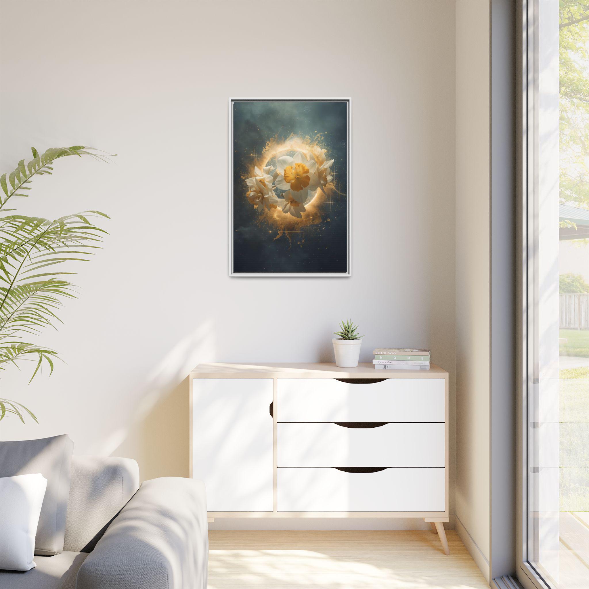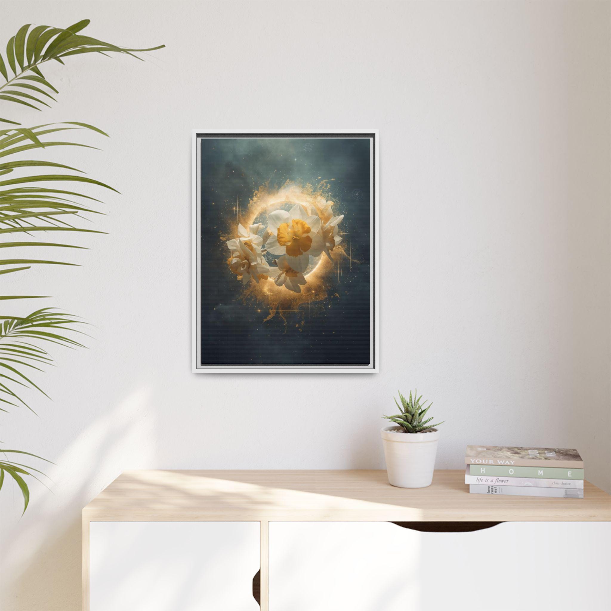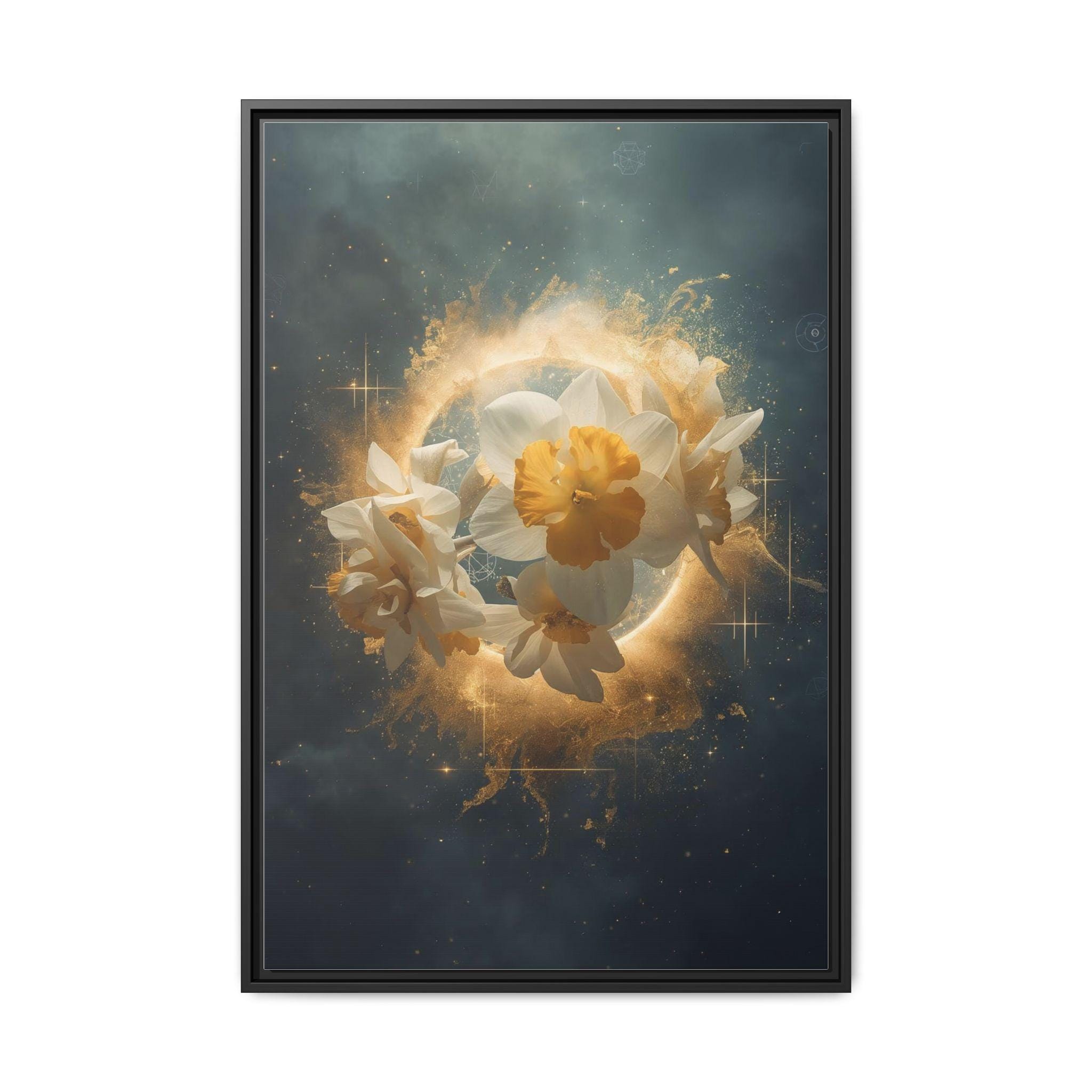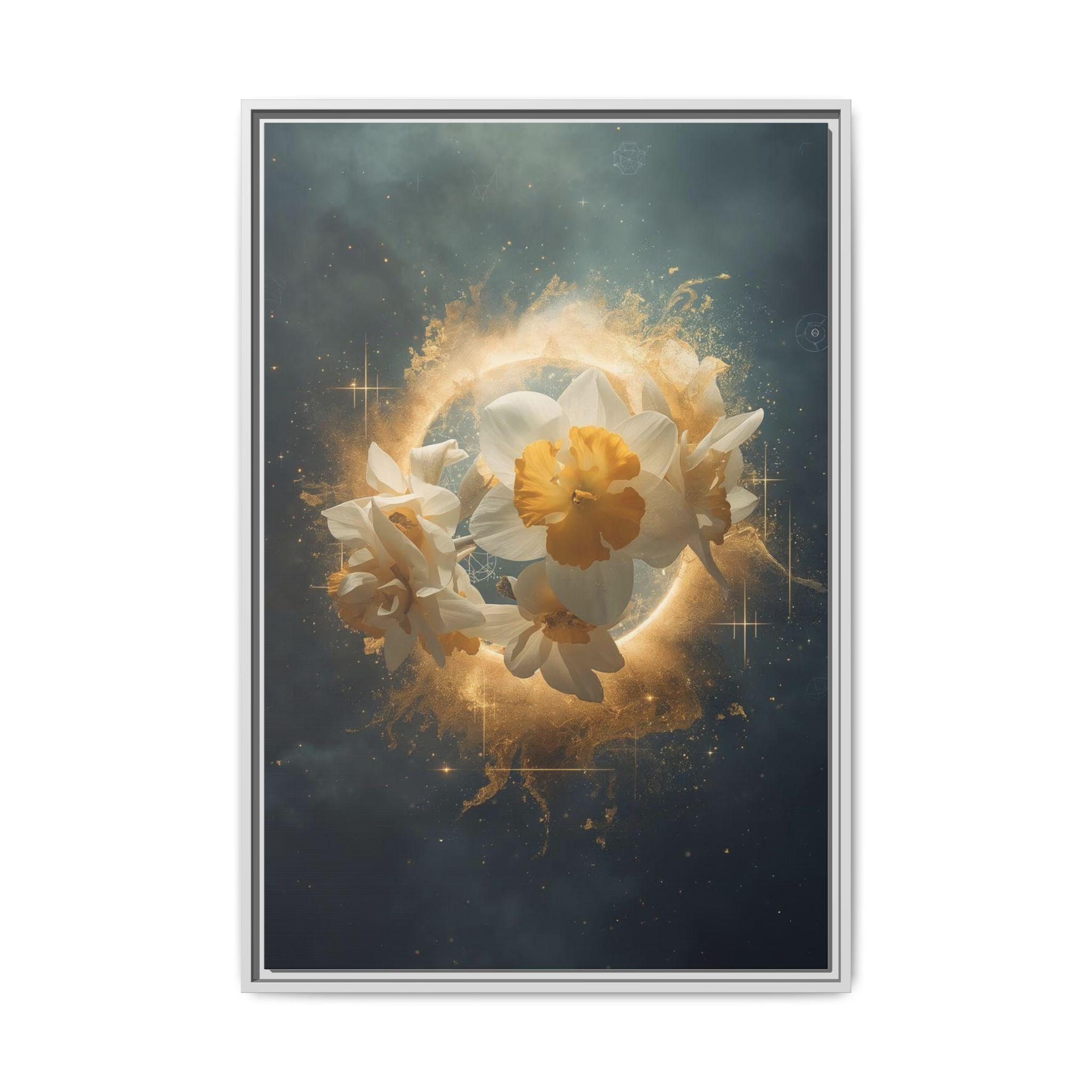 Step into a world where nature meets the divine. The Cosmic Narcissus is not just a floral print; it is a surreal masterpiece from our Aura Prime Studio collection, designed to transform your space into a high-end sanctuary. Featuring ethereal Fulya (Narcissus) blooms emerging from a golden celestial halo, this artpiece symbolizes rebirth, mystery, and elegance.