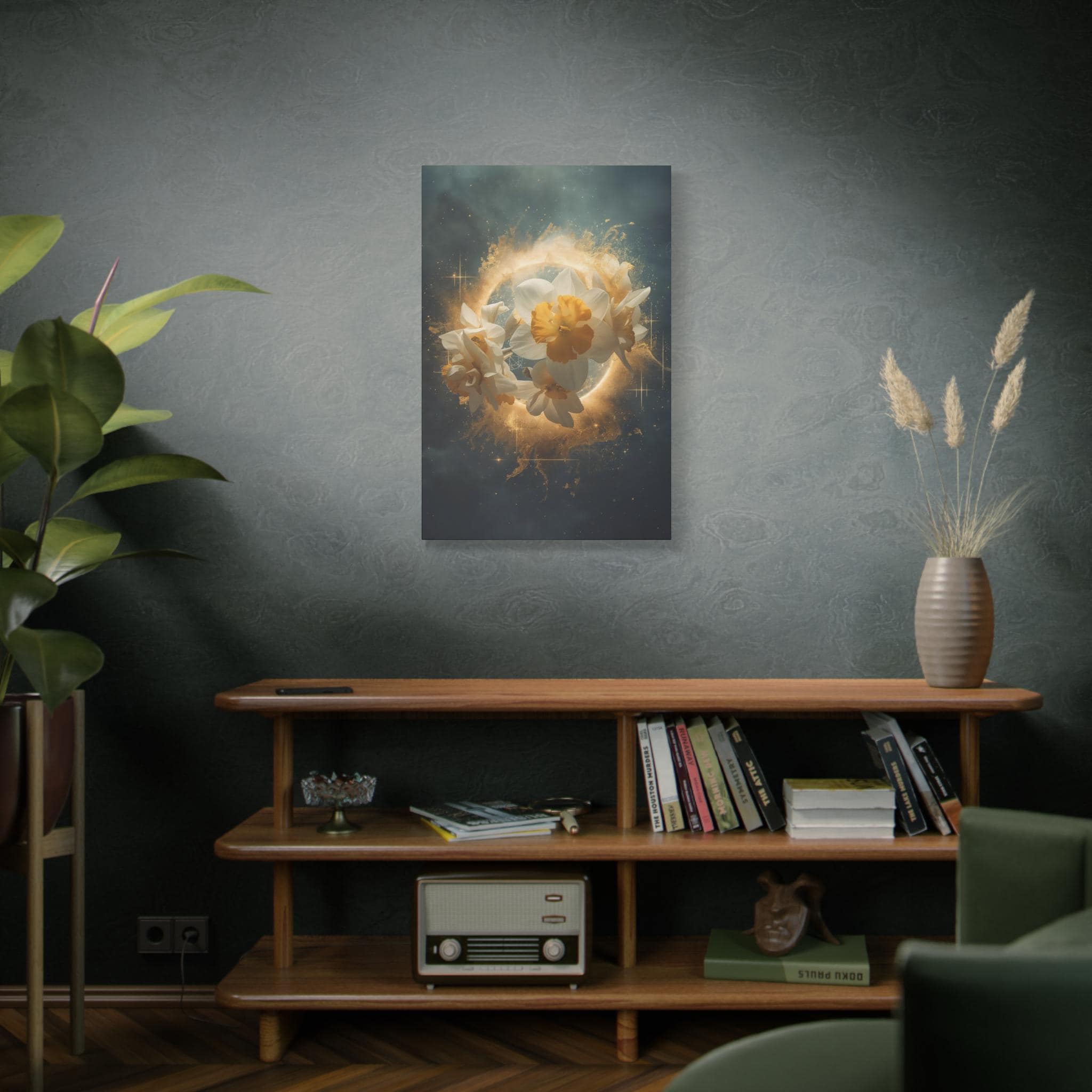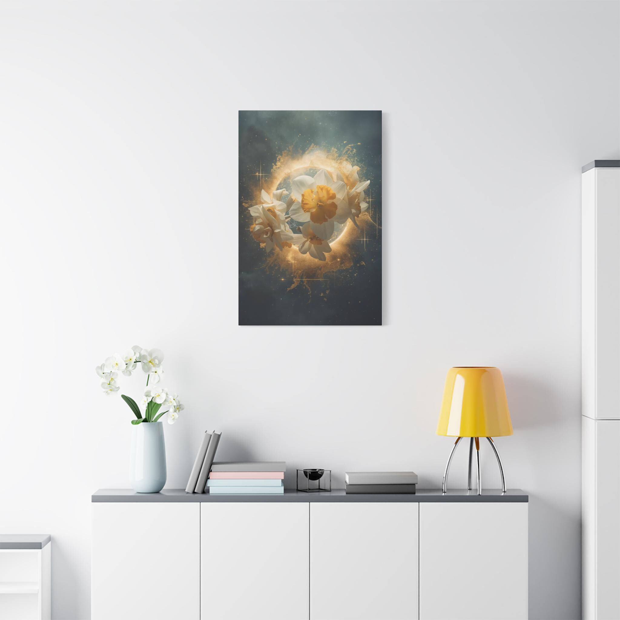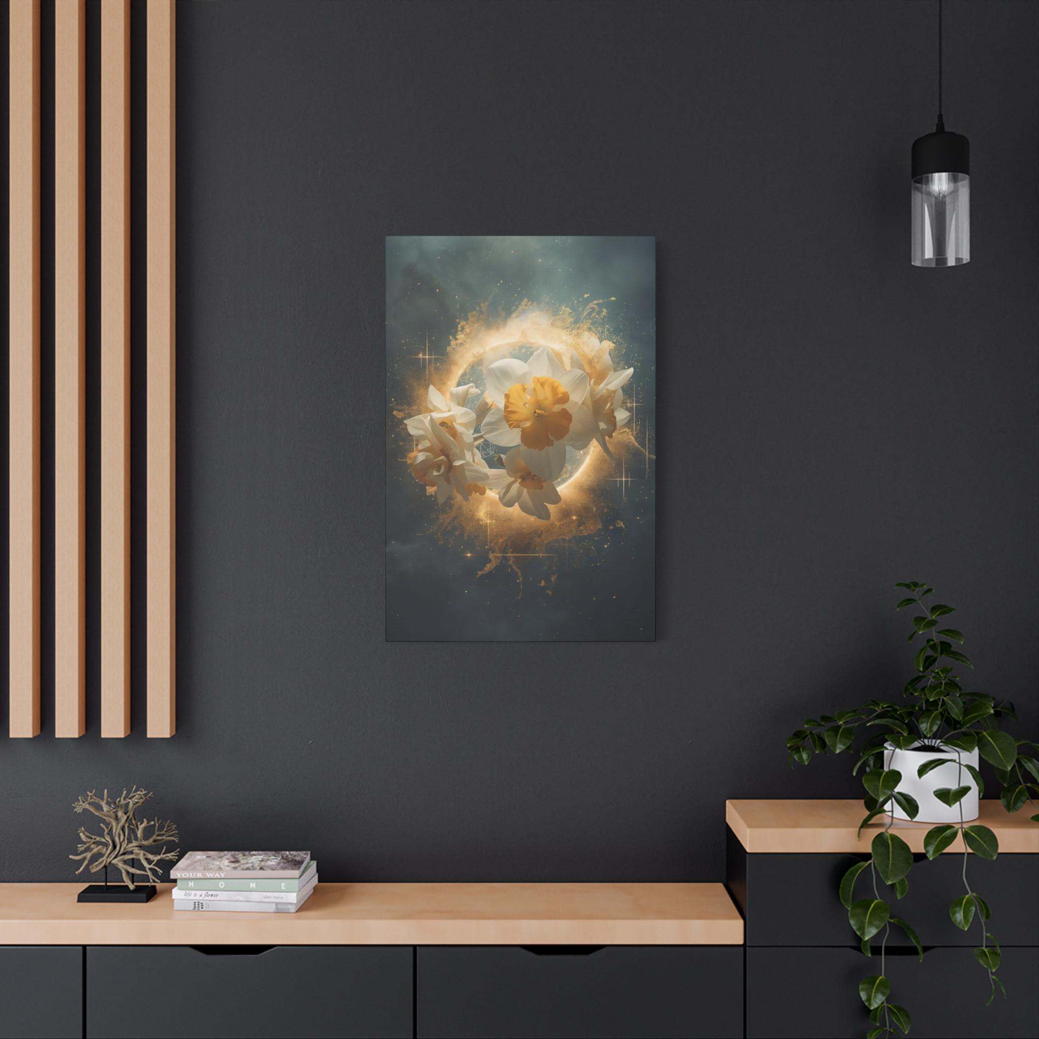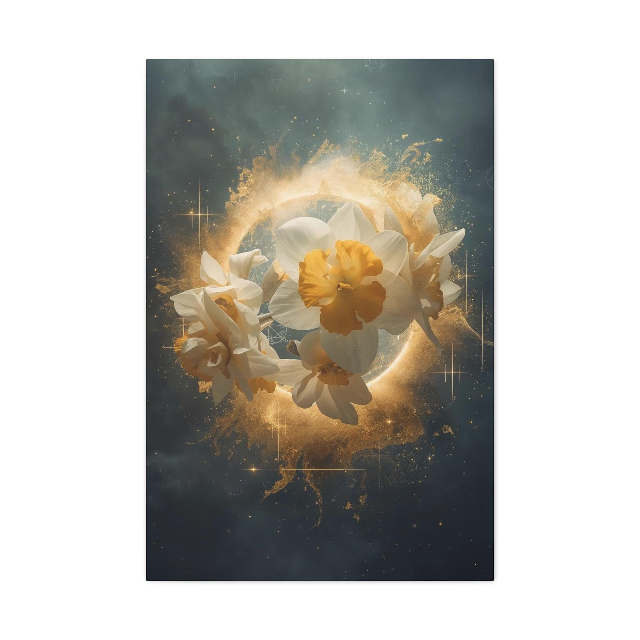 Step into a world where nature meets the divine. The Cosmic Narcissus is not just a floral print; it is a surreal masterpiece from our Aura Prime Studio collection, designed to transform your space into a high-end sanctuary. Featuring ethereal Fulya (Narcissus) blooms emerging from a golden celestial halo, this artpiece symbolizes rebirth, mystery, and elegance