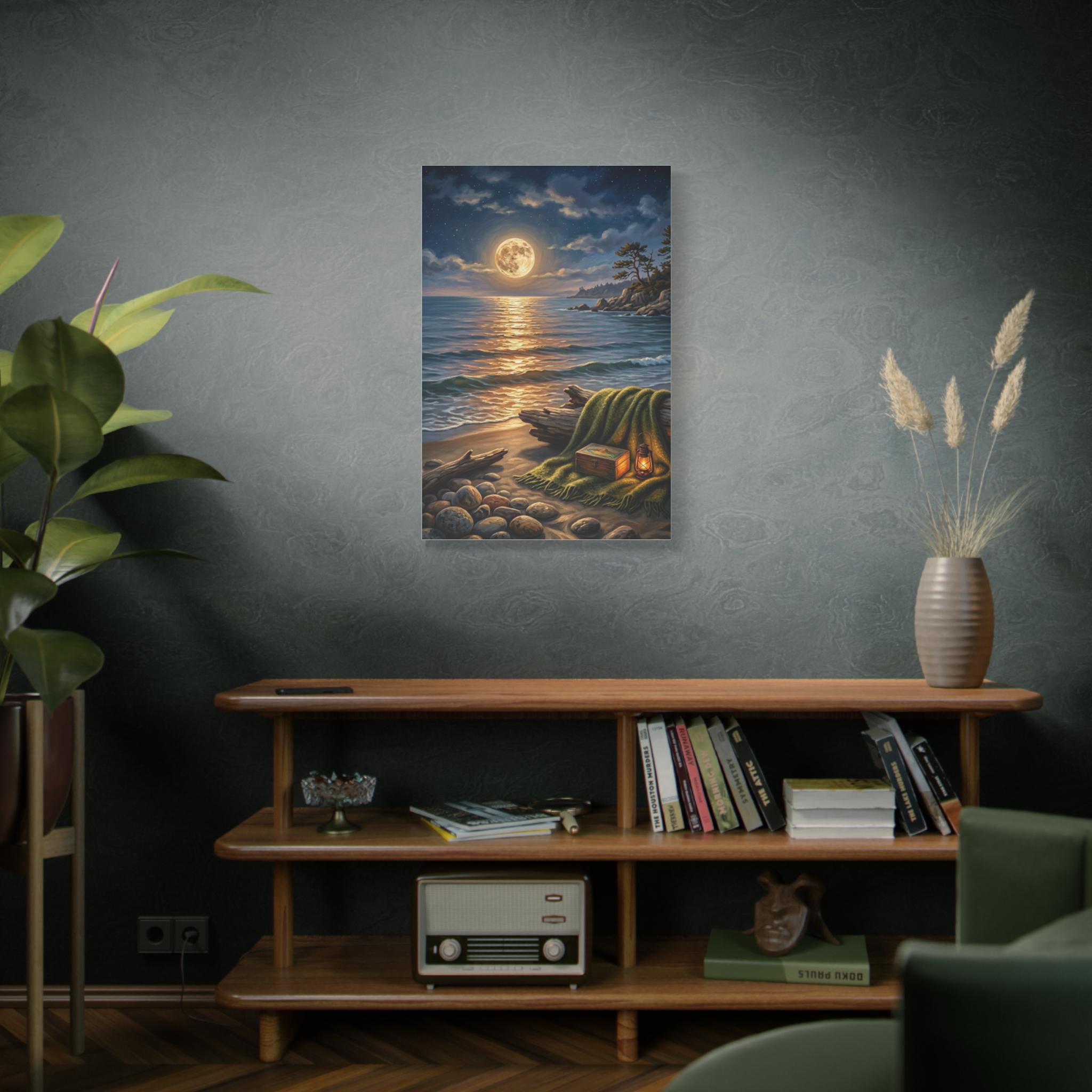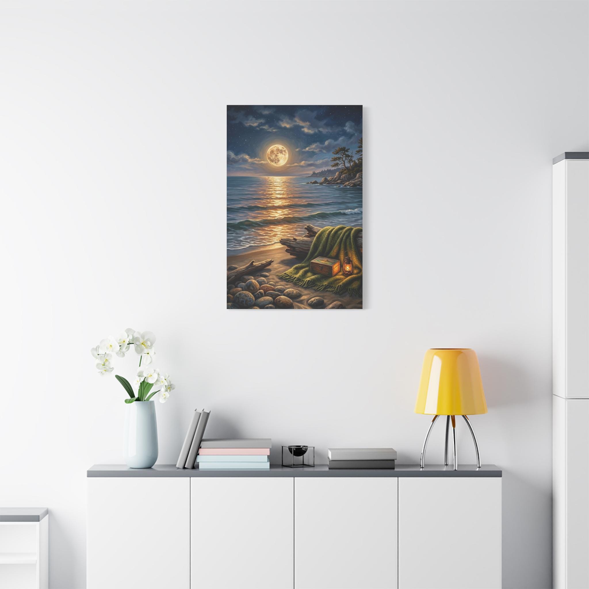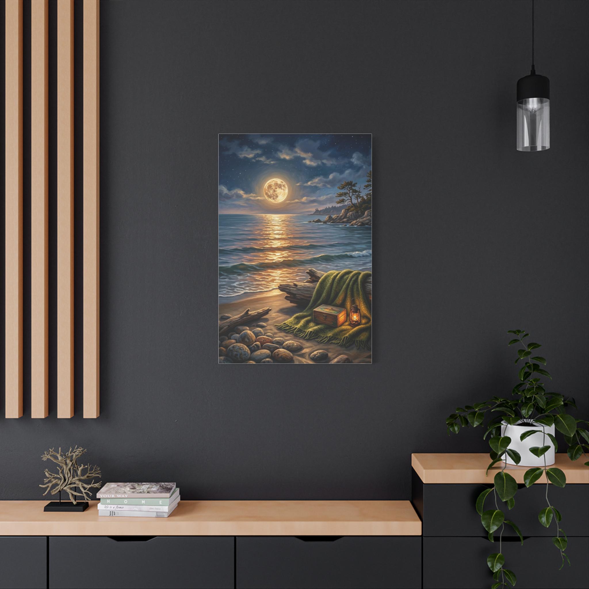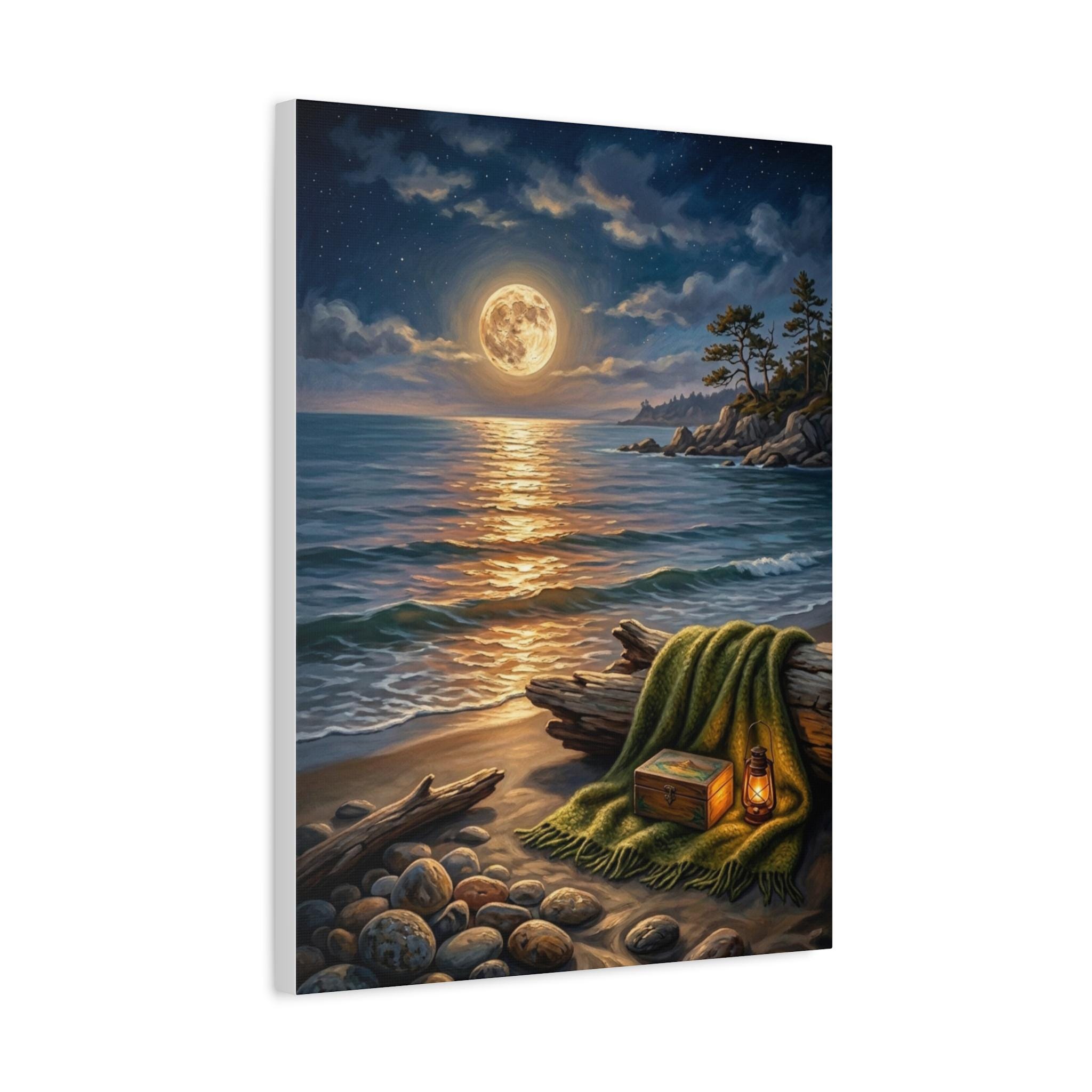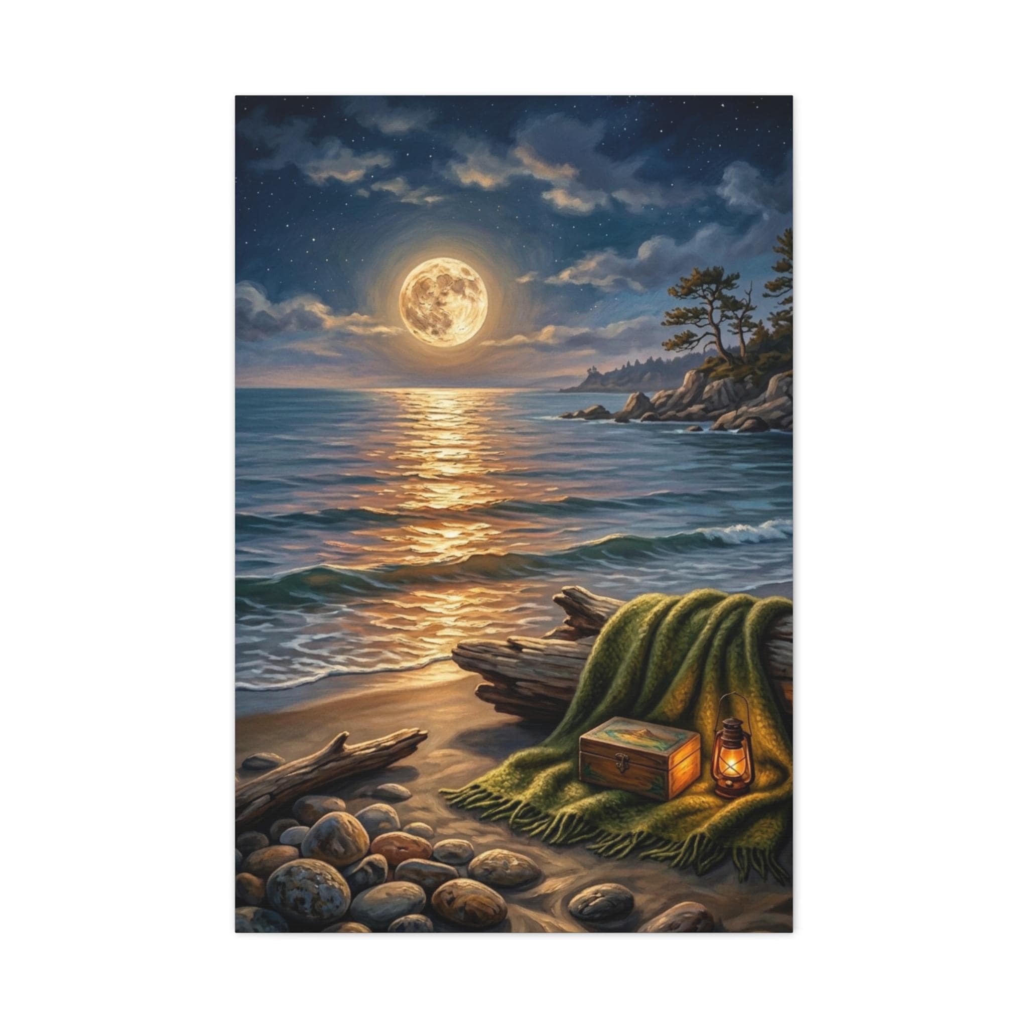 This stunning piece captures the magical moment where the golden glow of a full moon meets the rhythmic waves of the ocean. With its warm lantern light and cozy blanket setting on the shore, this artwork invites a sense of deep calm and romantic serenity into any room. It is the perfect blend of rustic charm and dreamy coastal aesthetics.
