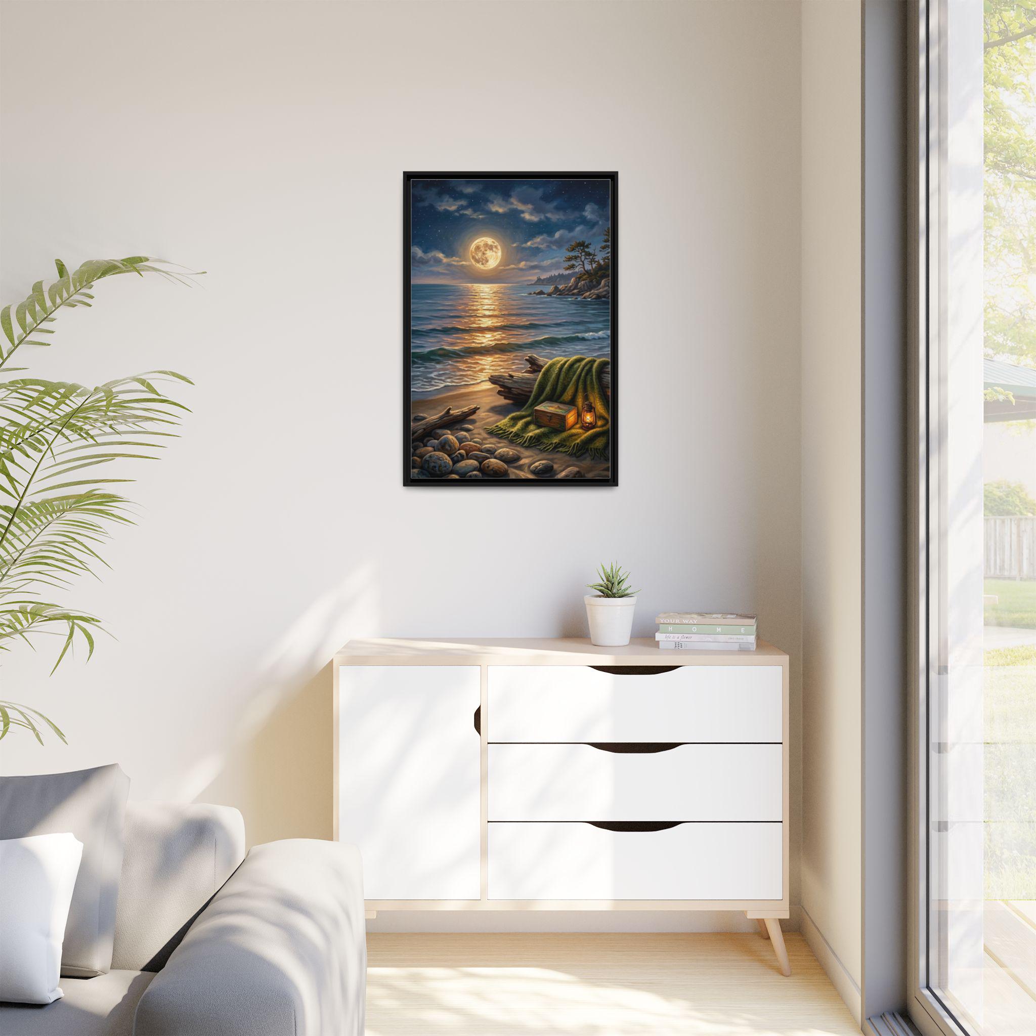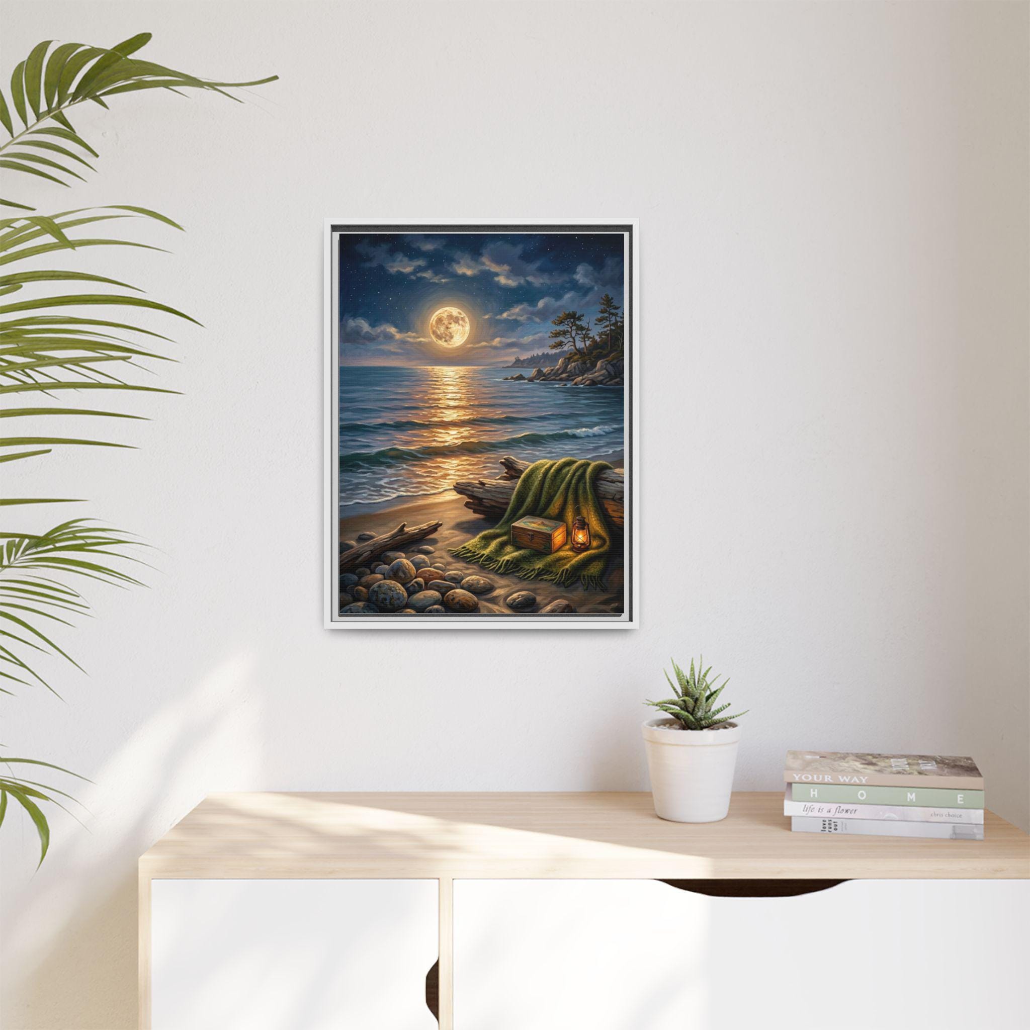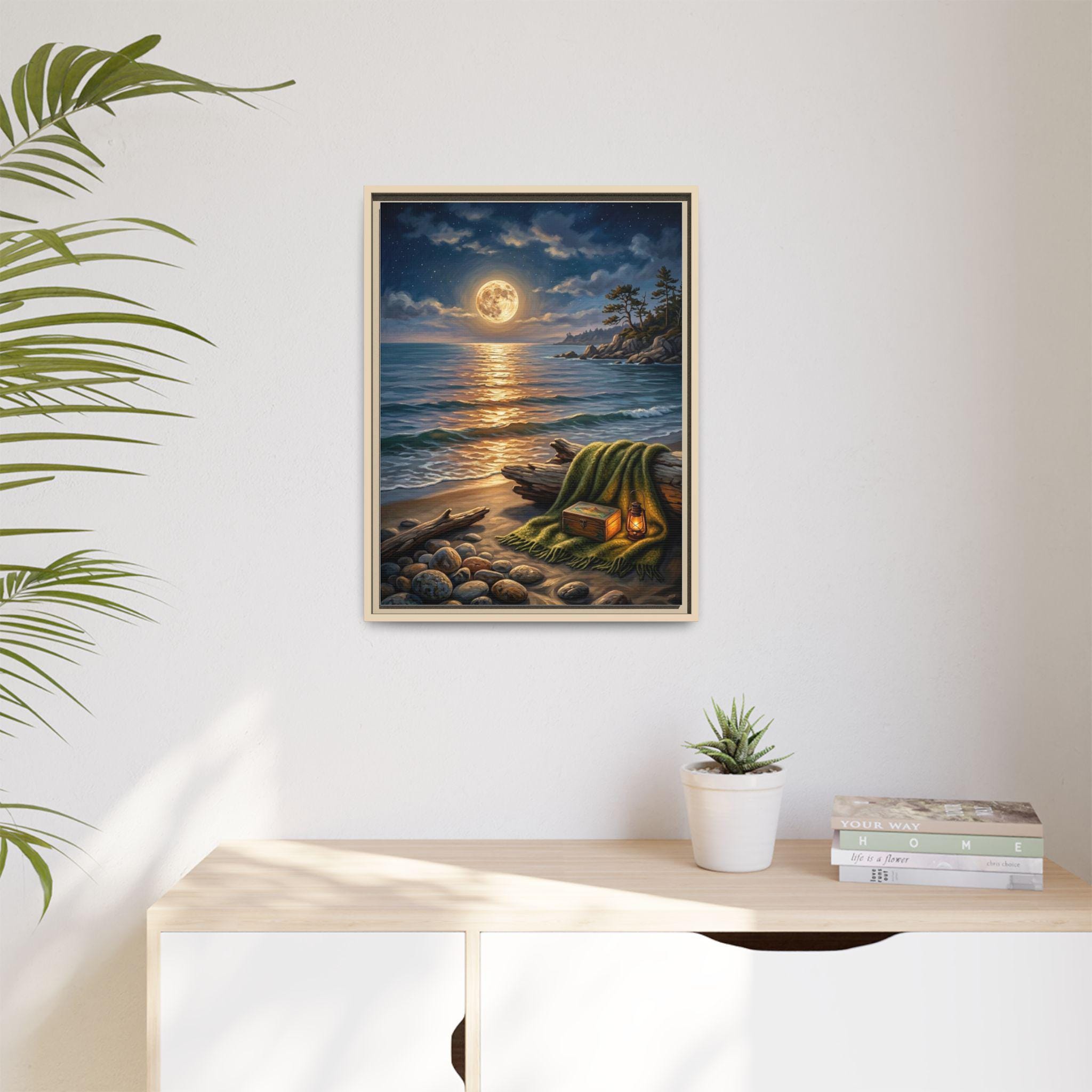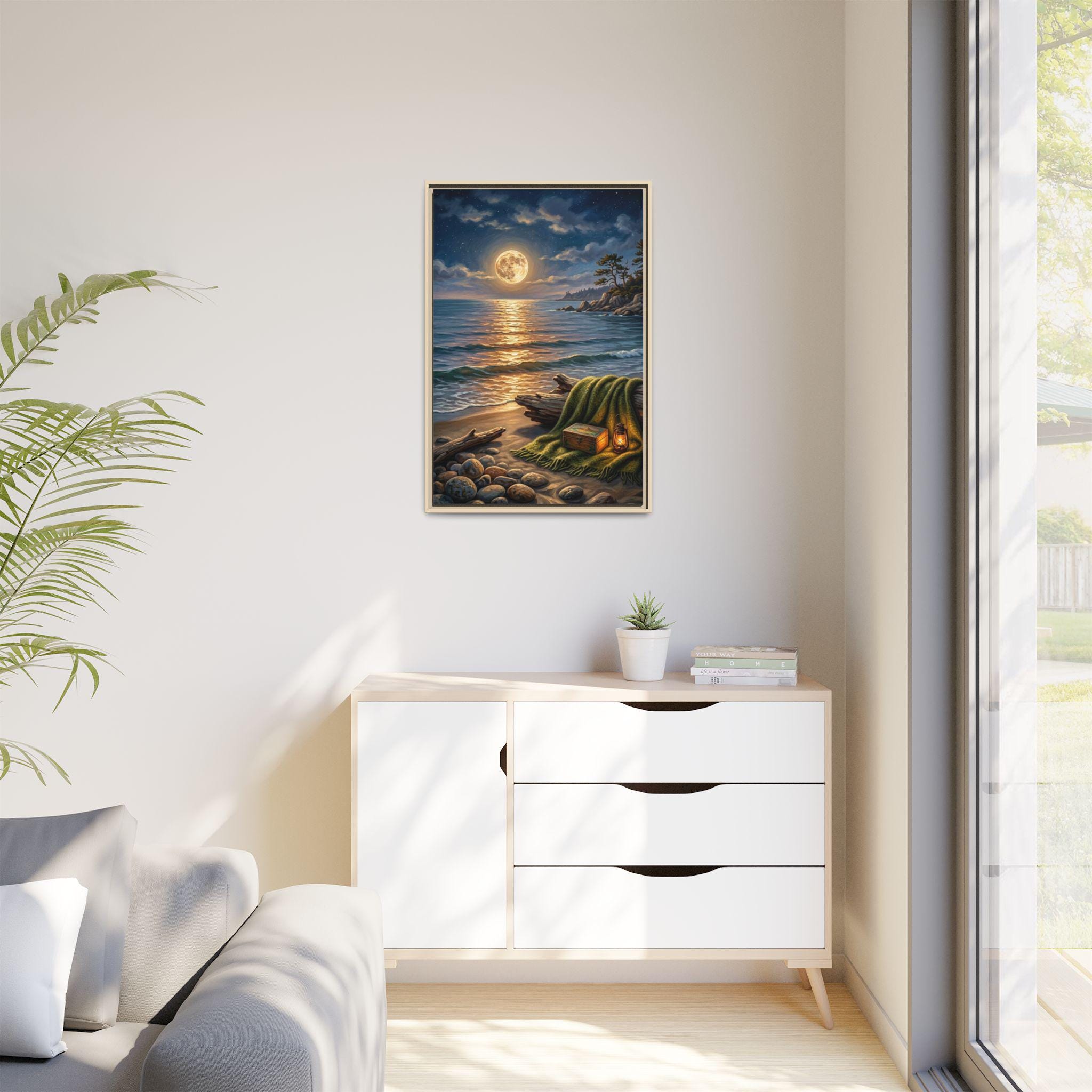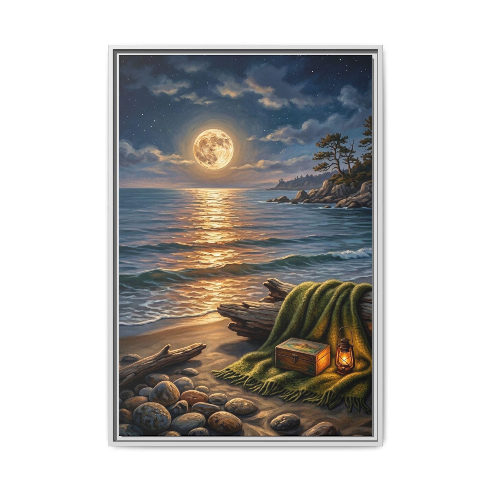 This stunning piece captures the magical moment where the golden glow of a full moon meets the rhythmic waves of the ocean. With its warm lantern light and cozy blanket setting on the shore, this artwork invites a sense of deep calm and romantic serenity into any room. It is the perfect blend of rustic charm and dreamy coastal aesthetics.